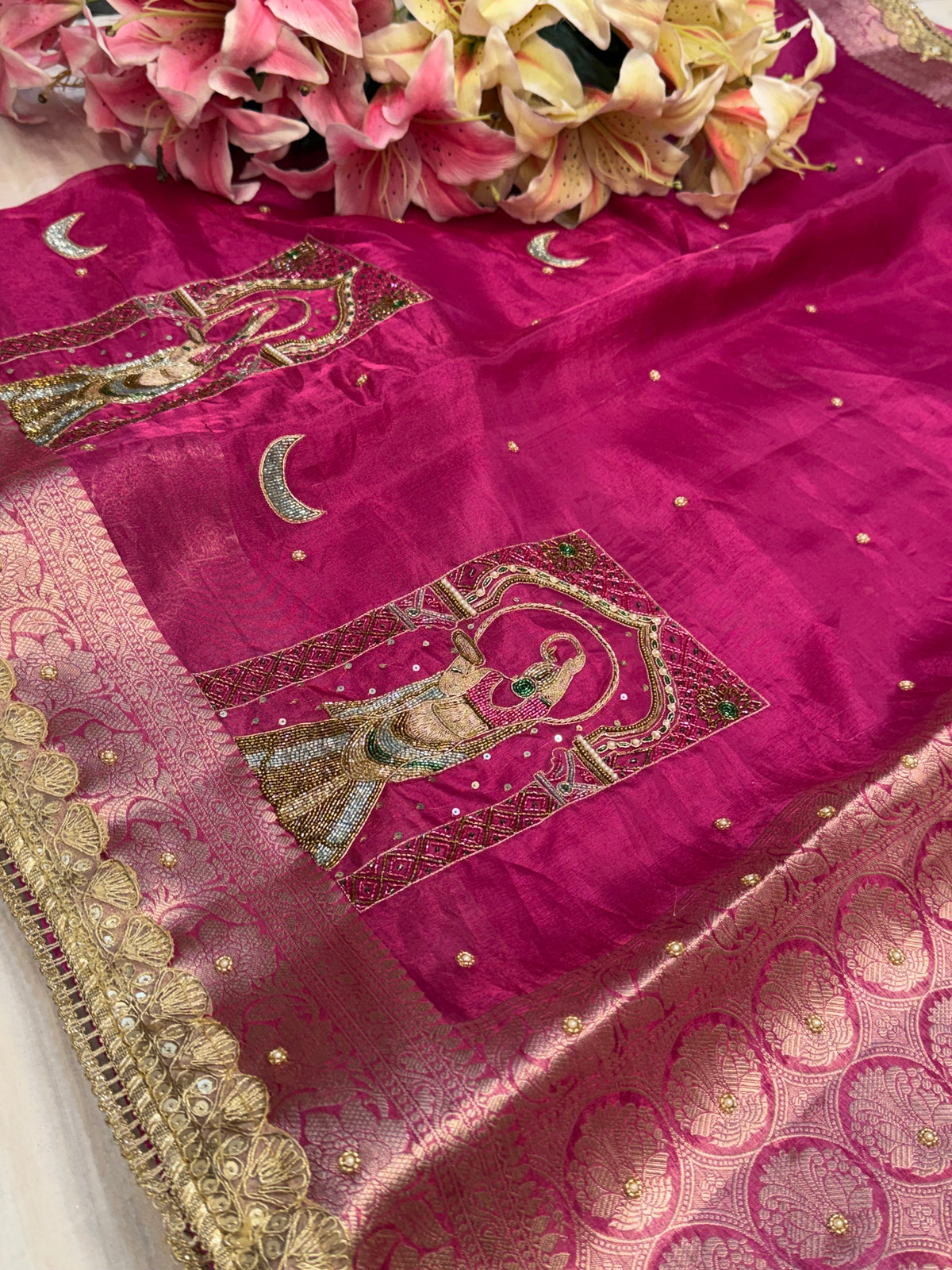 Karwachauth special - Hot metallic pink tissue silk hand embroidered meenakari saree