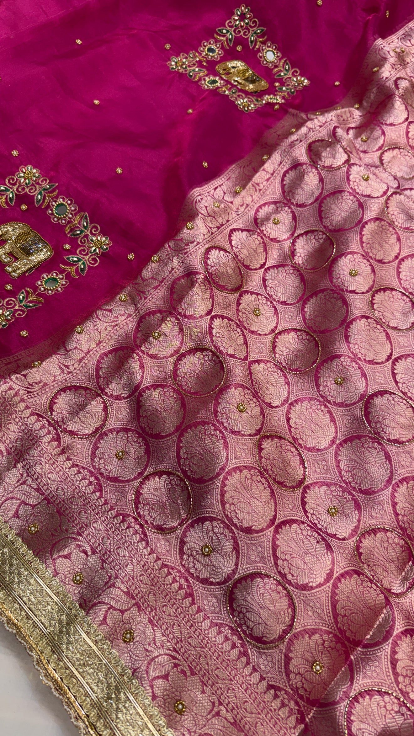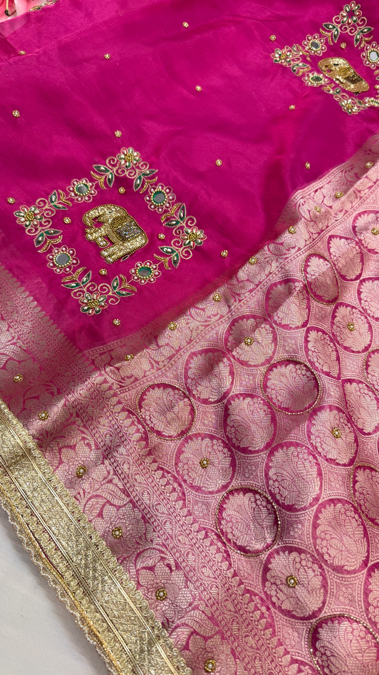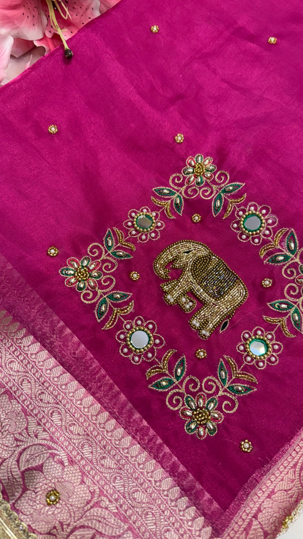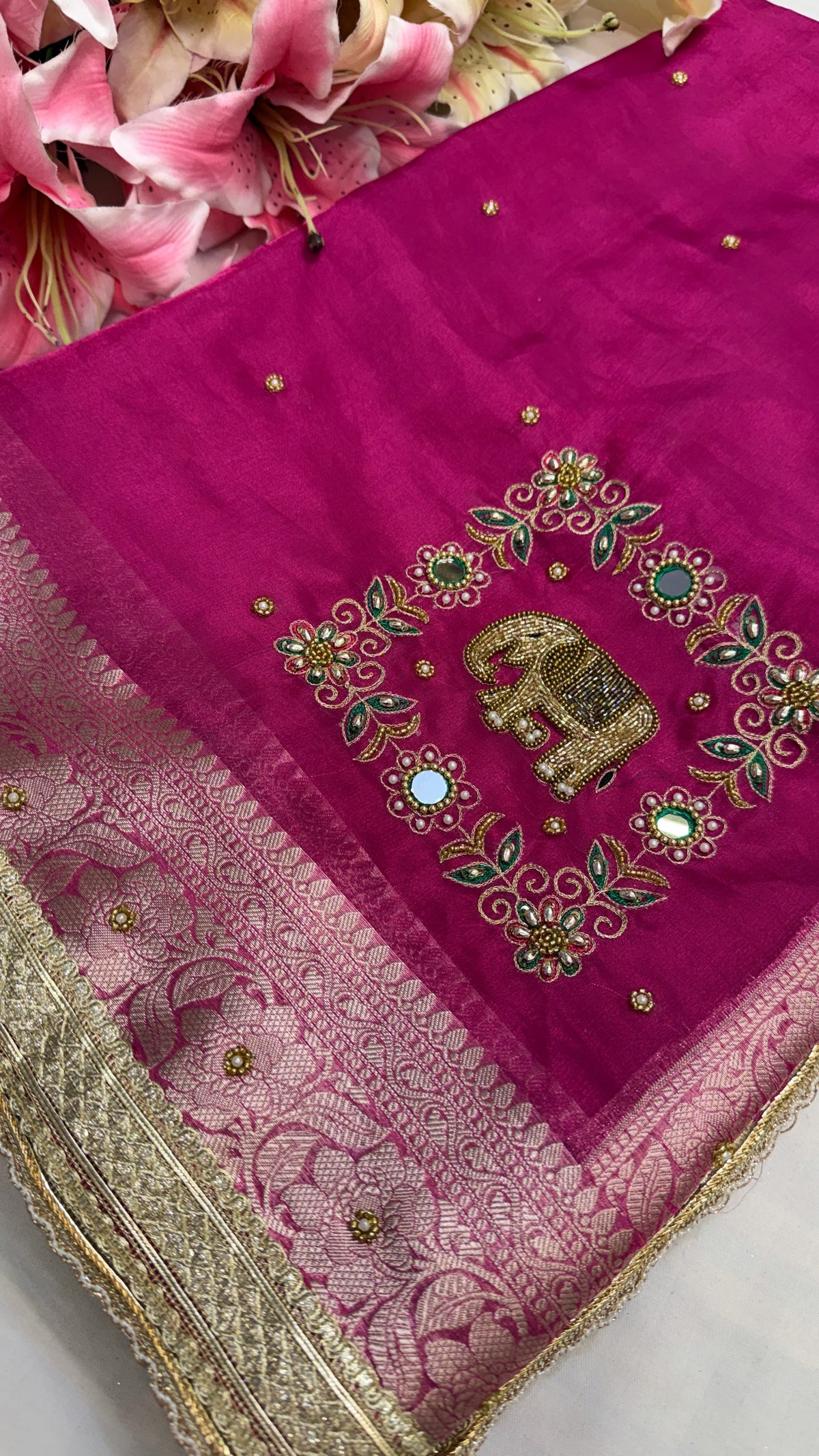 Karwachauth special - Hot pink metallic tissue silk elephant motif hand embroidered saree