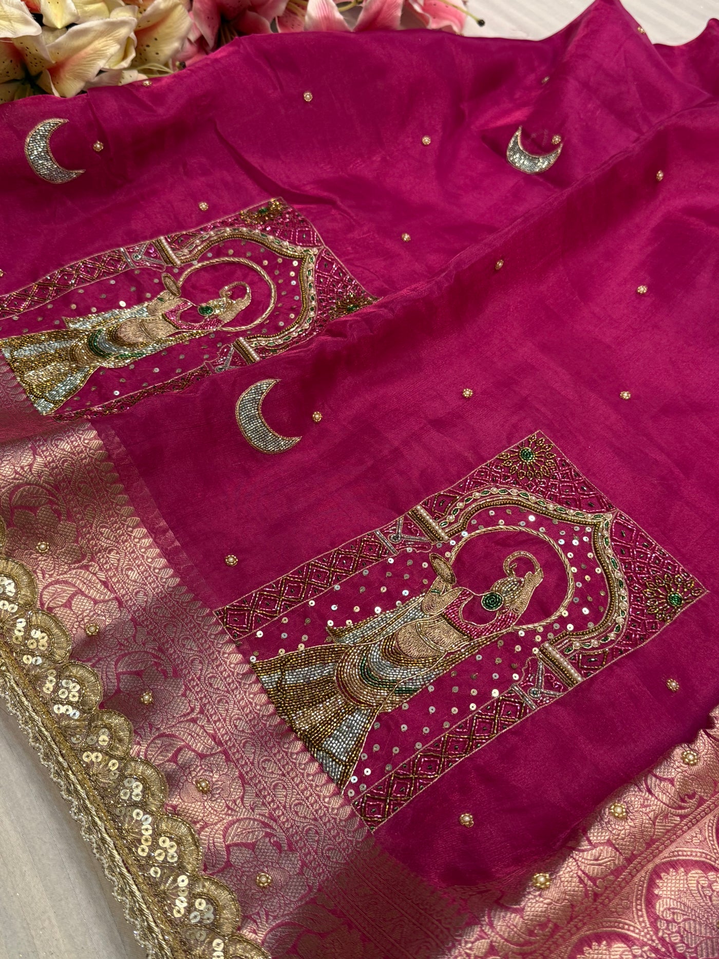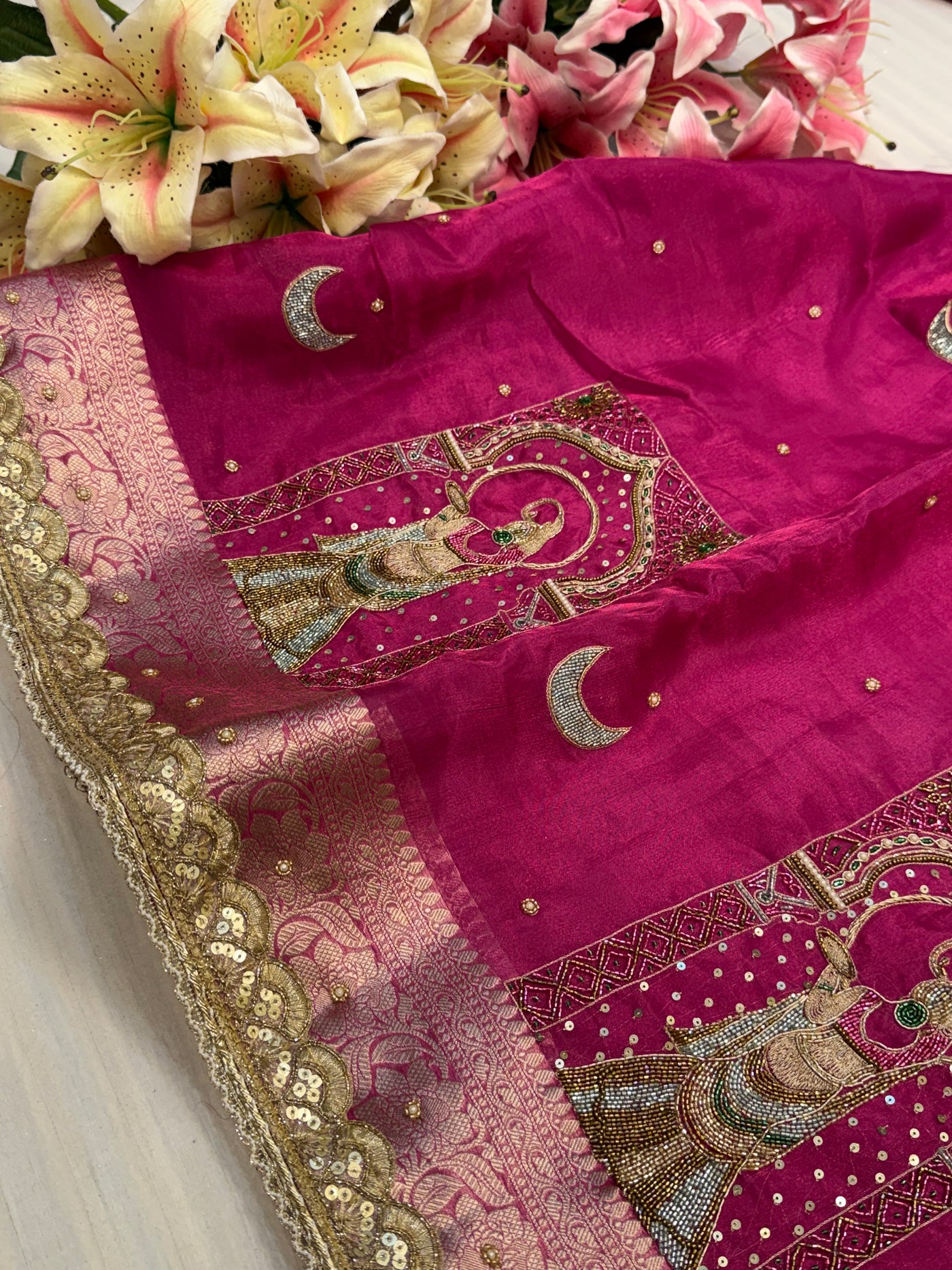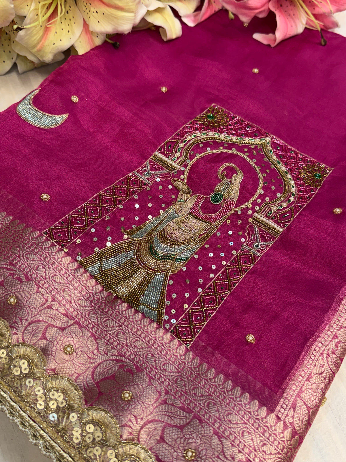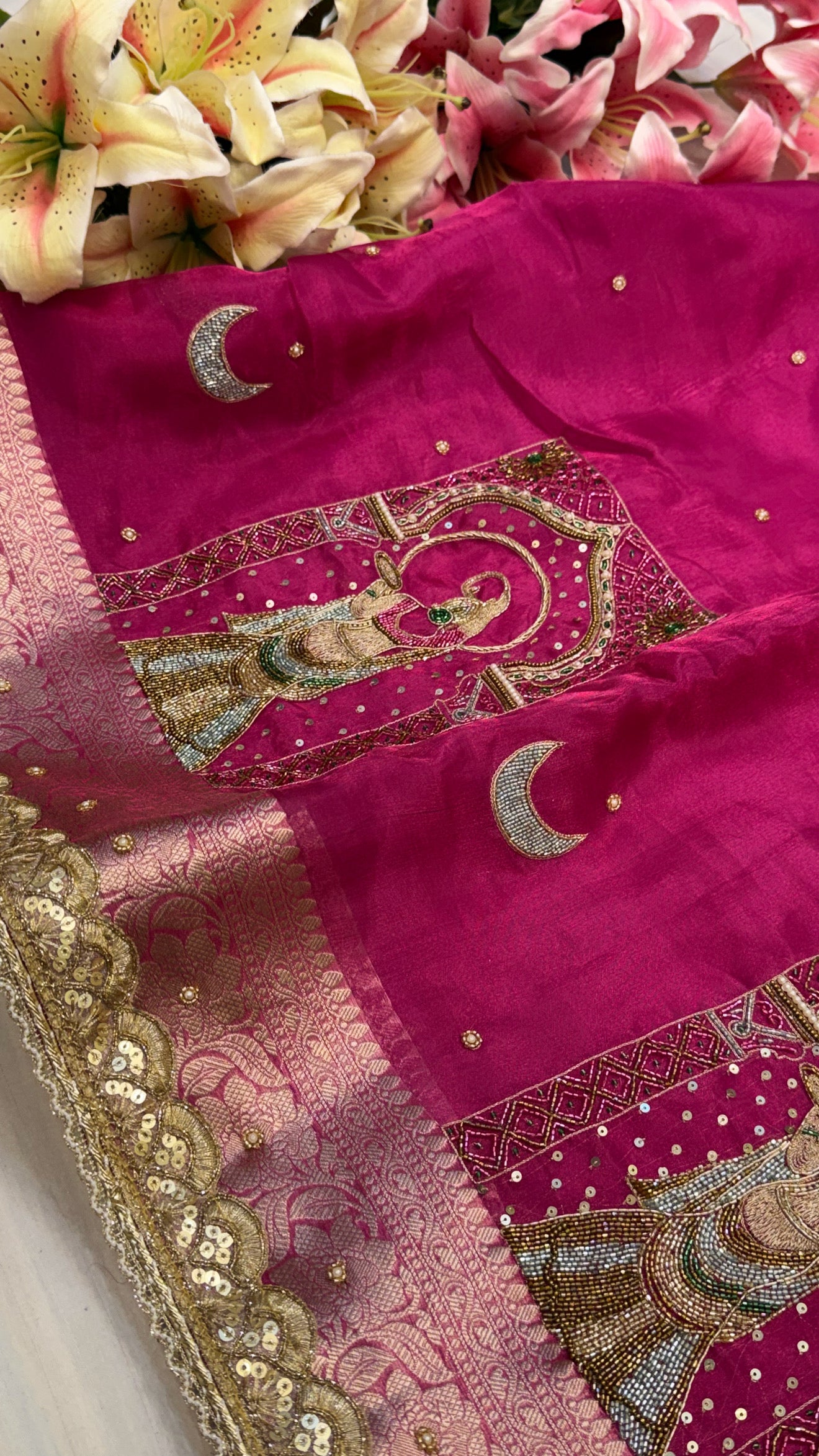Karwachauth special - Hot pink metallic tissue silk hand embroidered saree