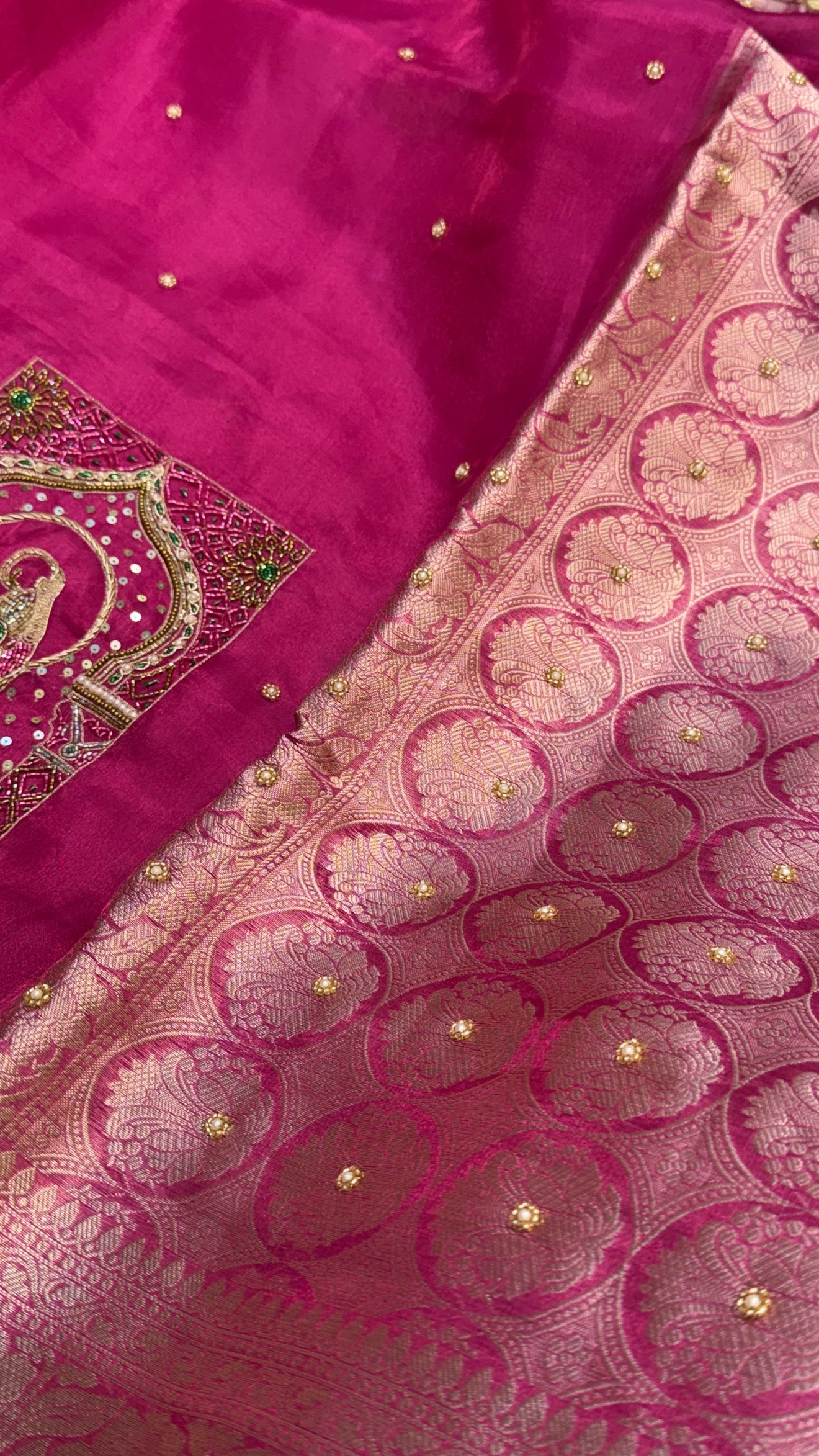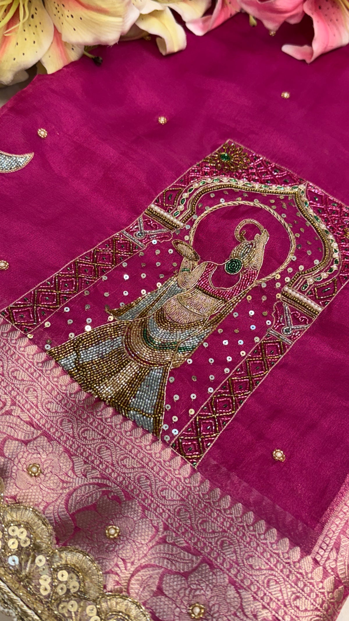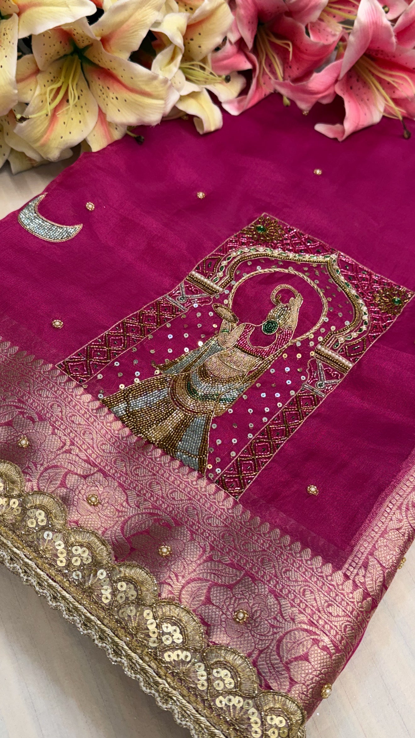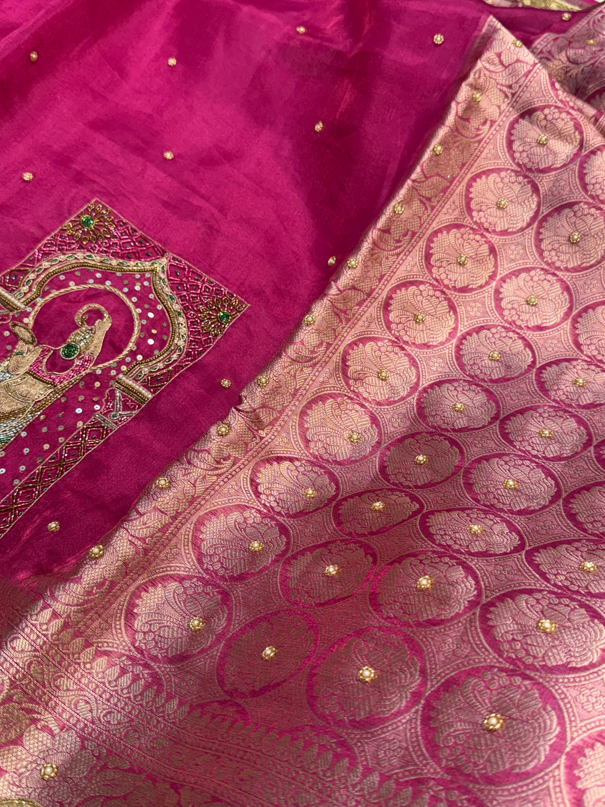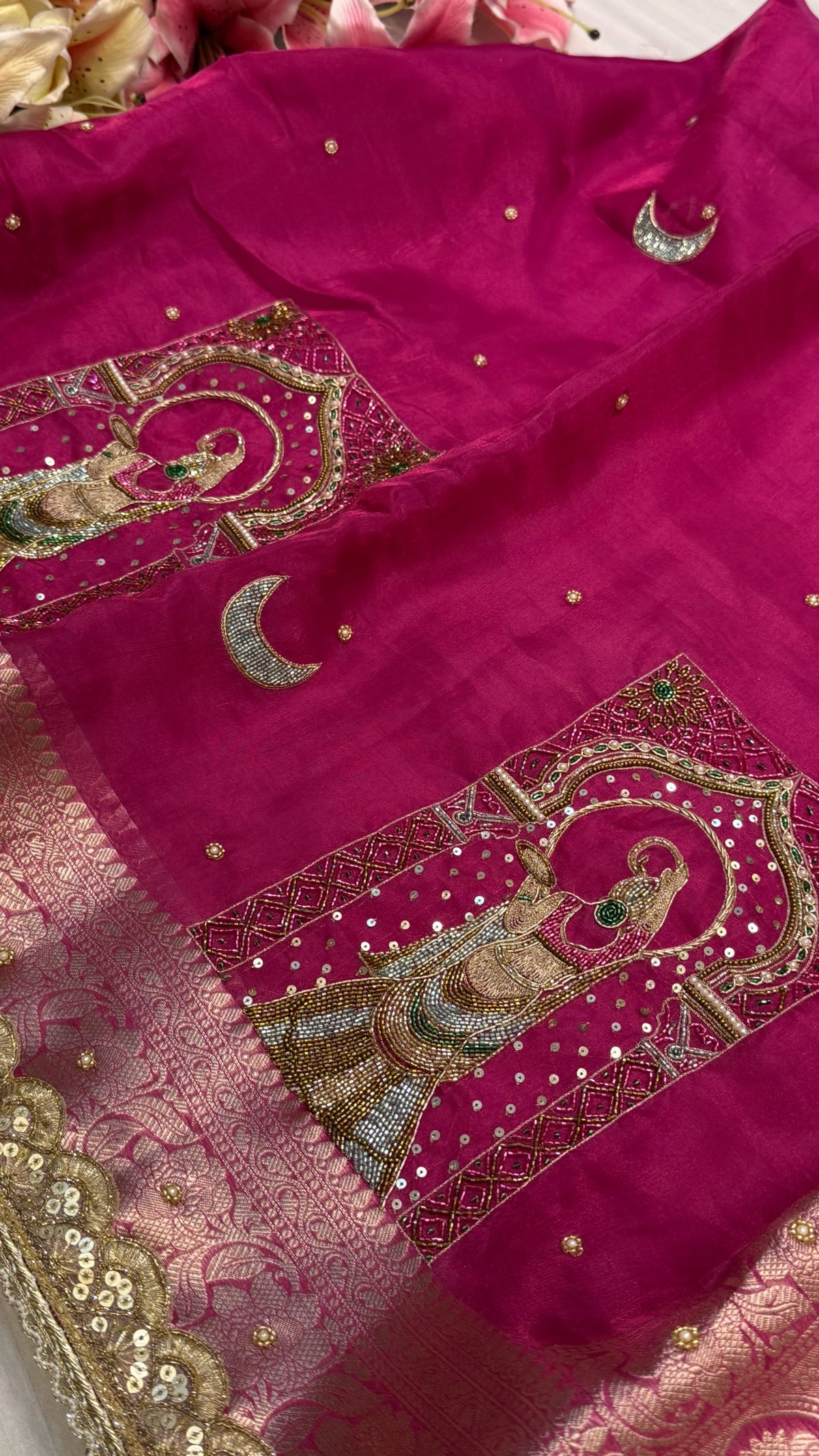 Karwachauth special - Hot pink metallic tissue silk hand embroidered saree