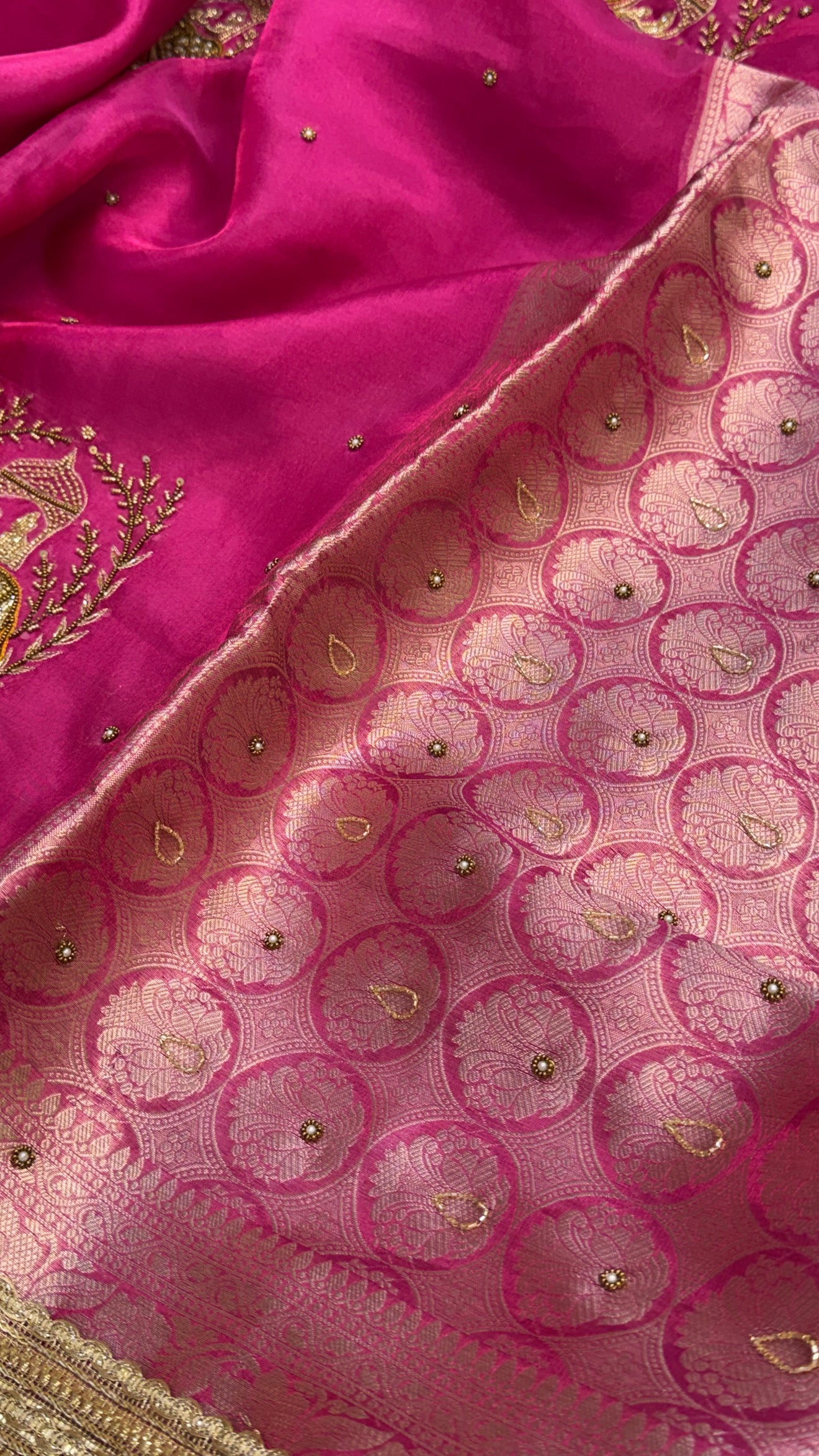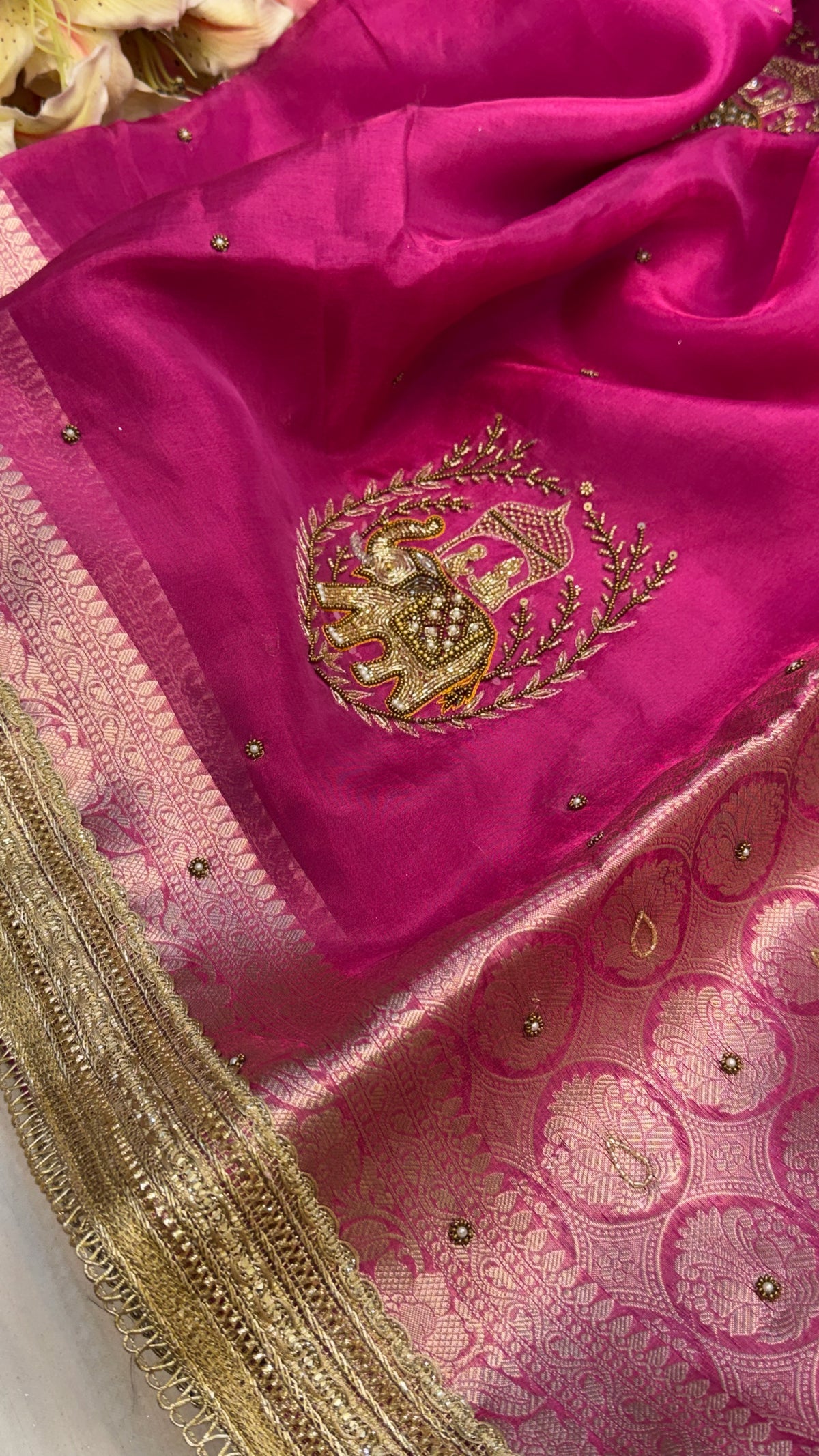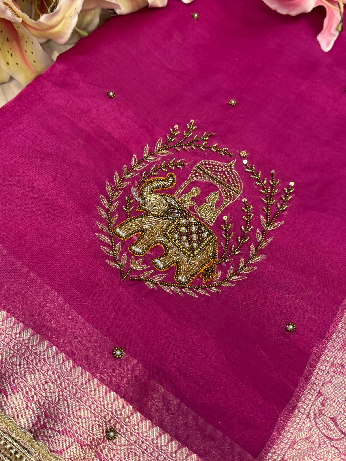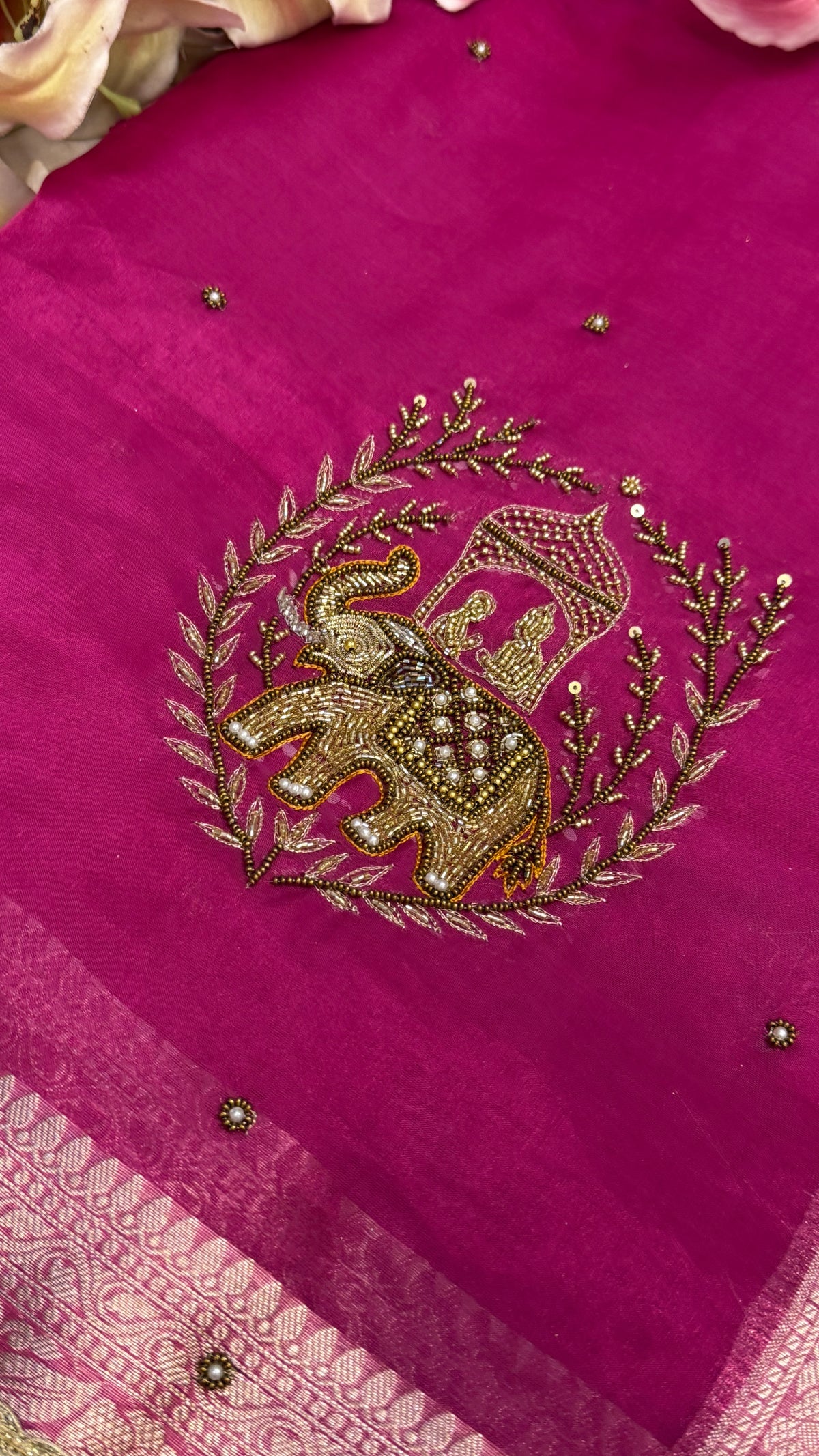 Karwachauth special - Hot pink tissue silk elephant motif hand embroidered kadhwa saree