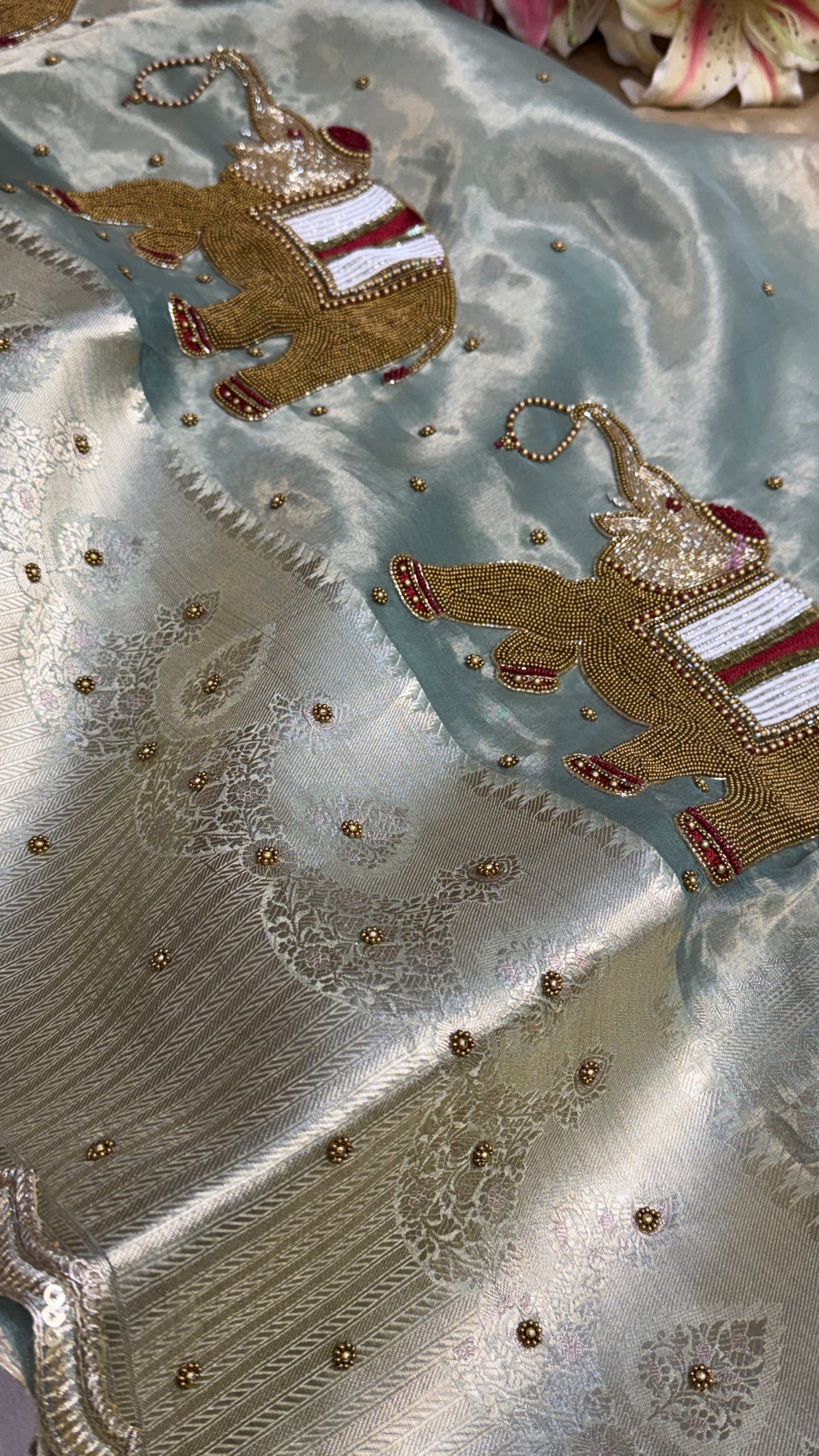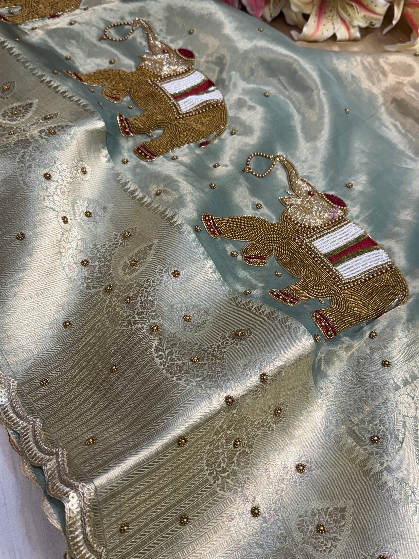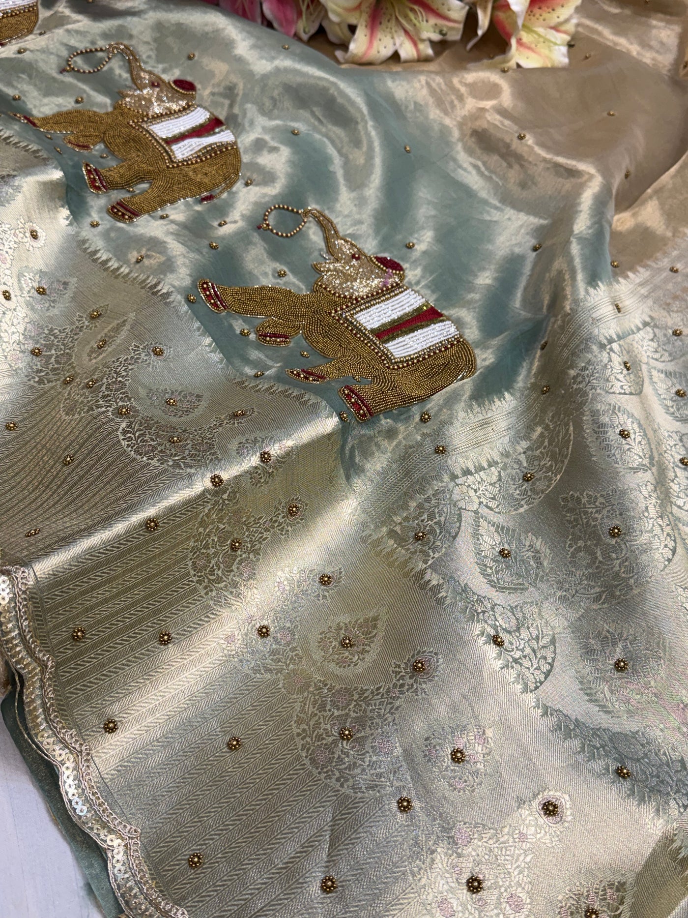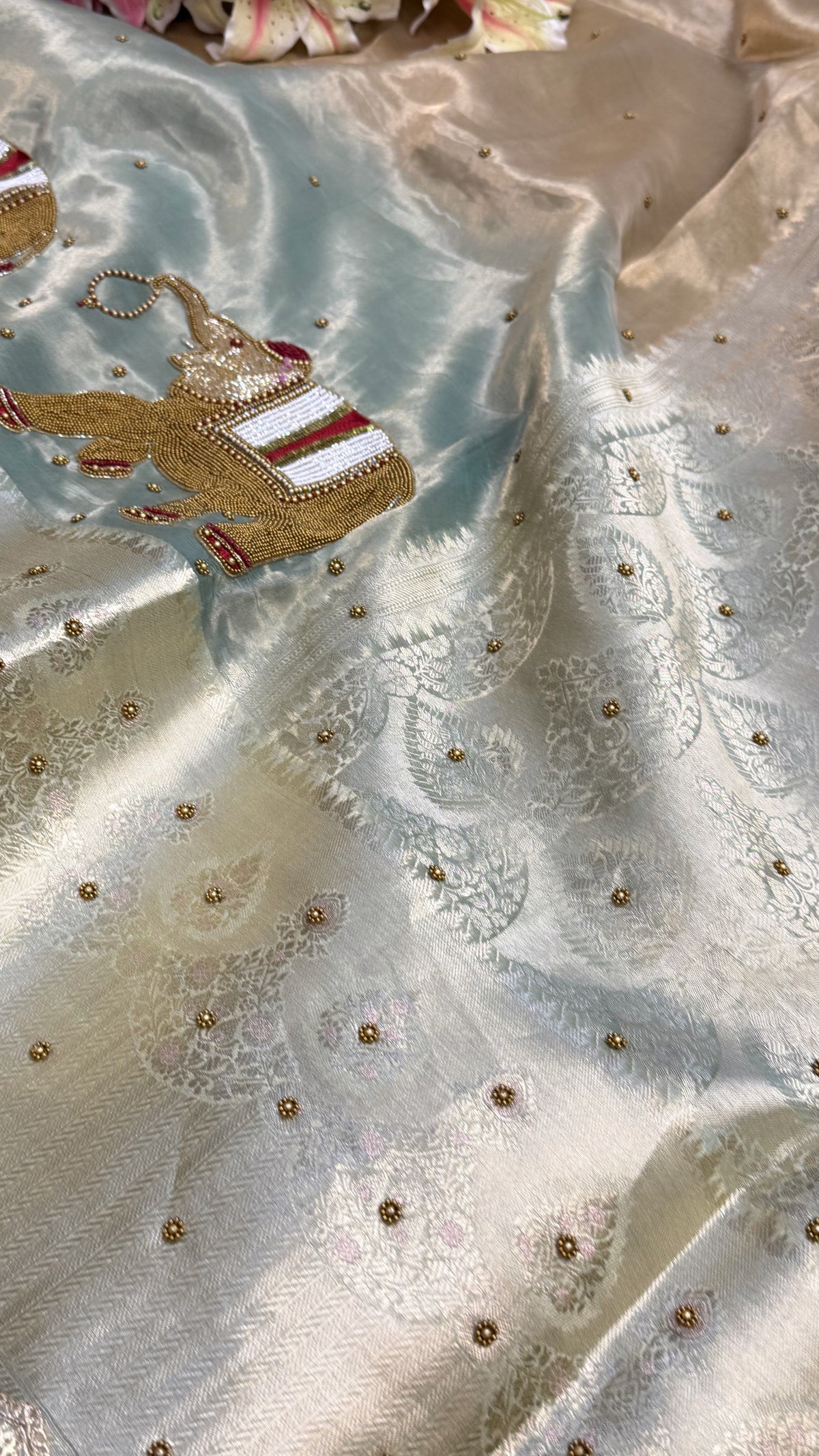 Karwachauth special - Ice blue elephant motif hand embroidered tissue silk saree