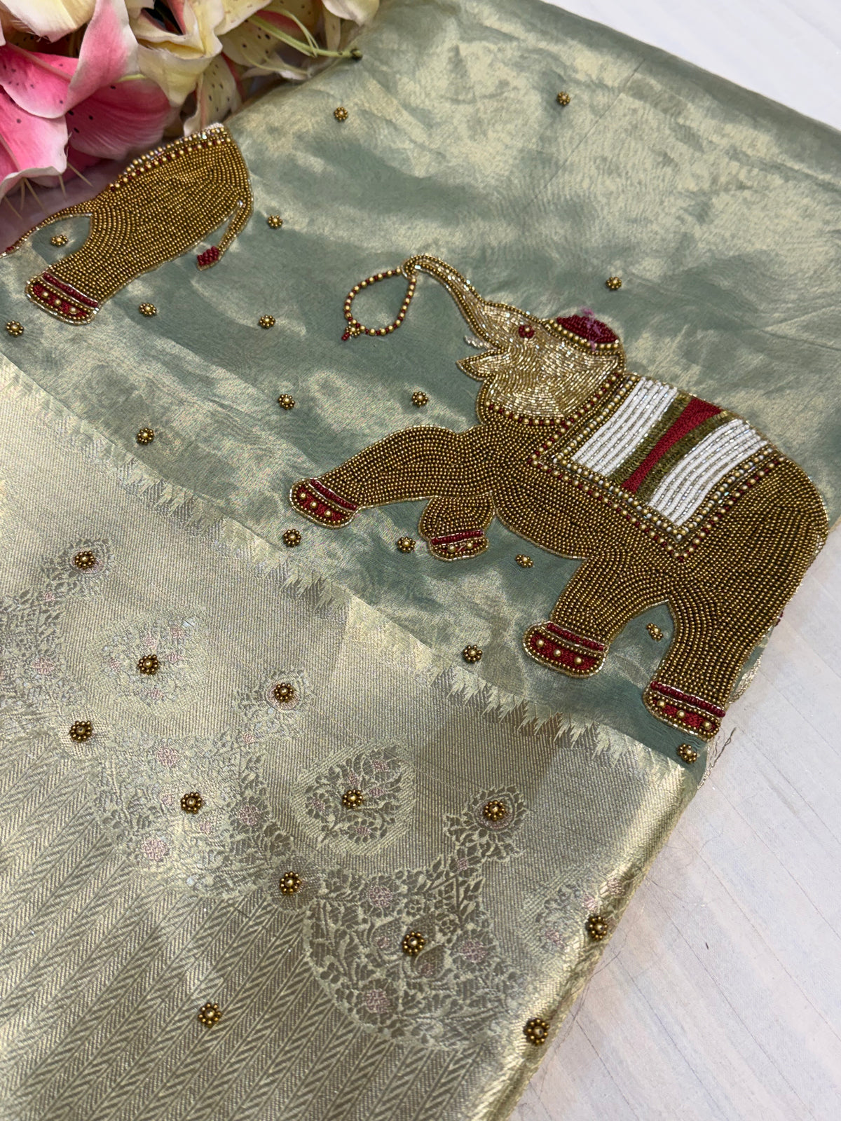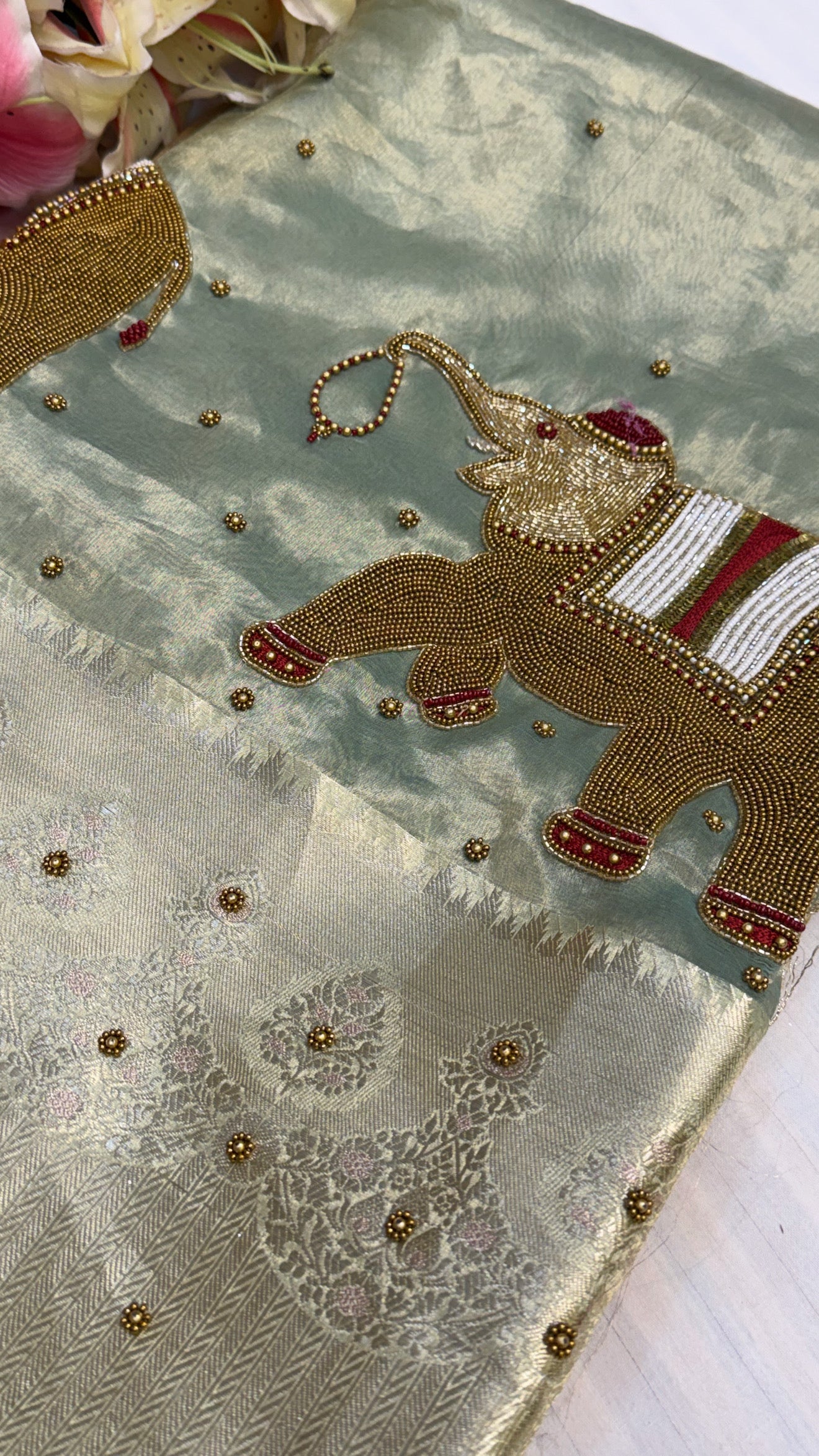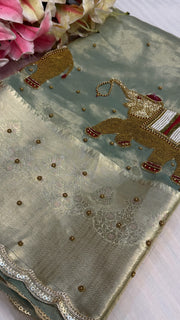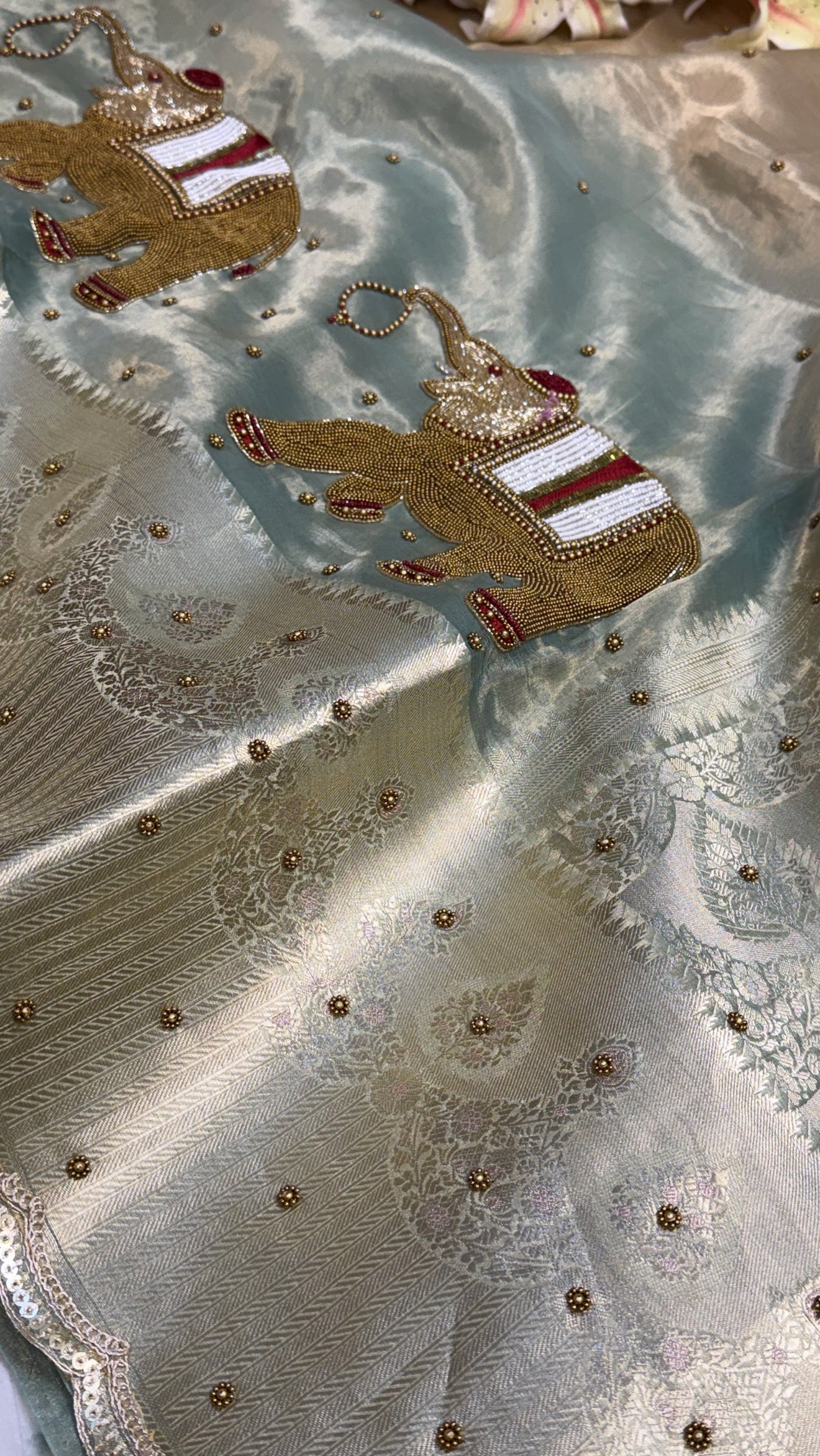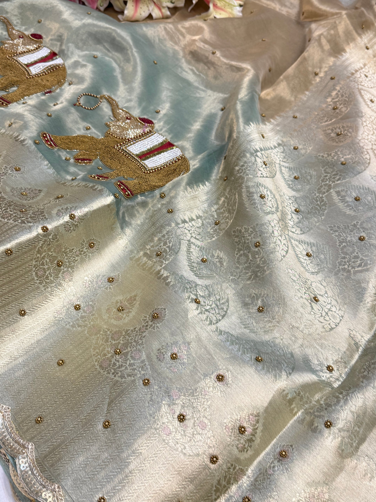 Karwachauth special - Ice blue elephant motif hand embroidered tissue silk saree