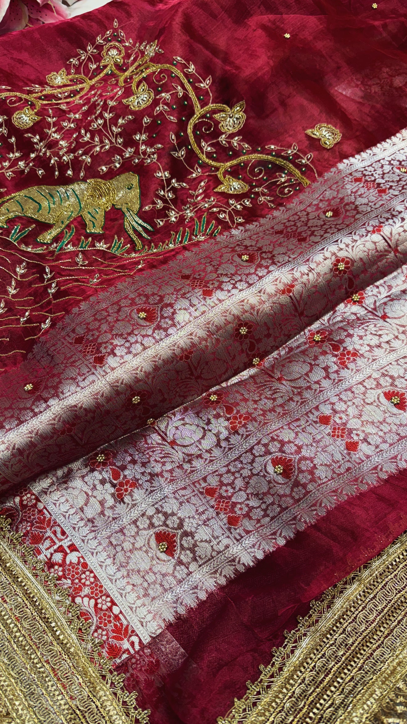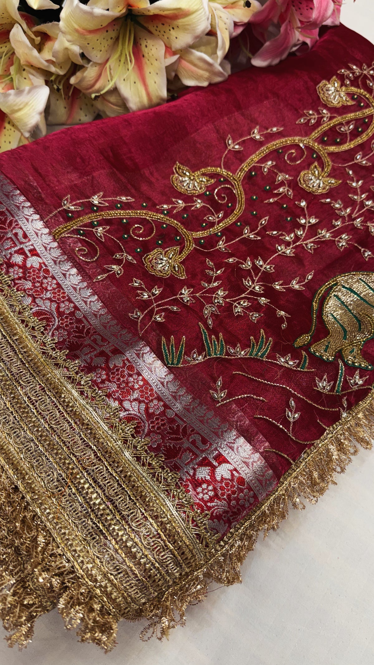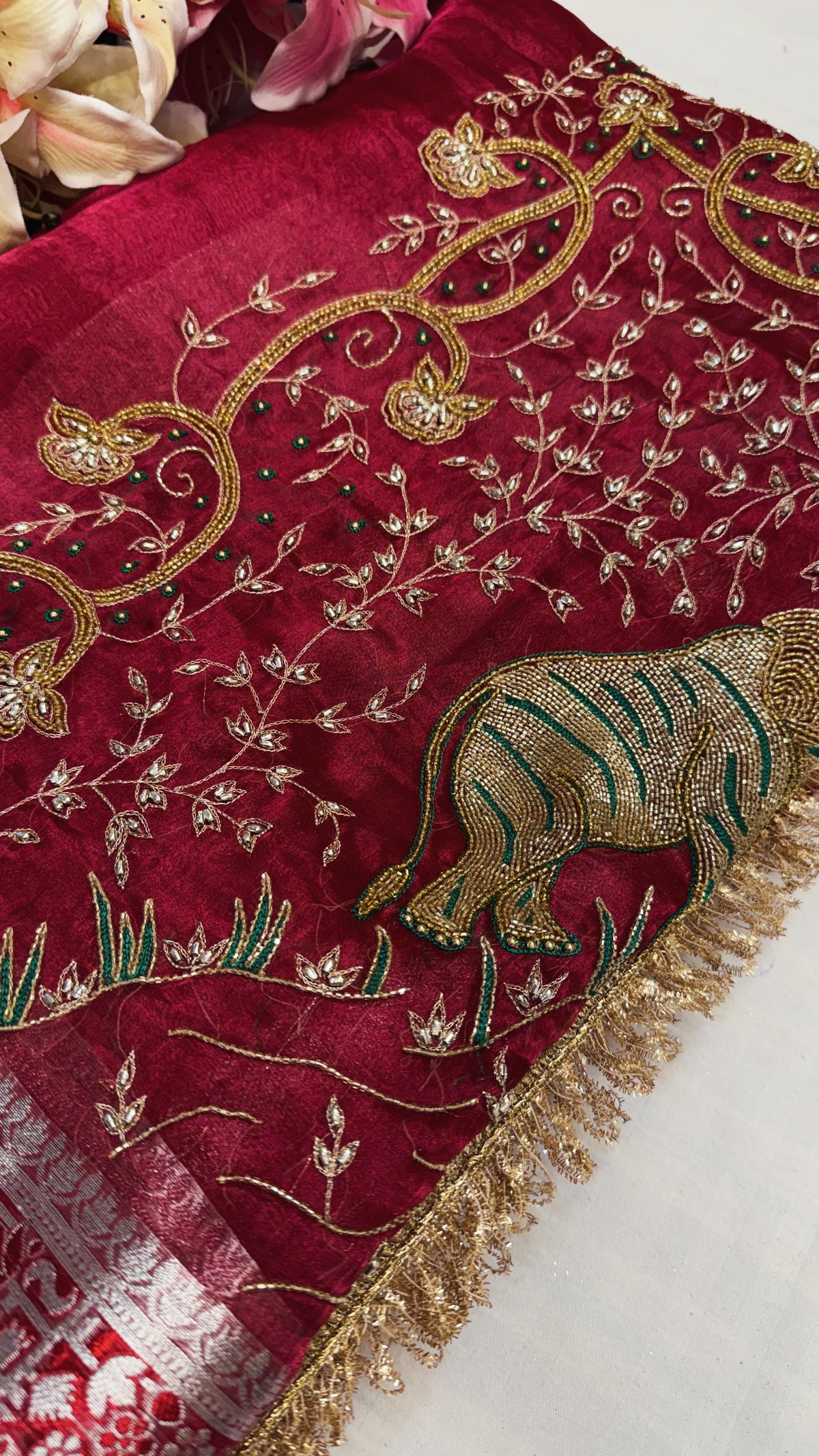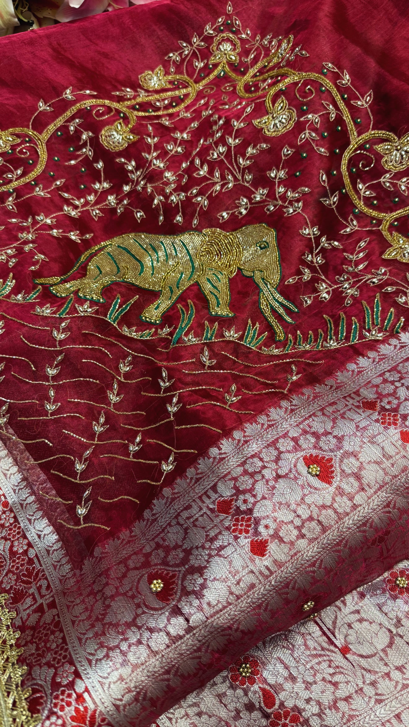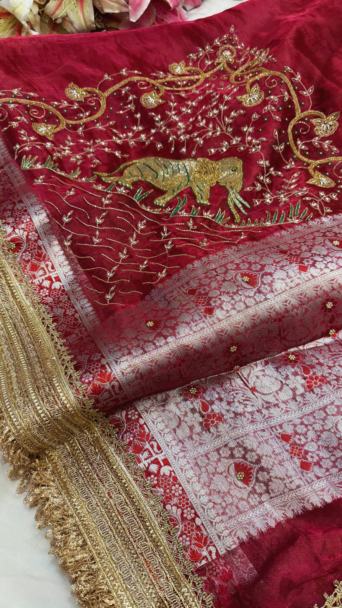 Karwachauth special - Rose pinkish red dhup chao effect tissue silk cheetah motif hand embroidered kadhwa saree