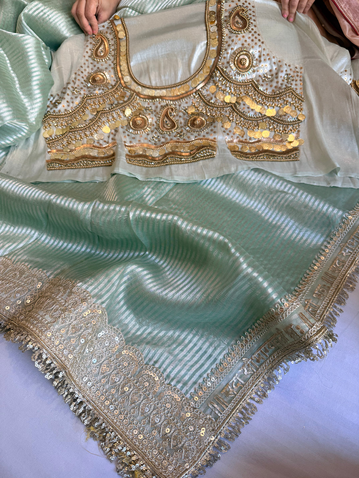 Kundan blouse edit - Sea green tissue silk hand embroidered striped saree with jewellery blouse
