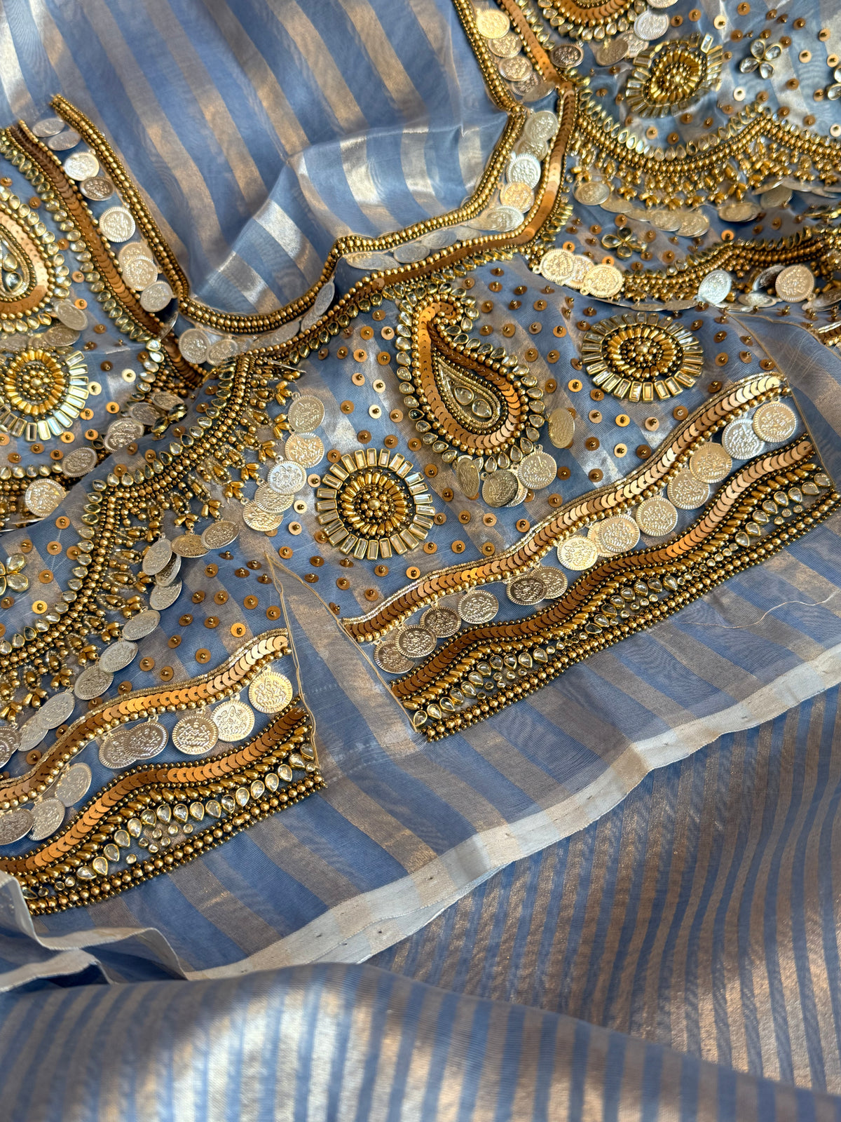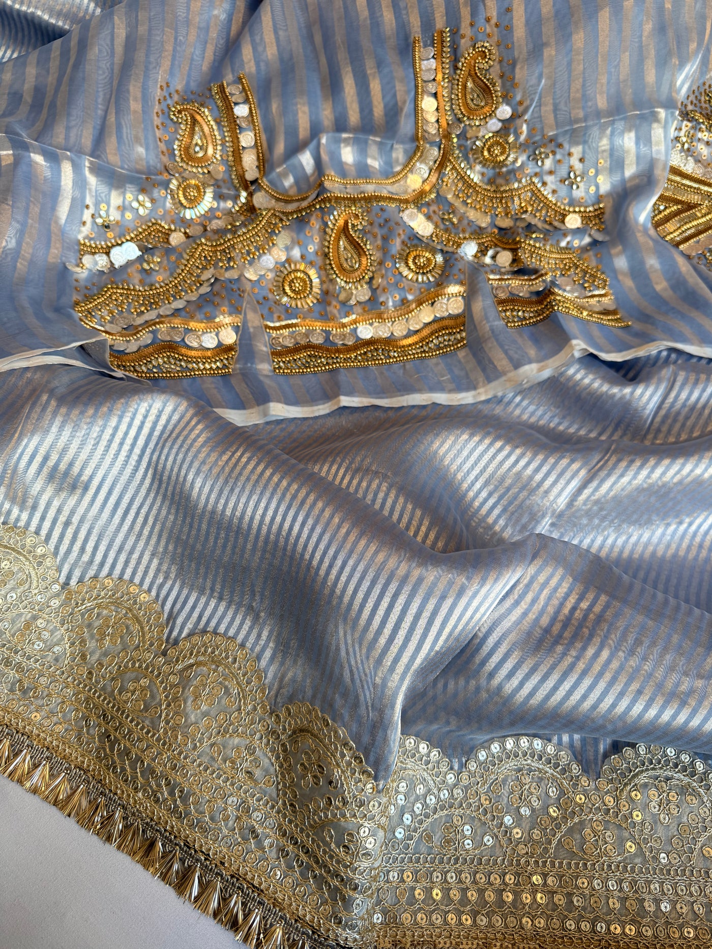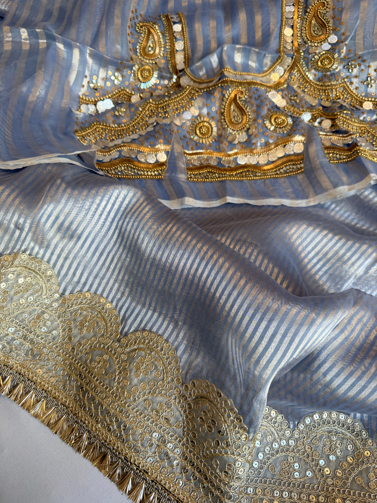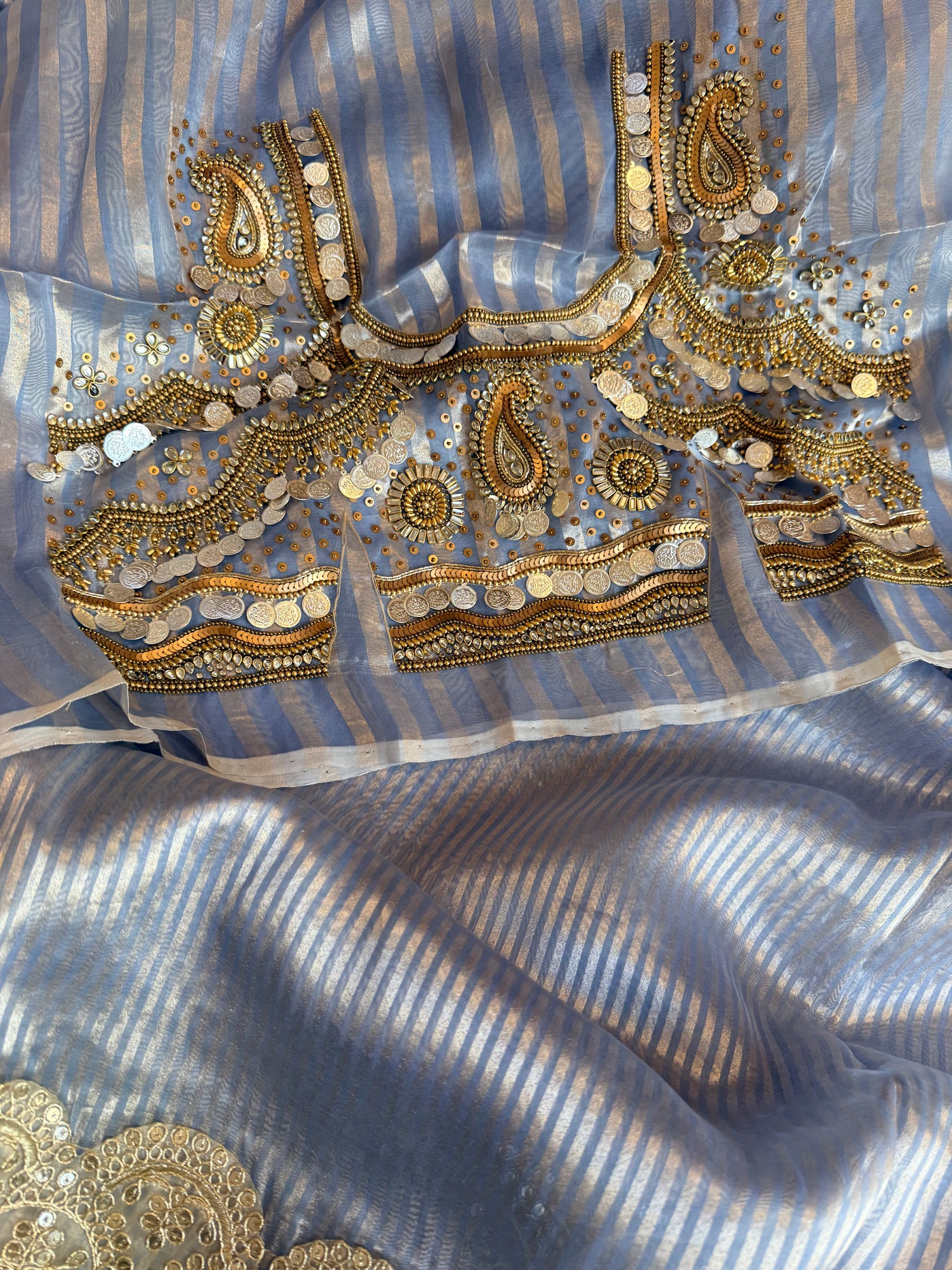 Kundan blouse edit - tissue silk hand embroidered striped saree with jewellery blouse