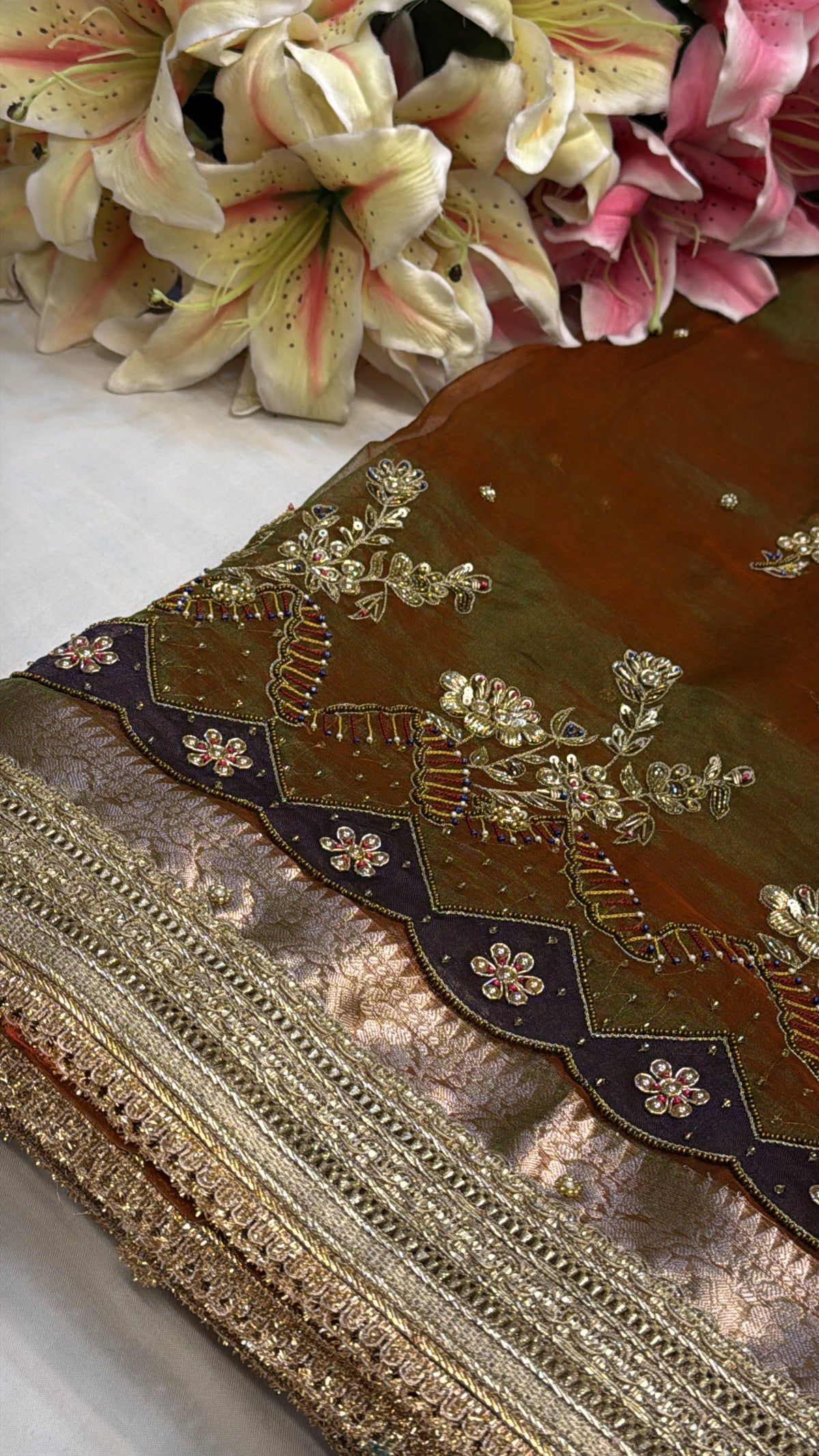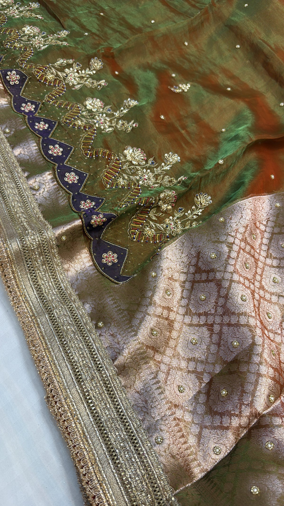 Mehendi green dhup chao effect tissue silk hand embroidered saree