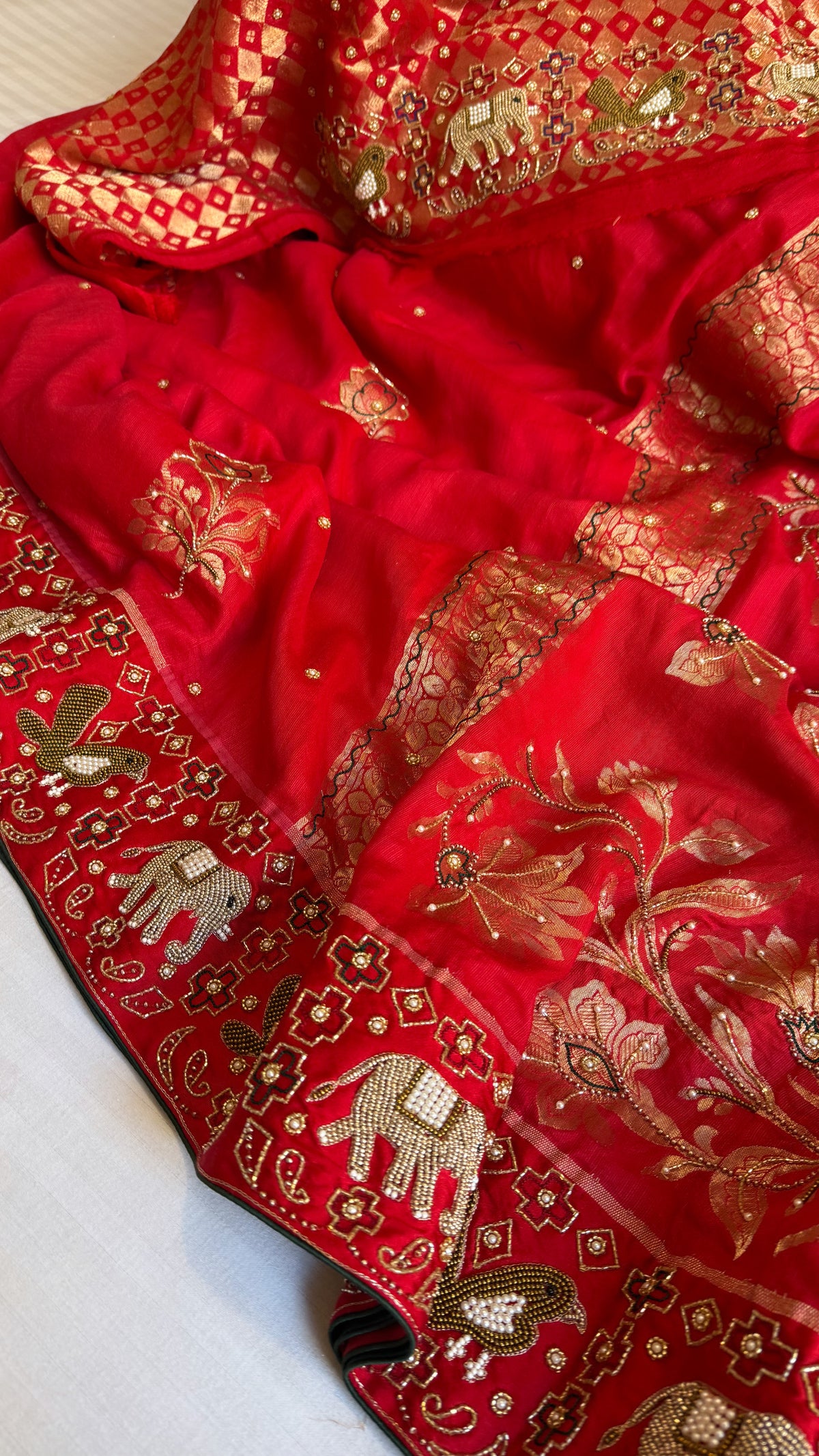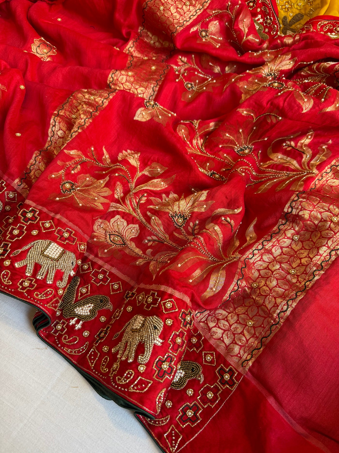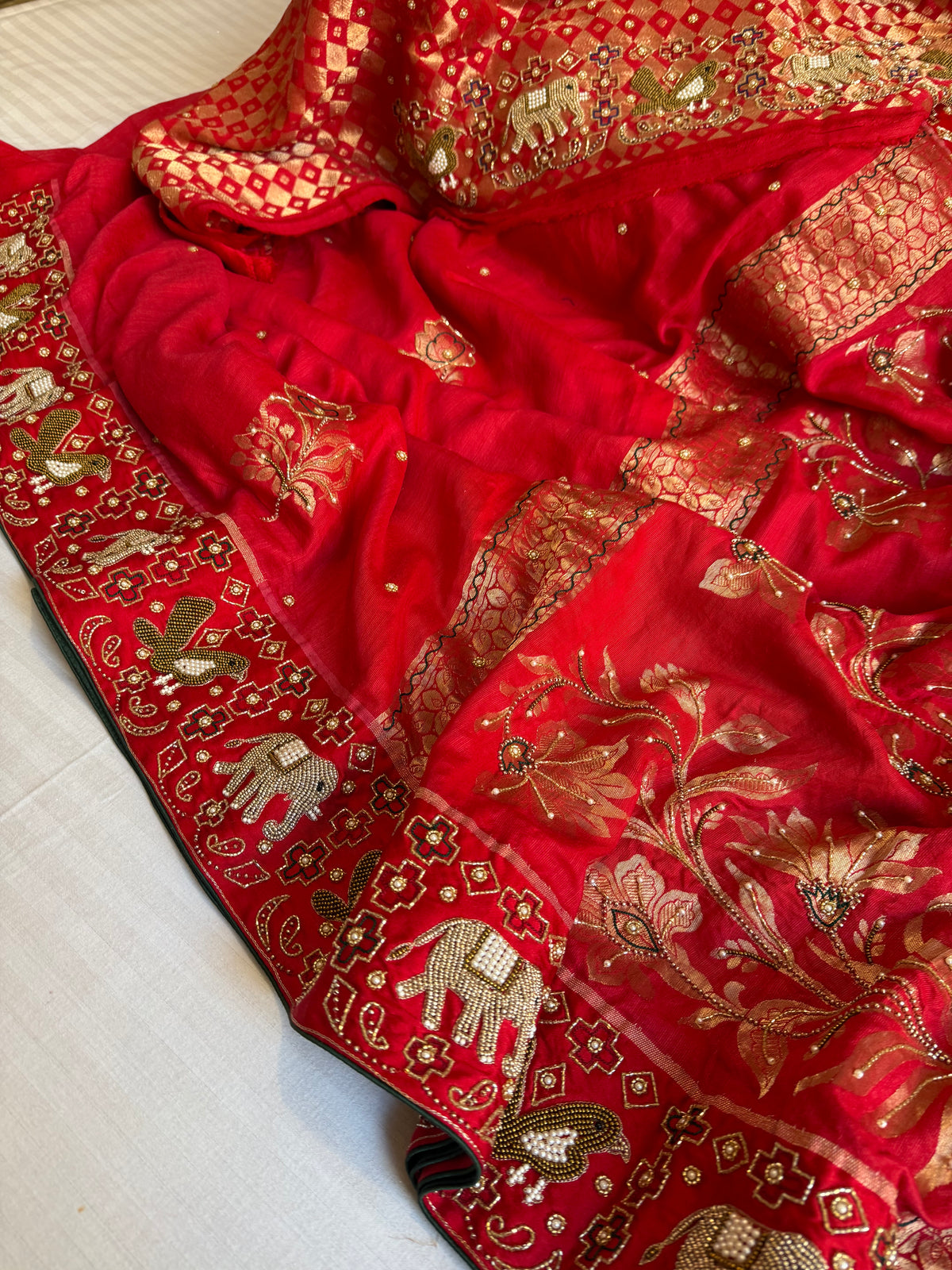 Moonga silk ikkat Patola weaving inspired hand embroidered kadhwa weaving saree
