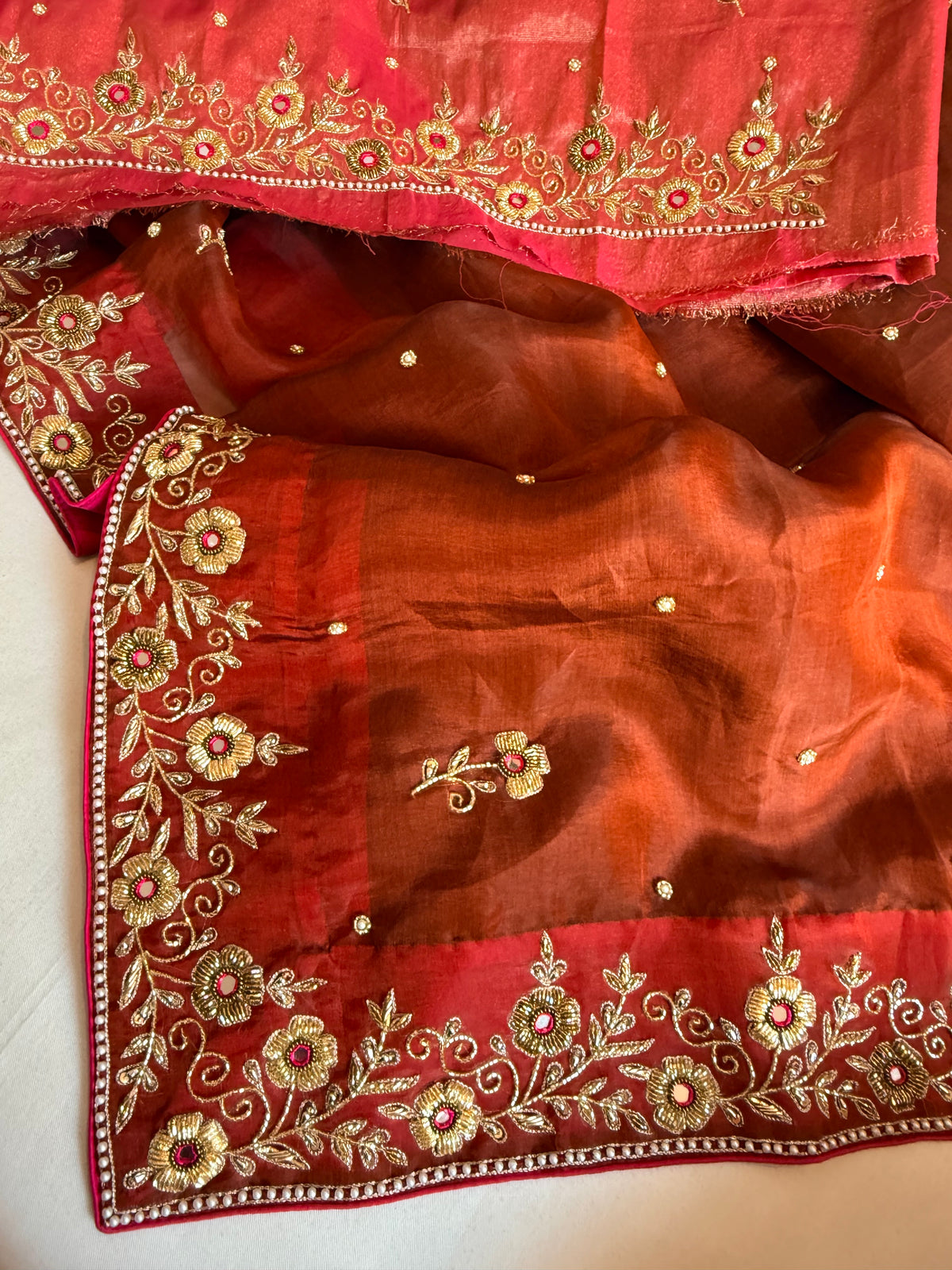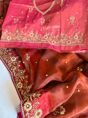 Mud brown-rani pink combination mirror and zardozi work tissue silk saree