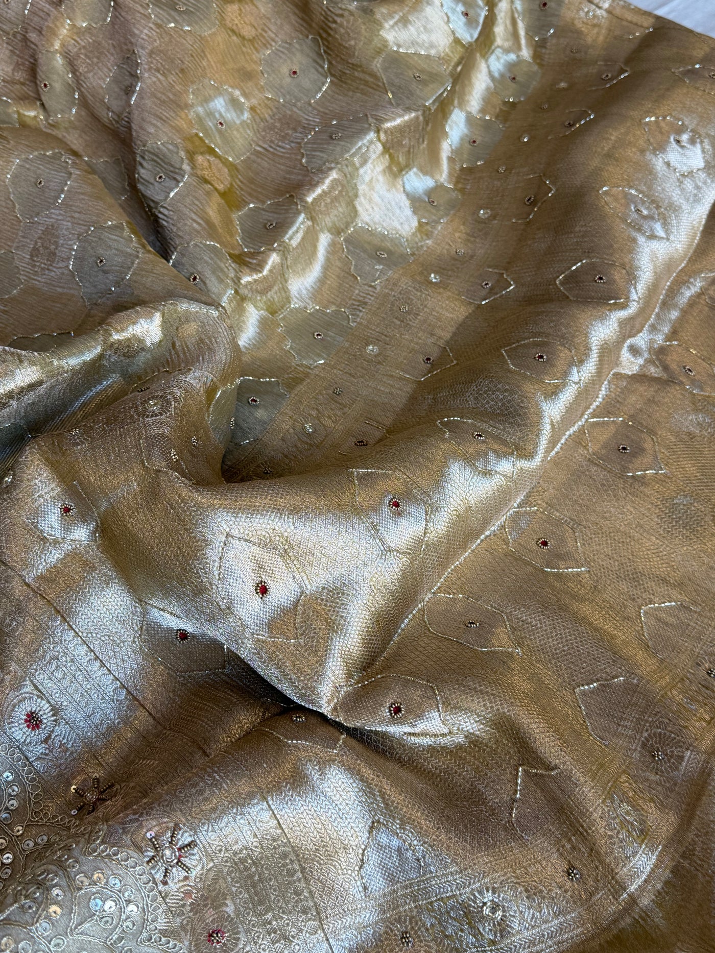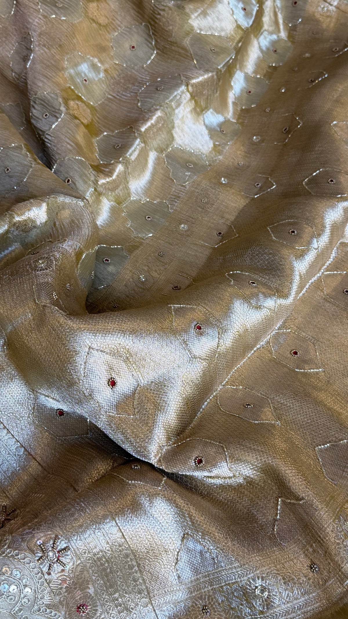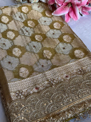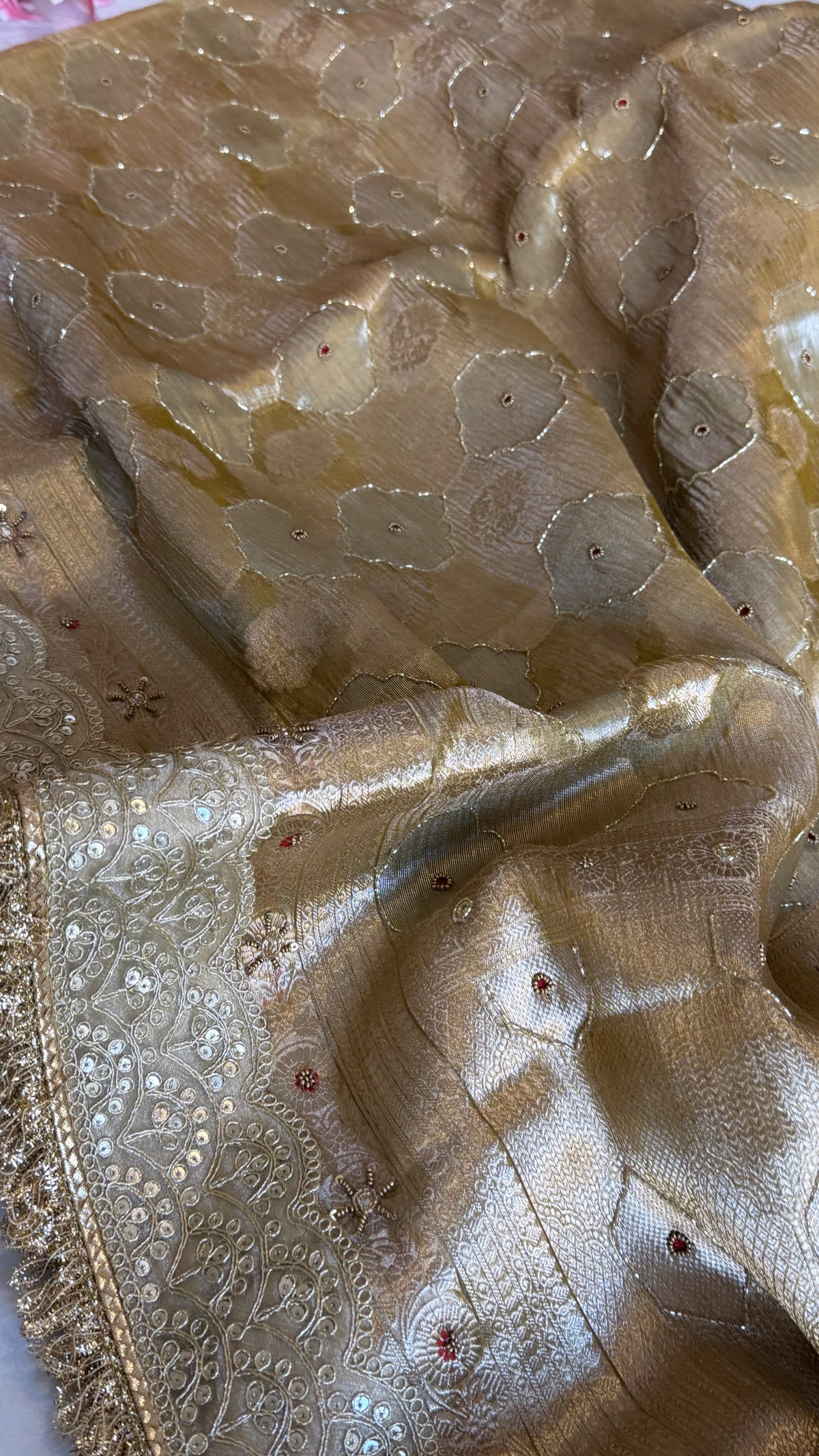 Mughalai jaal crushed tissue silk hand embroidered kadhwa dusty golden saree