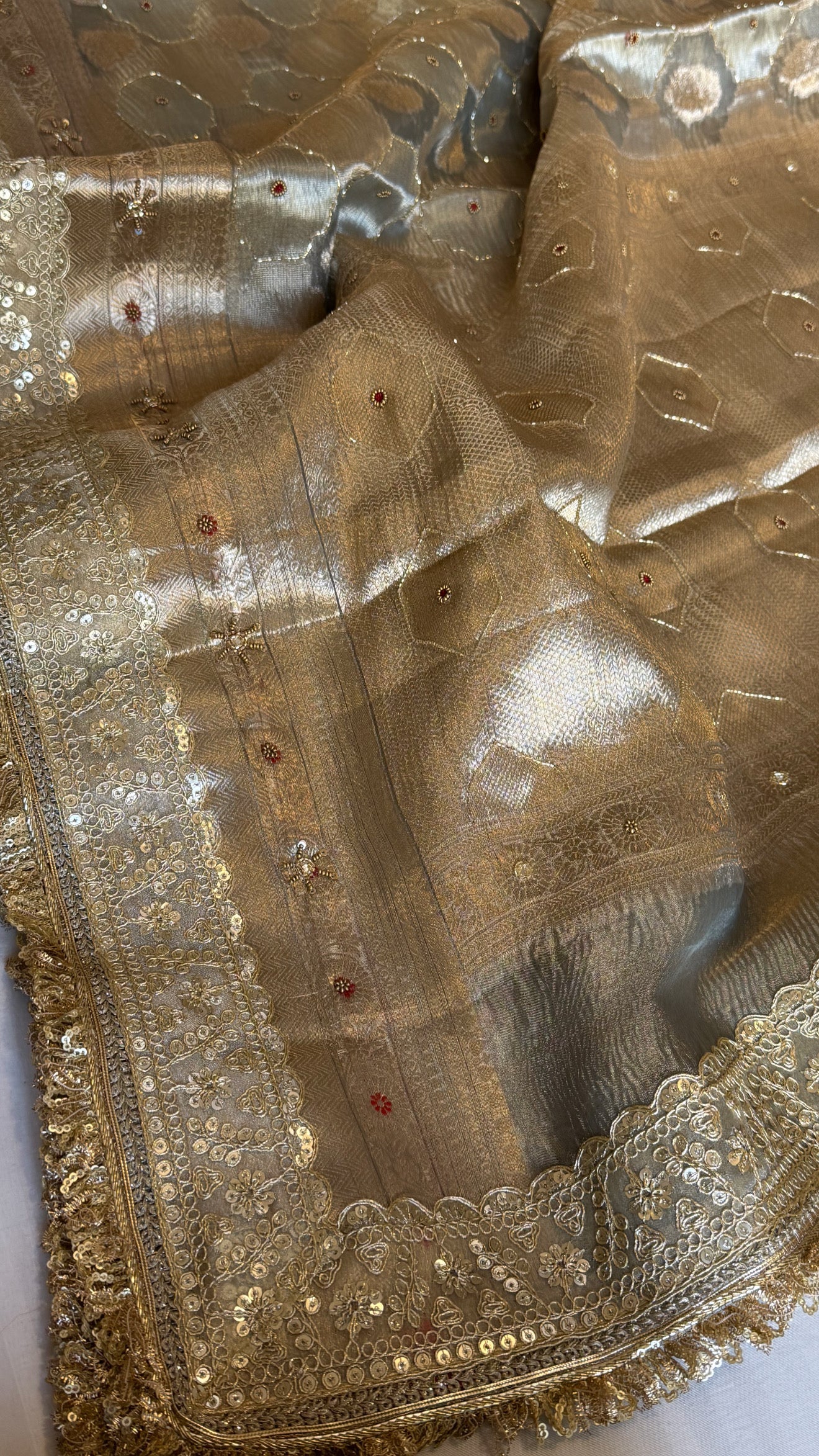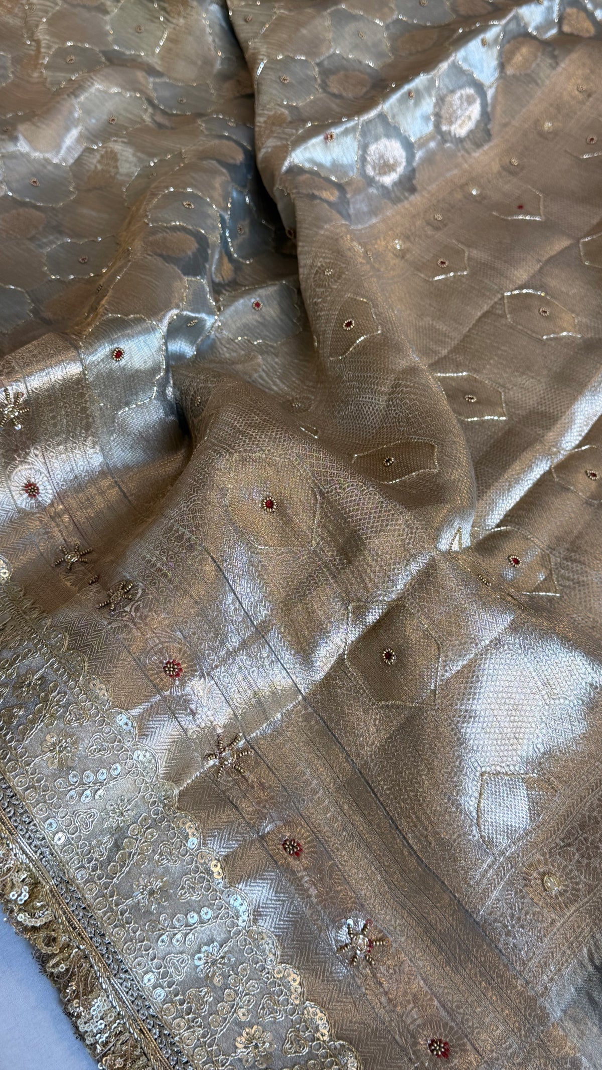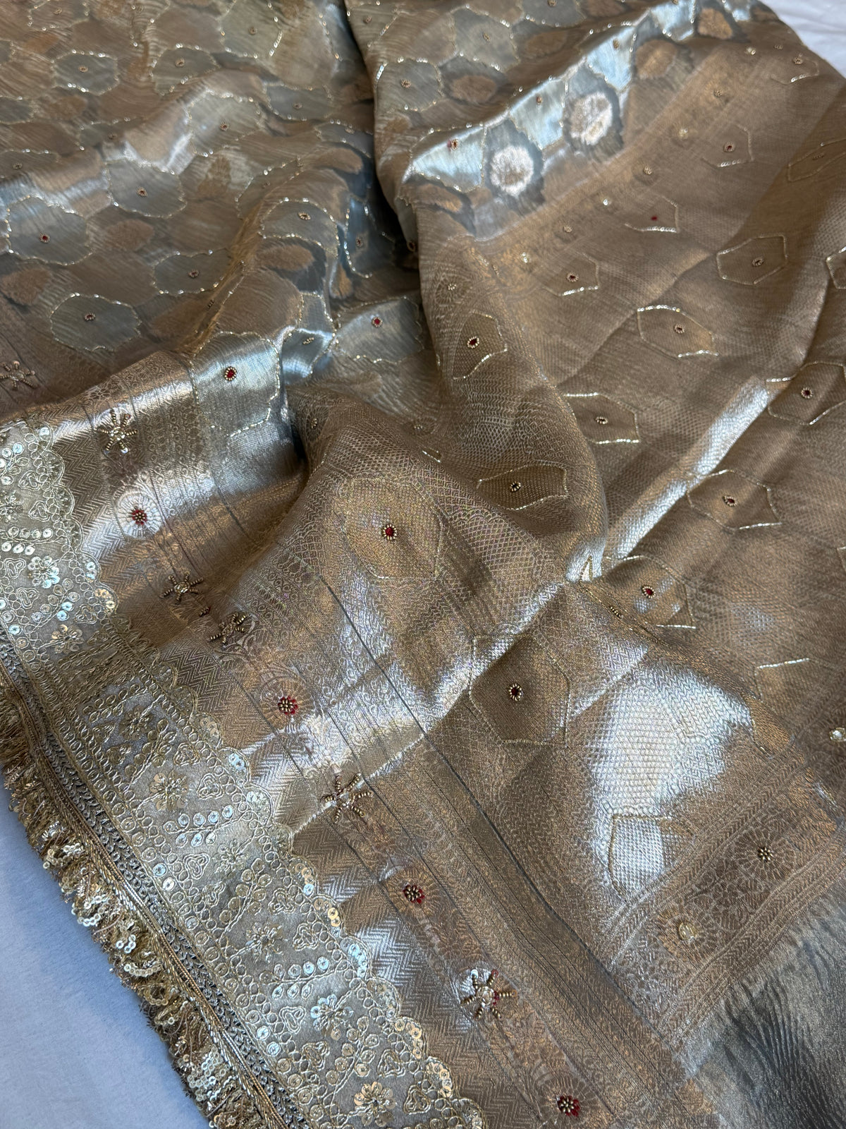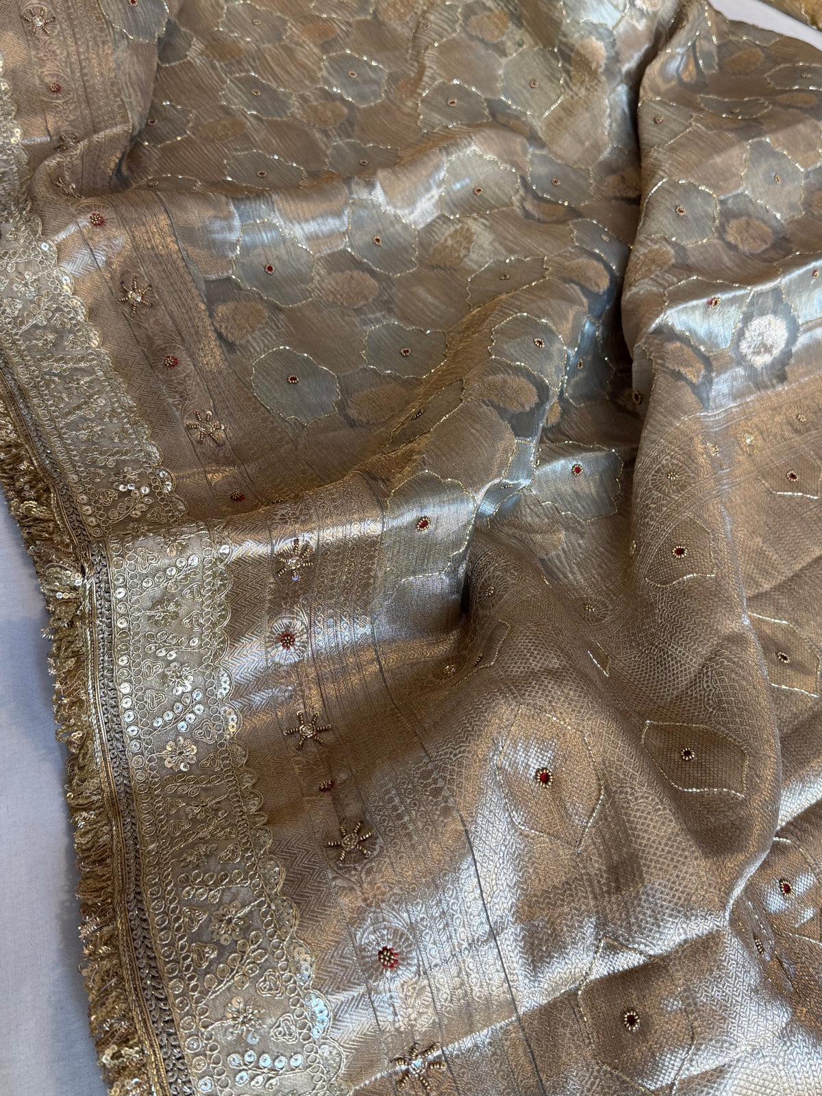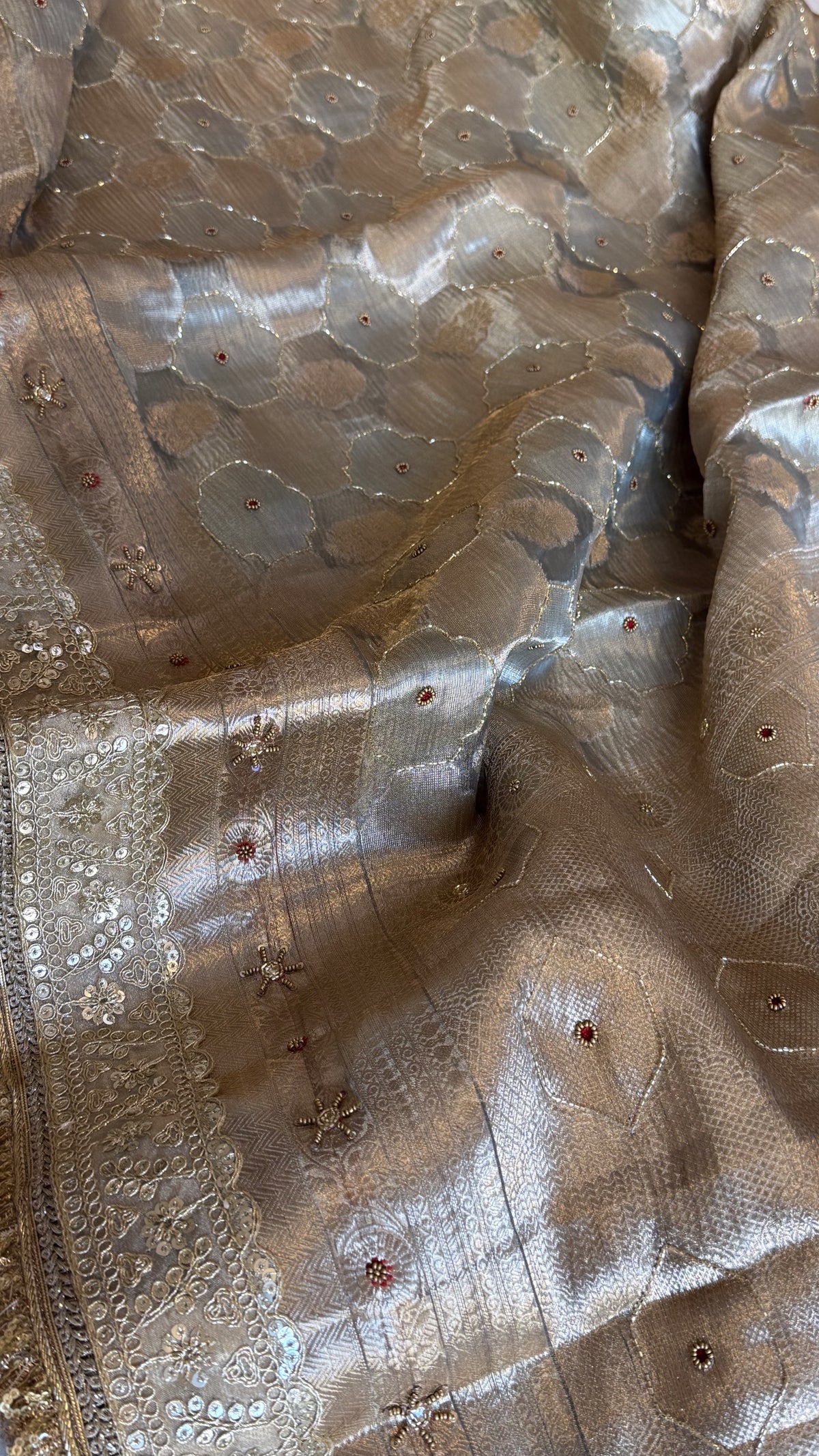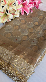 Mughalai jaal inspired Banarasi crushed tissue silk mouse grey hand embroidered kadhwa saree