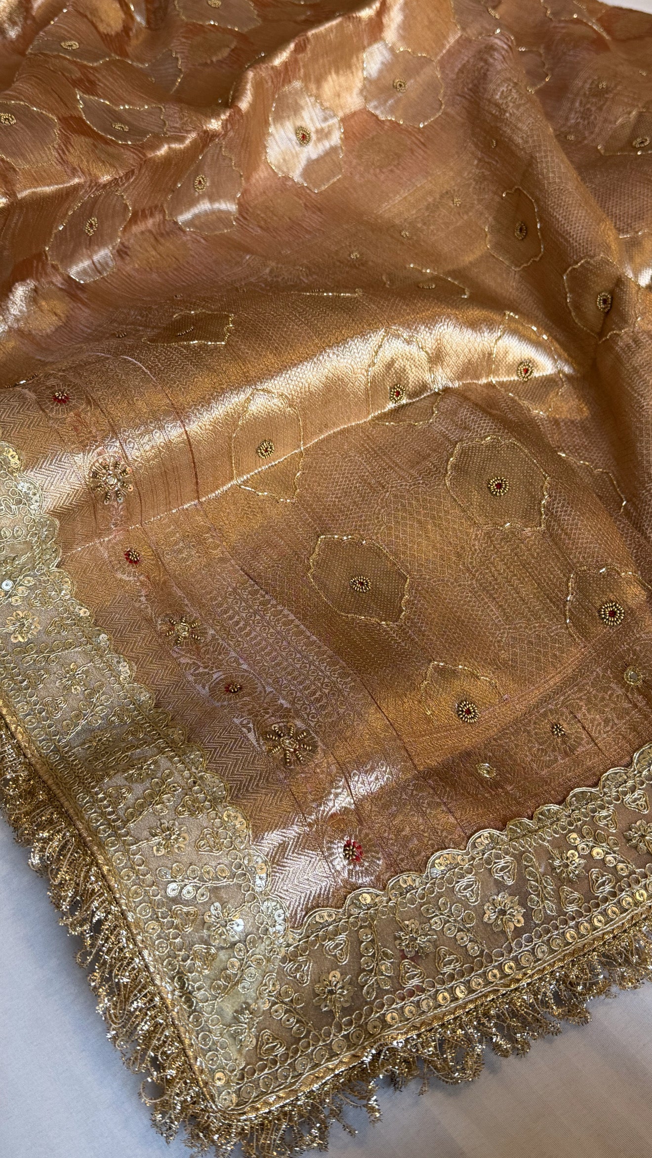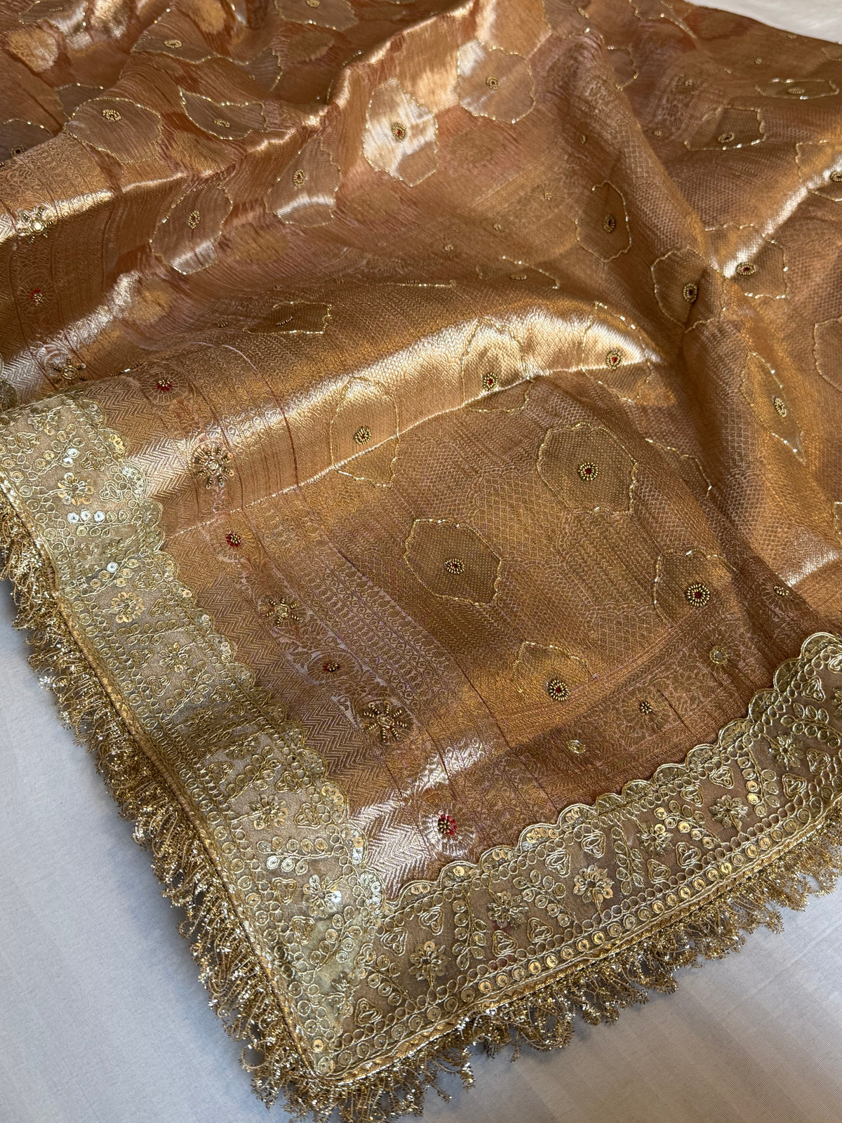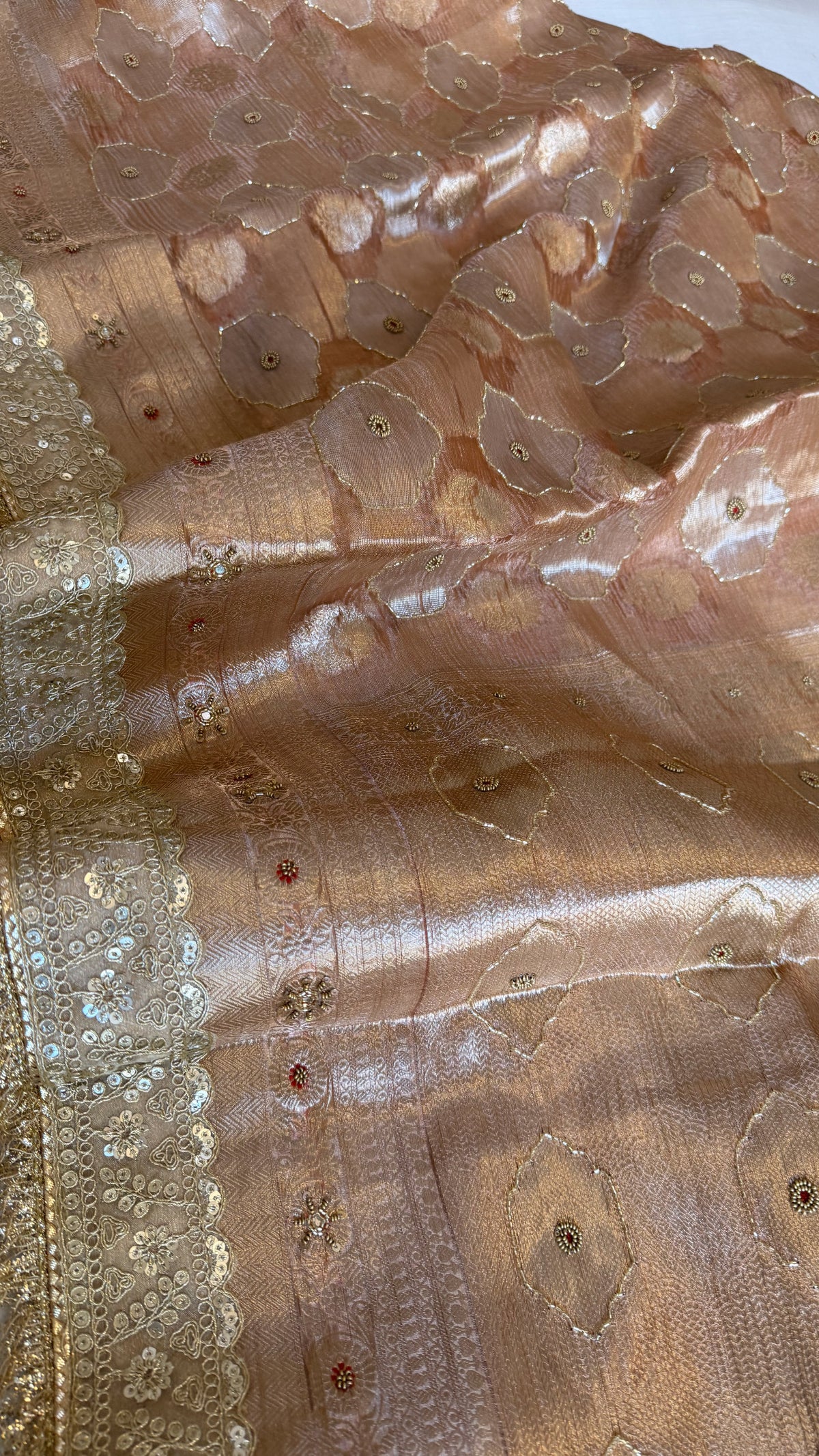 Mughalai jaal inspired crushed tissue silk hand embroidered kadhwa peachish saree