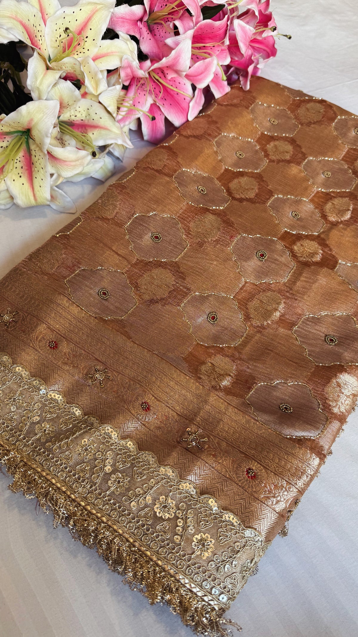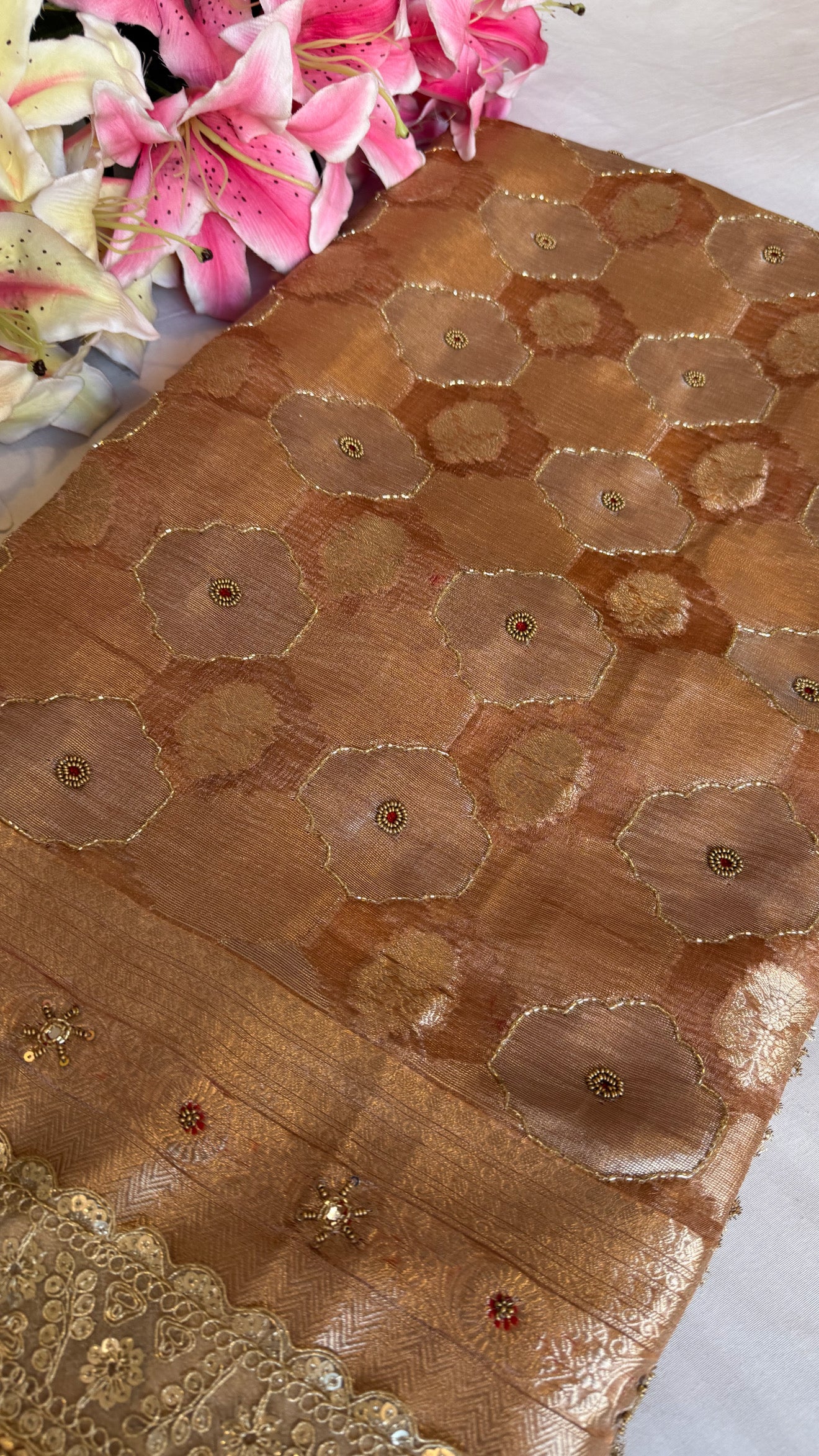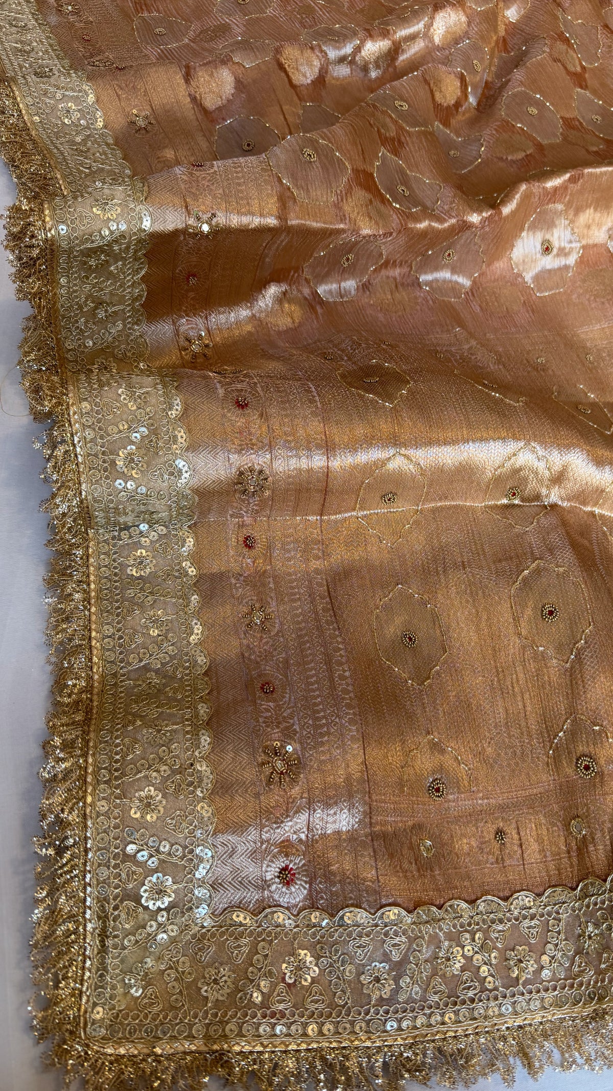 Mughalai jaal inspired crushed tissue silk hand embroidered kadhwa peachish saree