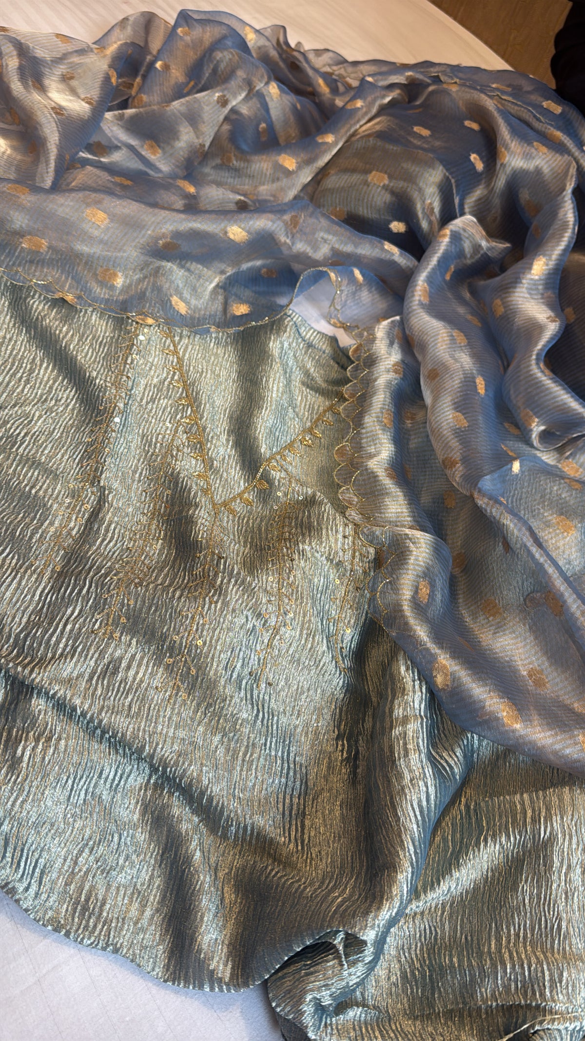 Navy blue crushed tissue silk hand embroidered kadhwa suit set