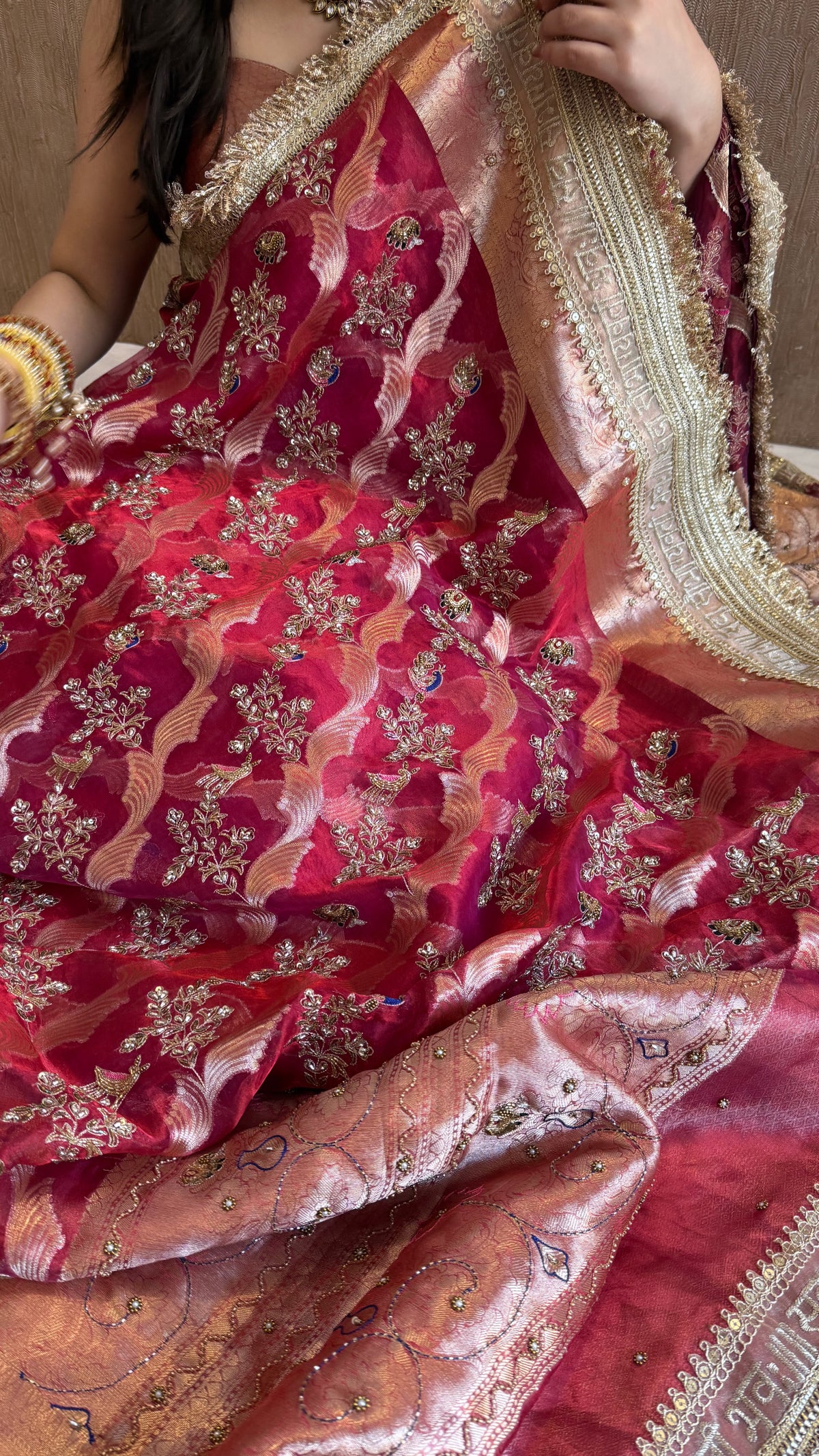 Nayi suhagan edit - Cranberry blood red tissue silk zardozi and marodi work hand embroidered jaal work saree