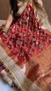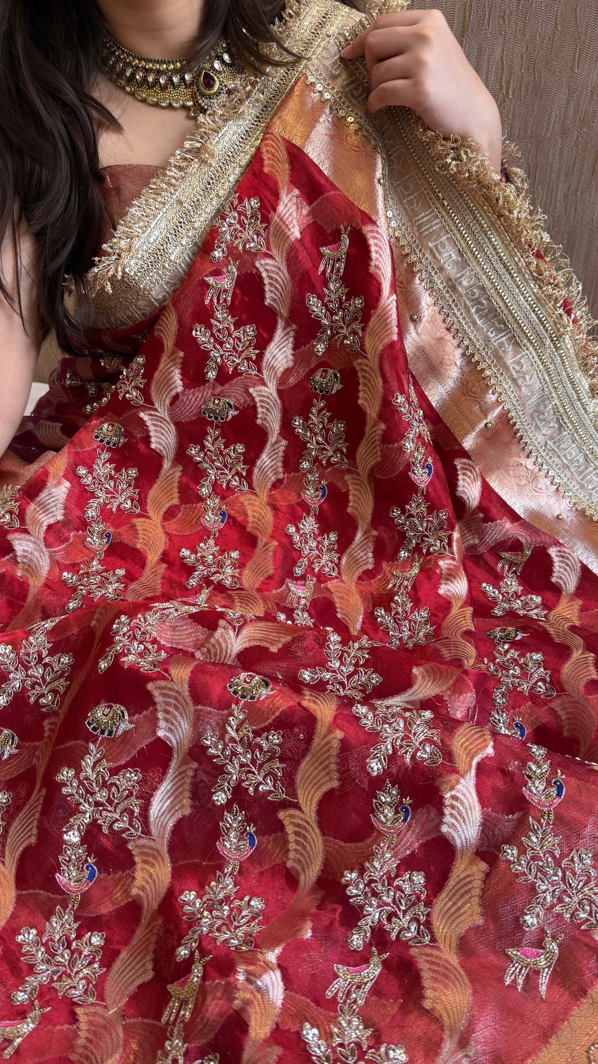 Nayi suhagan edit - Dhup chao blood red tissue silk zardozi and marodi work hand embroidered jaal work saree
