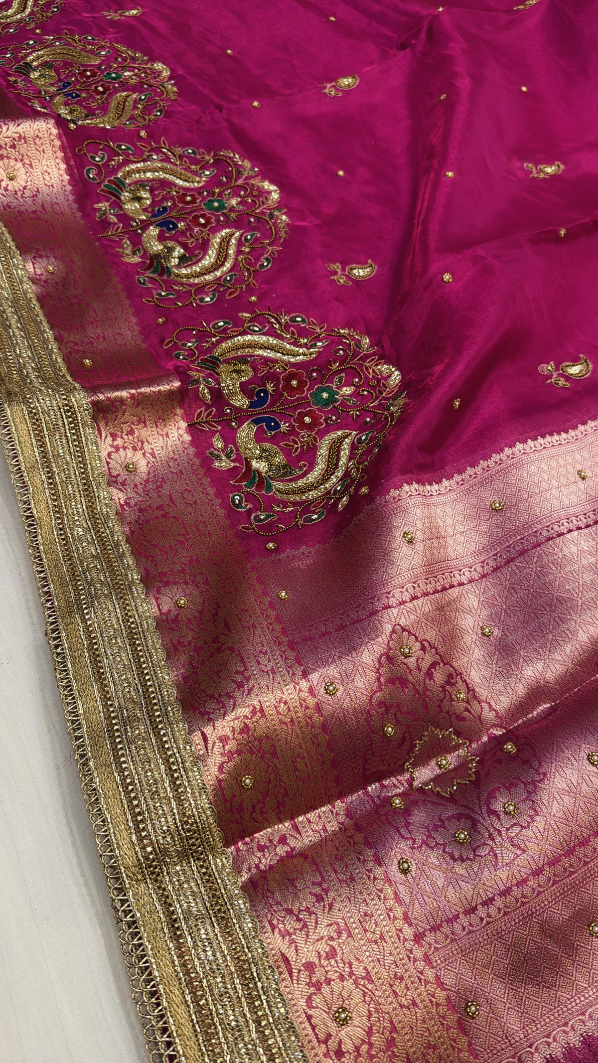 Pink special - Husn hot pink tissue silk peacock motif hand embroidered saree