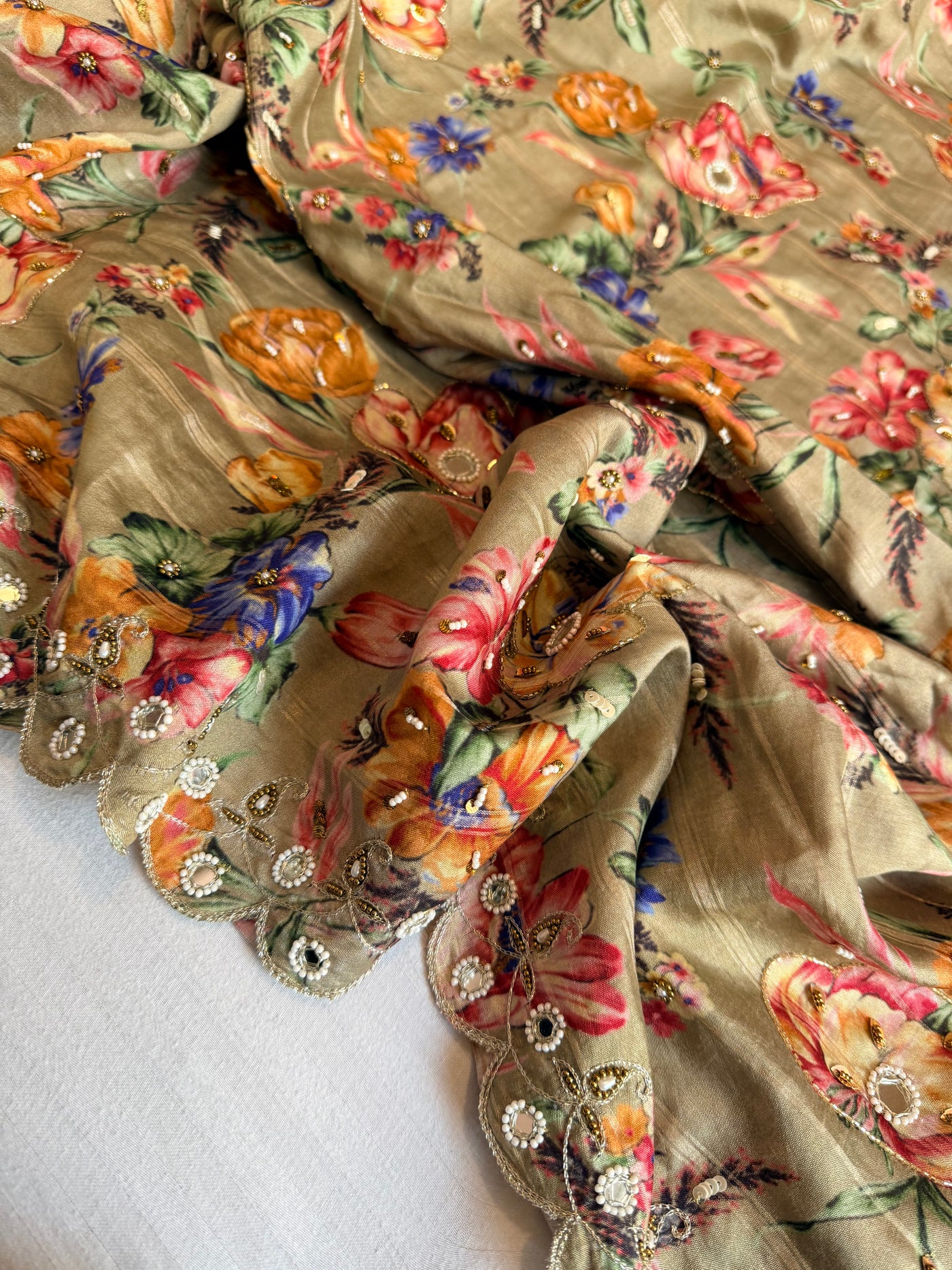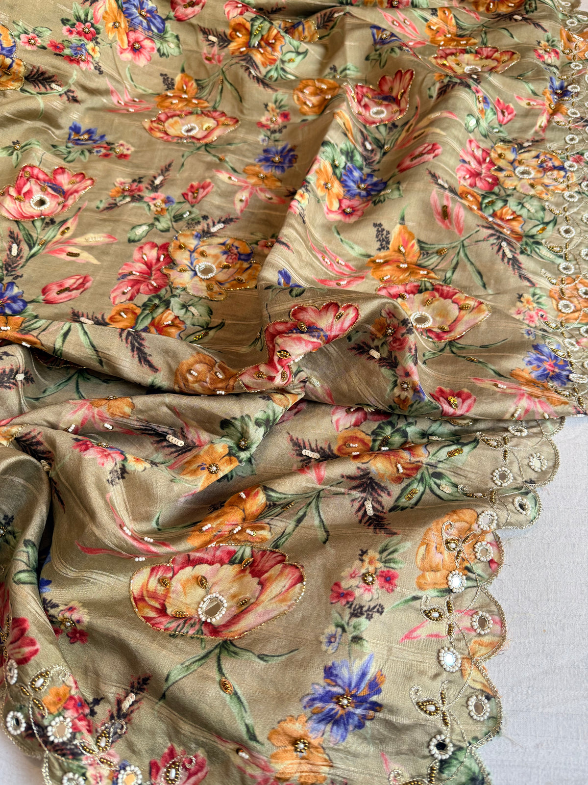 Printed moonga silk hand embroidered kadhwa gotapatti saree
