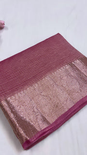 Pure banarasi peachish pink crushed tissue silk handwoven kadhwa saree with intricate border and kadhwa blouse