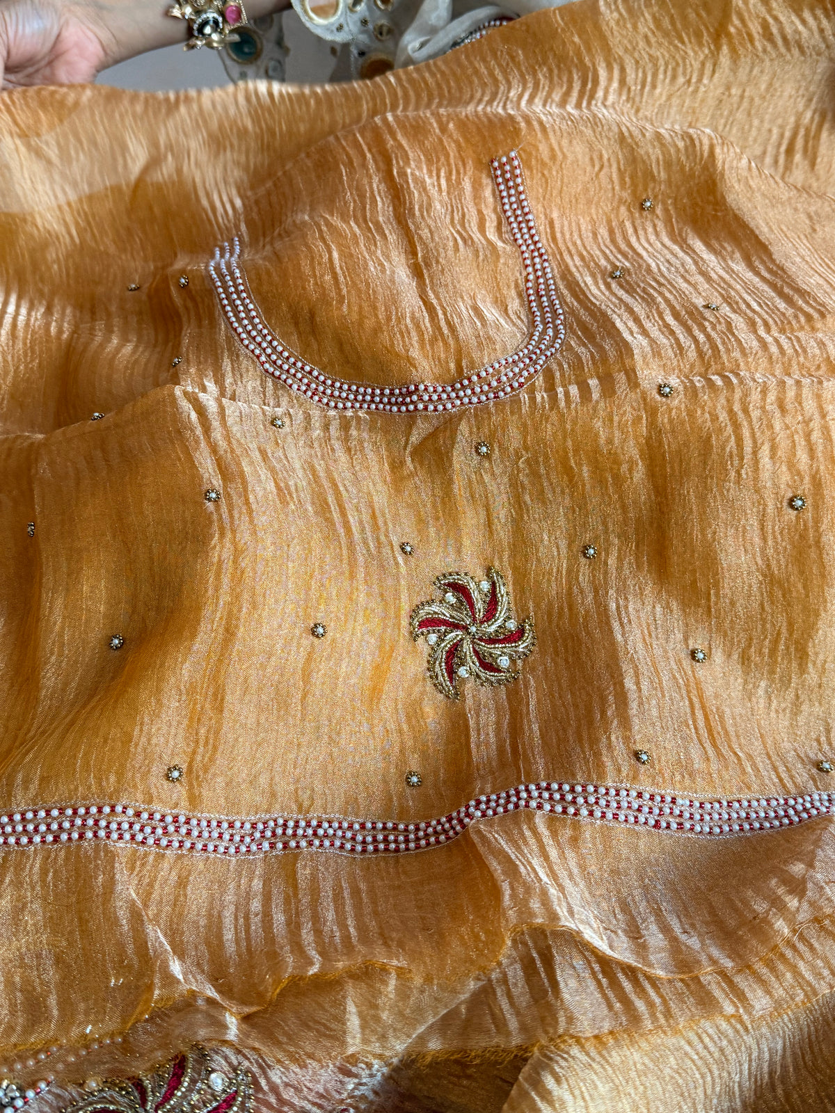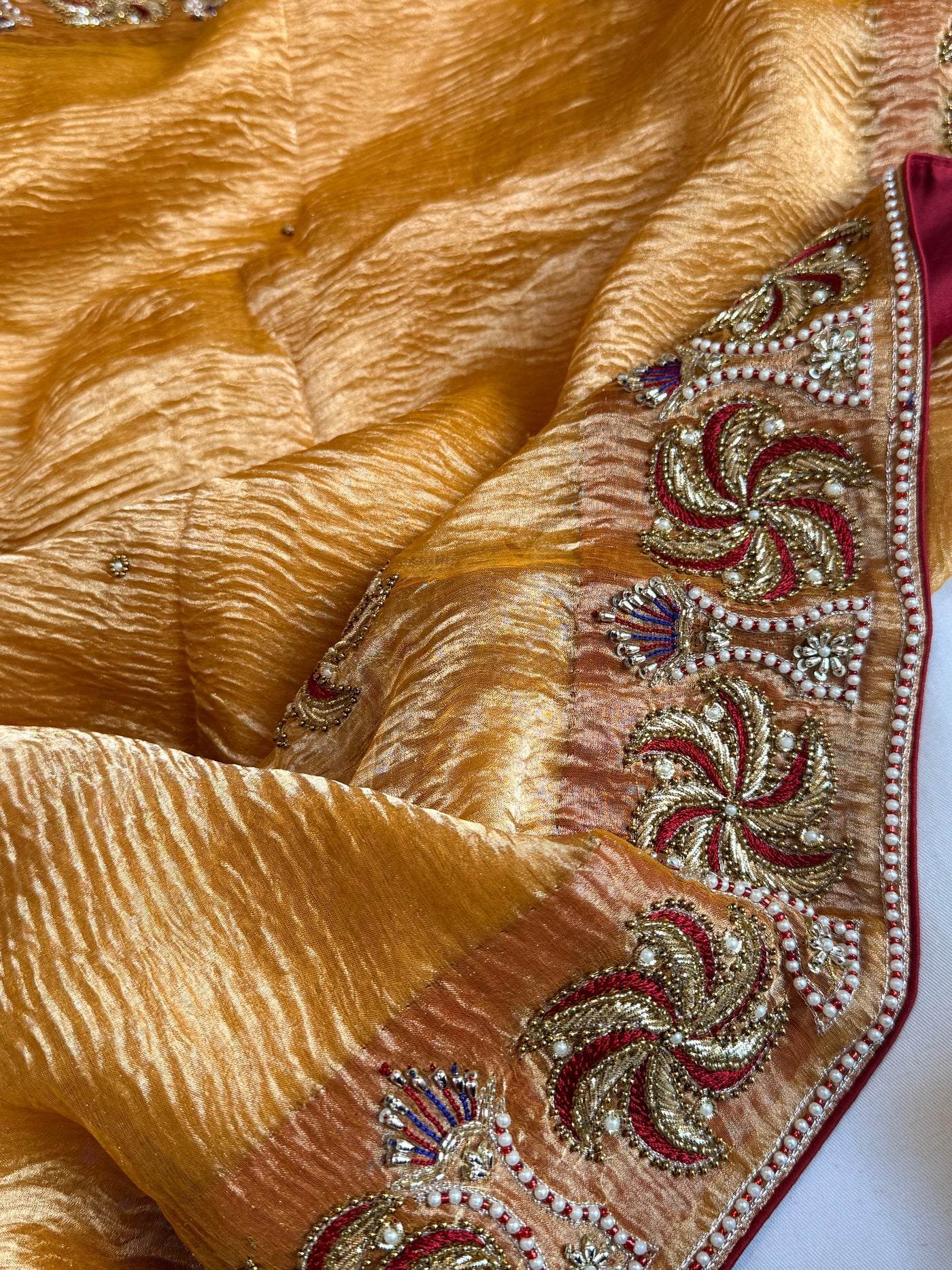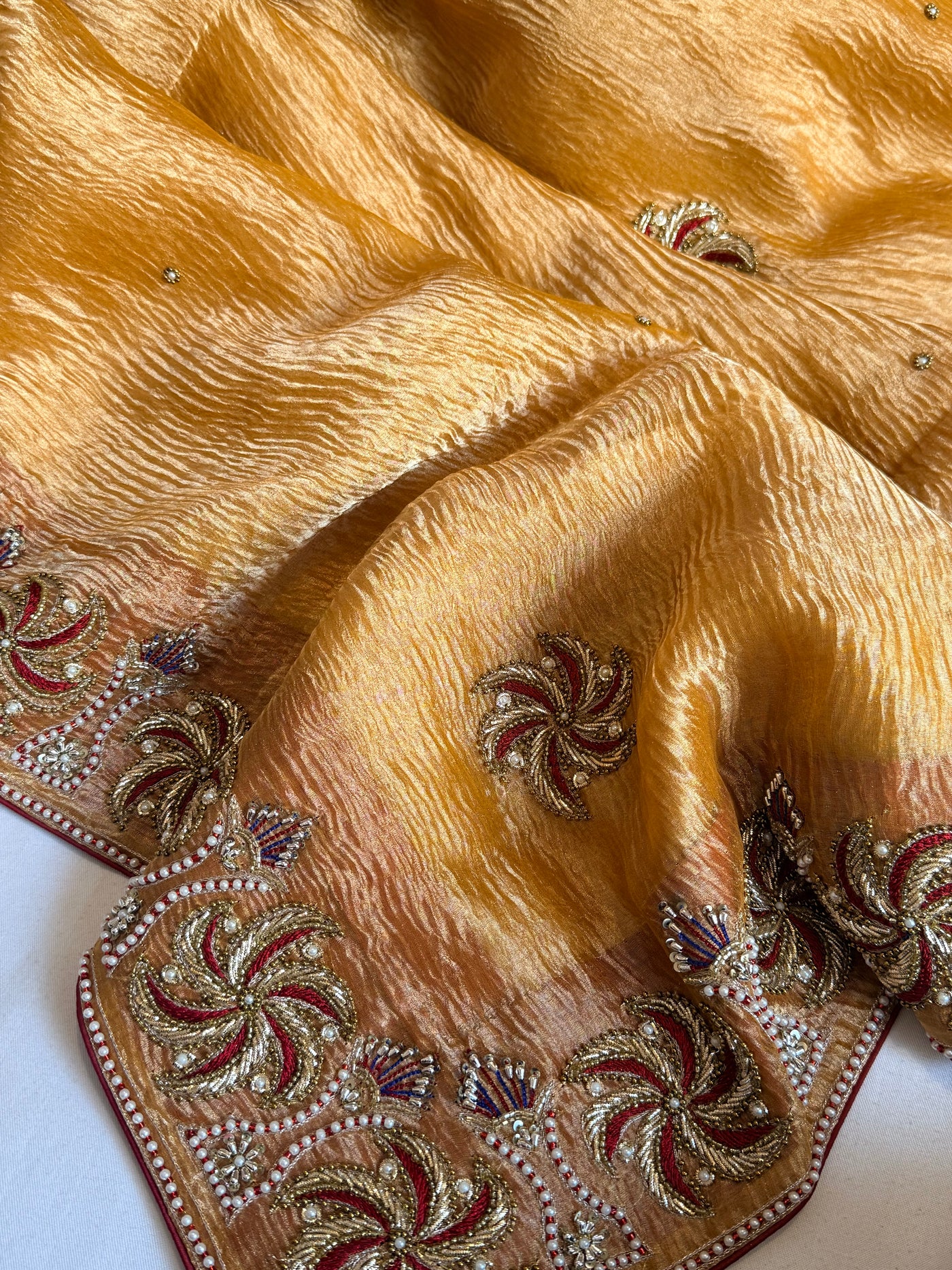 Rajkumari kesari yellow crushed tissue silk zardozi work hand embroidered saree