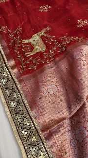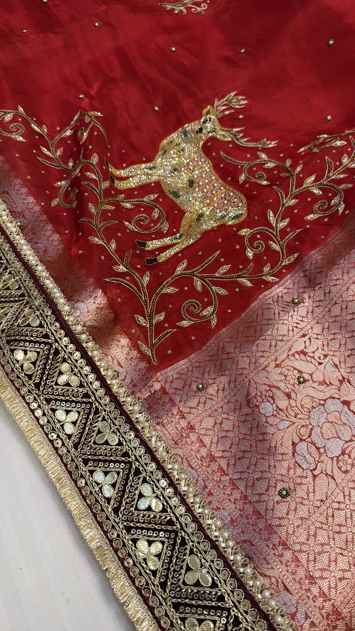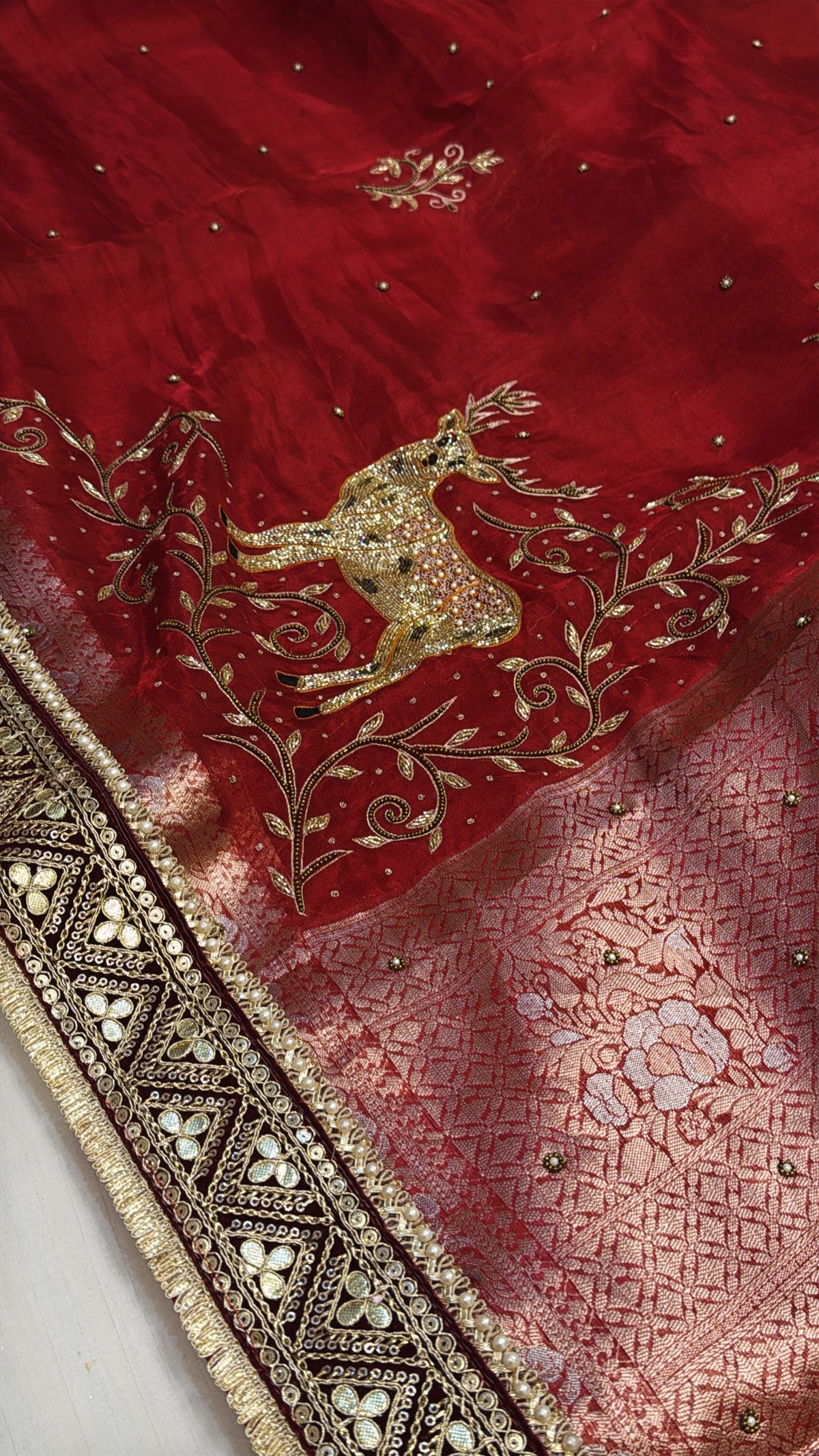 Red special - Husn chilly red deer motif tissue silk hand embroidered kadhwa saree