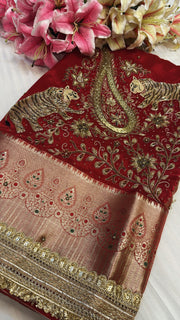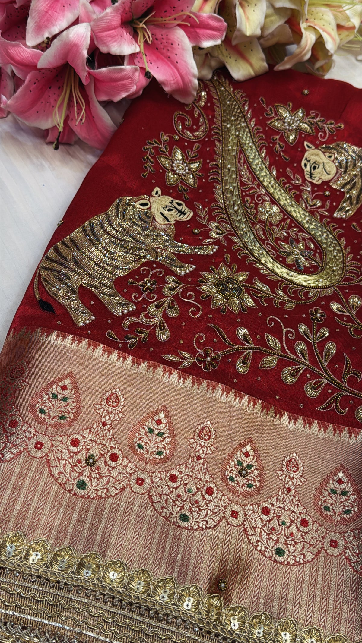 Red special - Husn hot red tissue silk tiger motif hand embroidered kadhwa saree