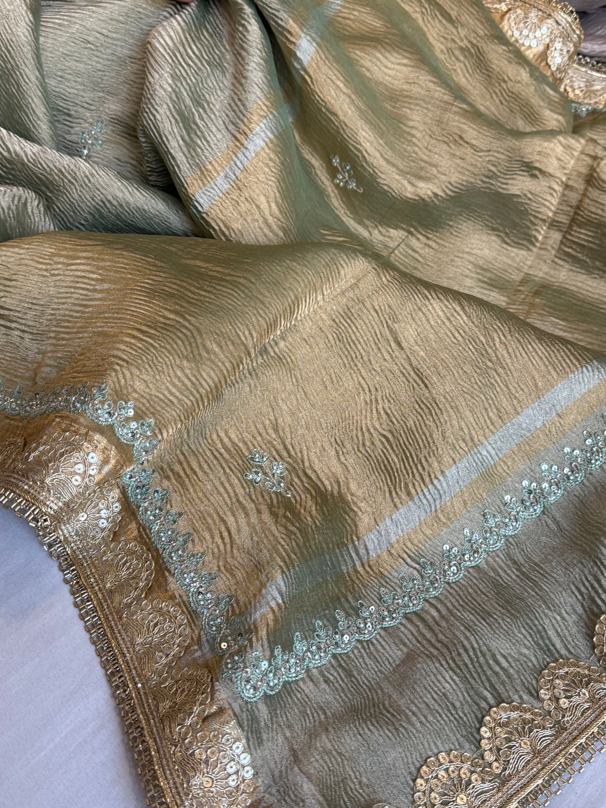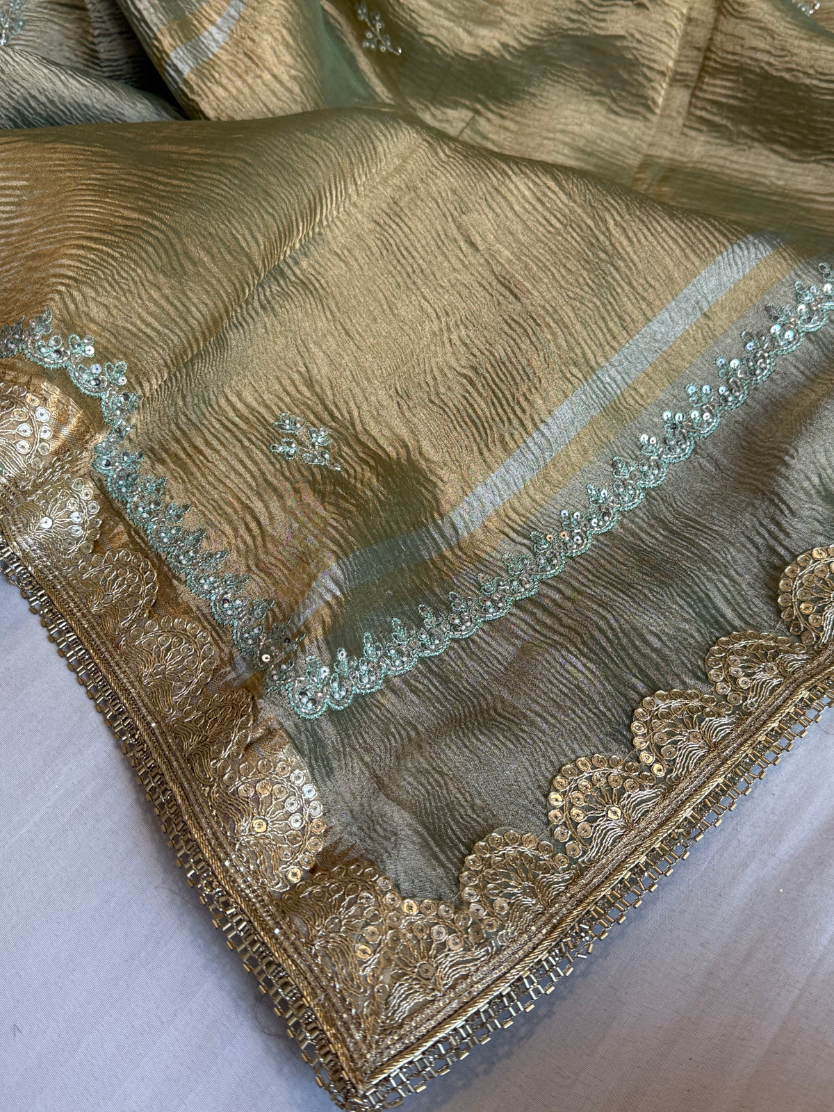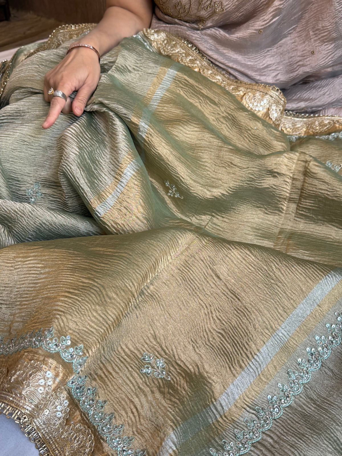 Sage green pearl work hand embroidered husn crushed tissue saree