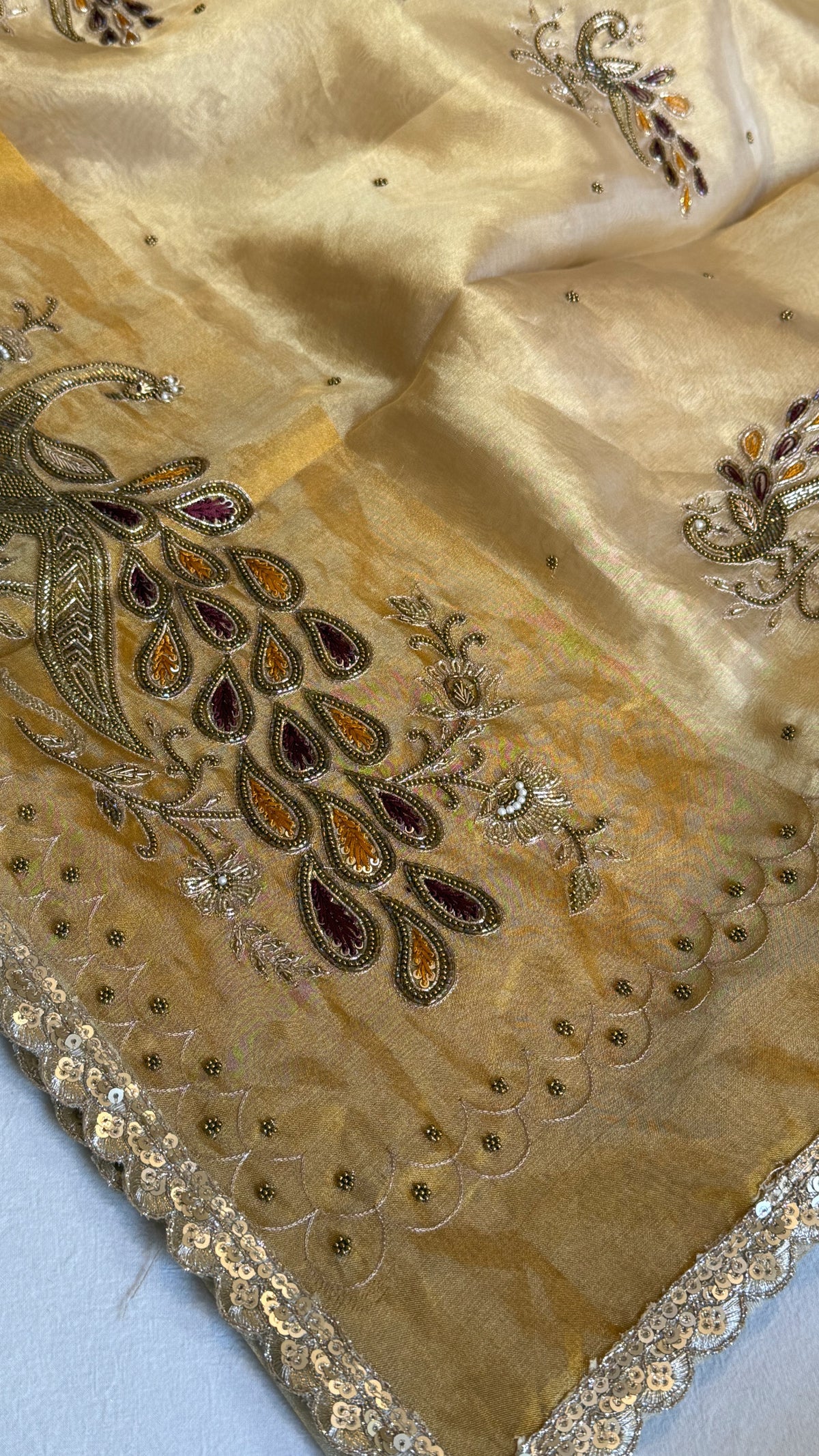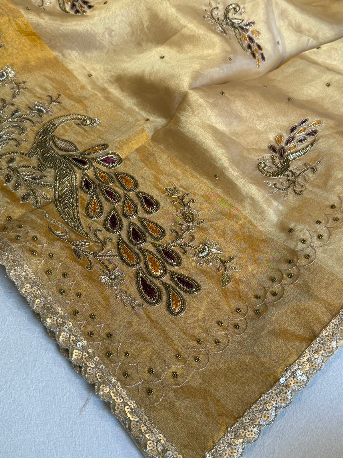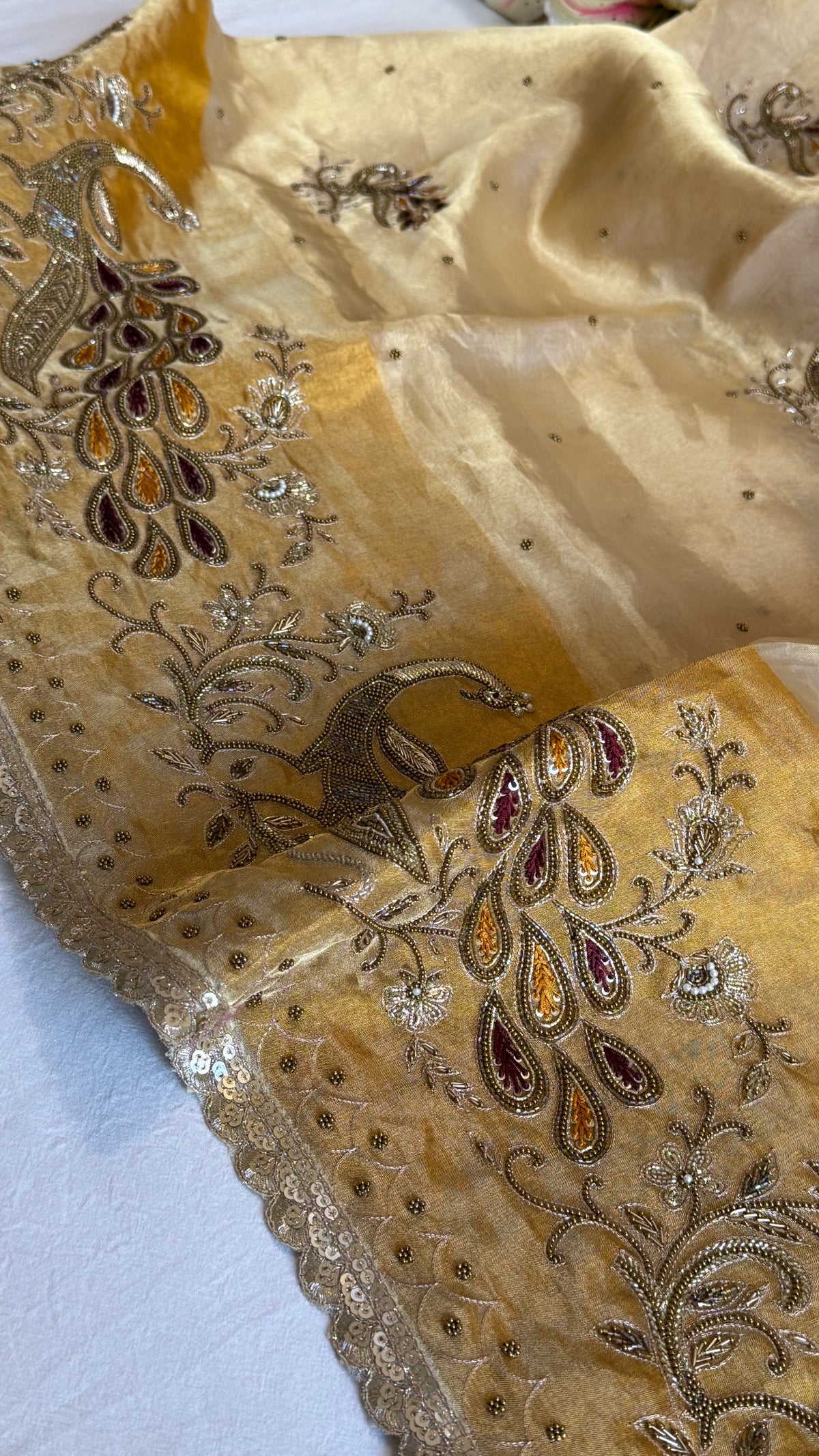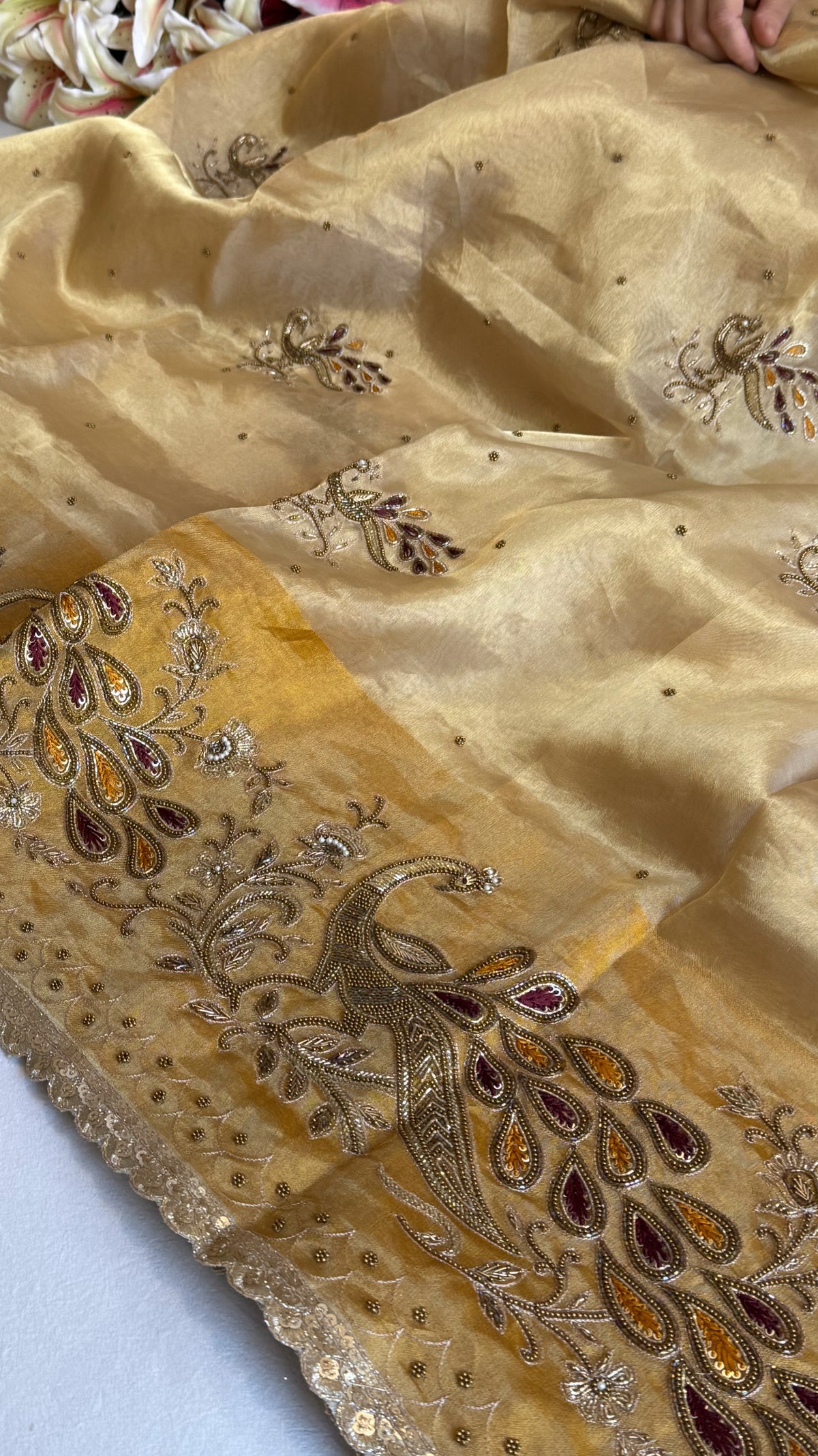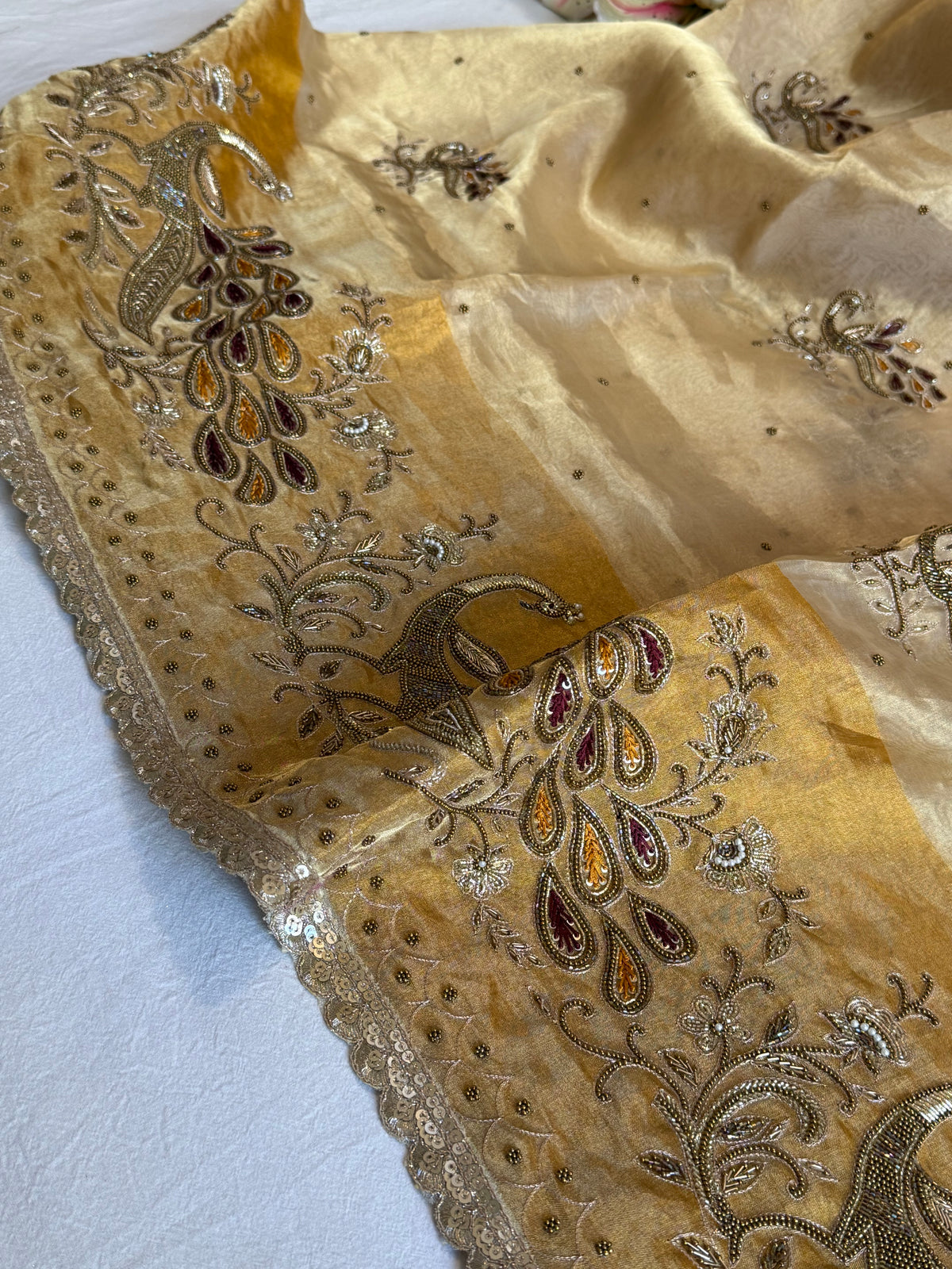 Satin tissue silk butter gold hand embroidered kadhwa banarasi saree