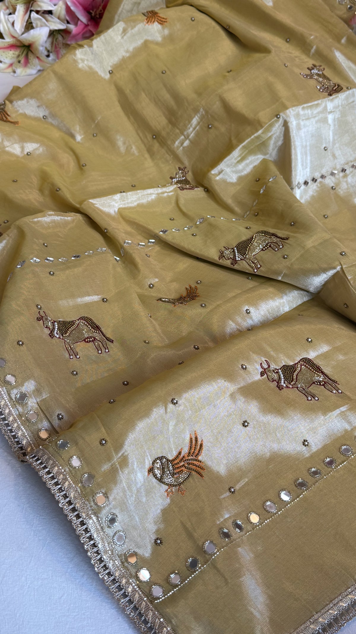 Satin tissue silk ivory gold hand embroidered kadhwa banarasi saree
