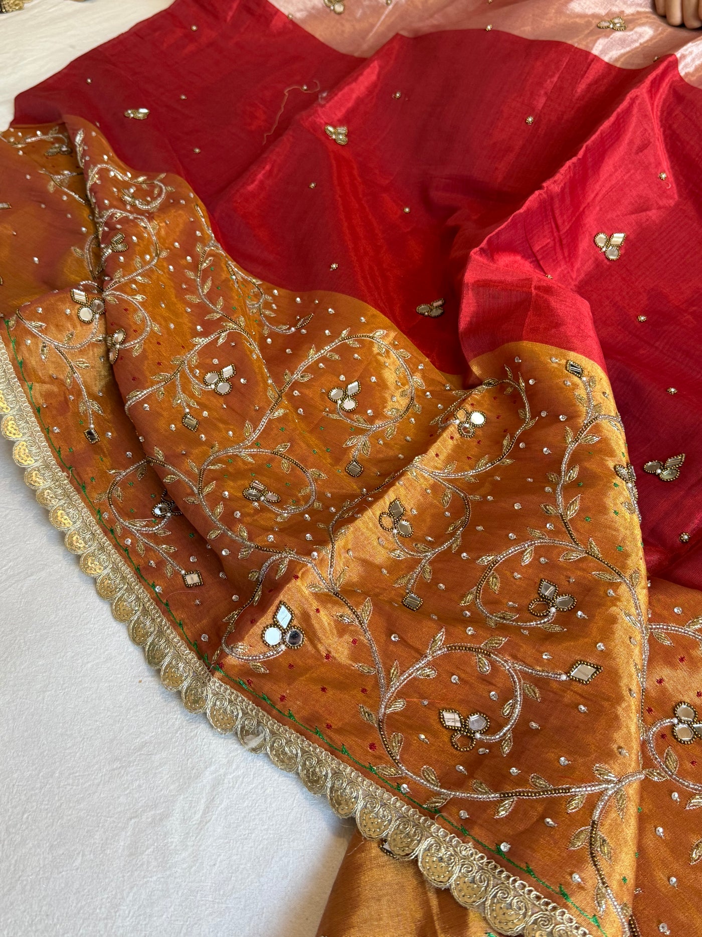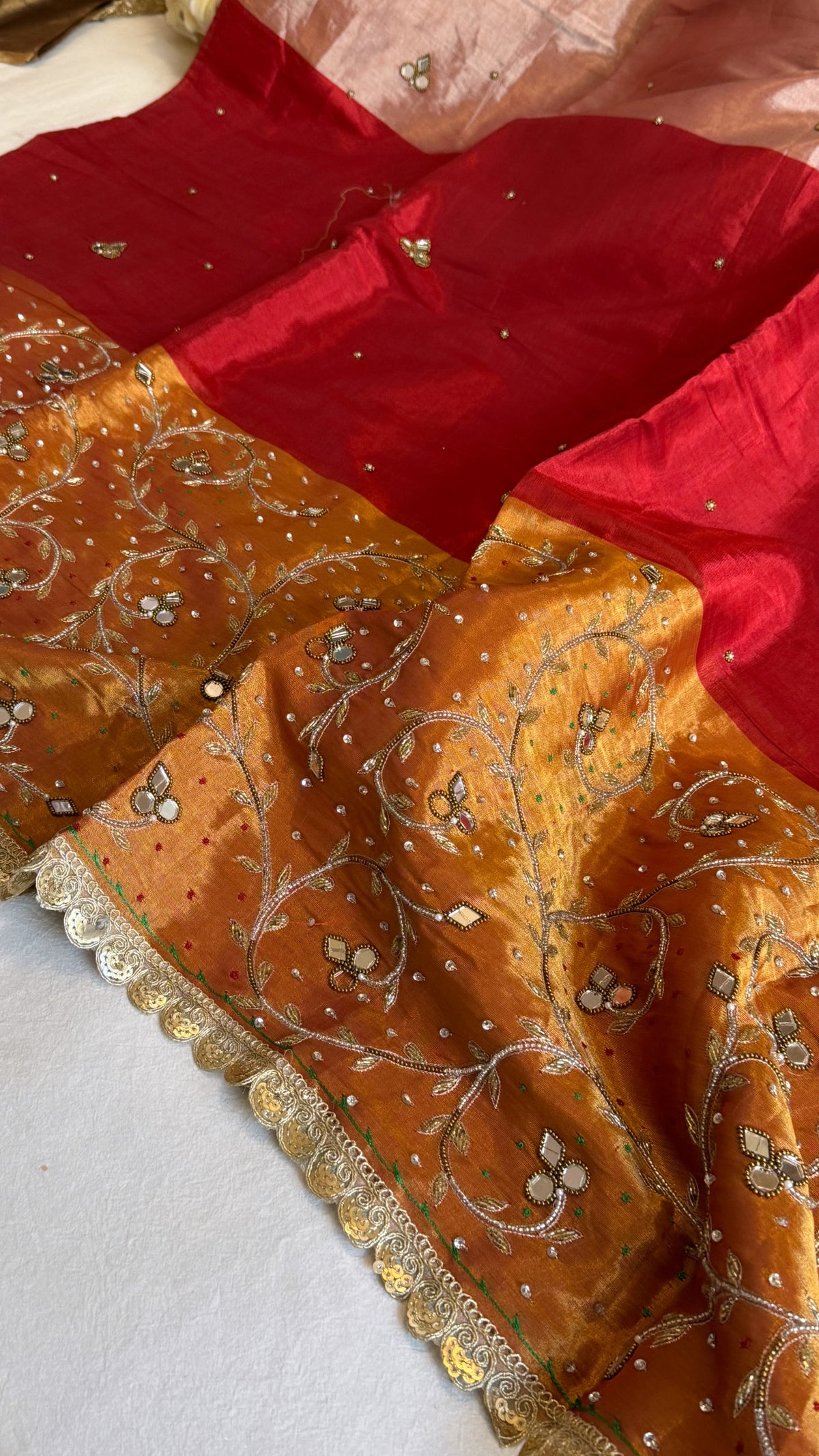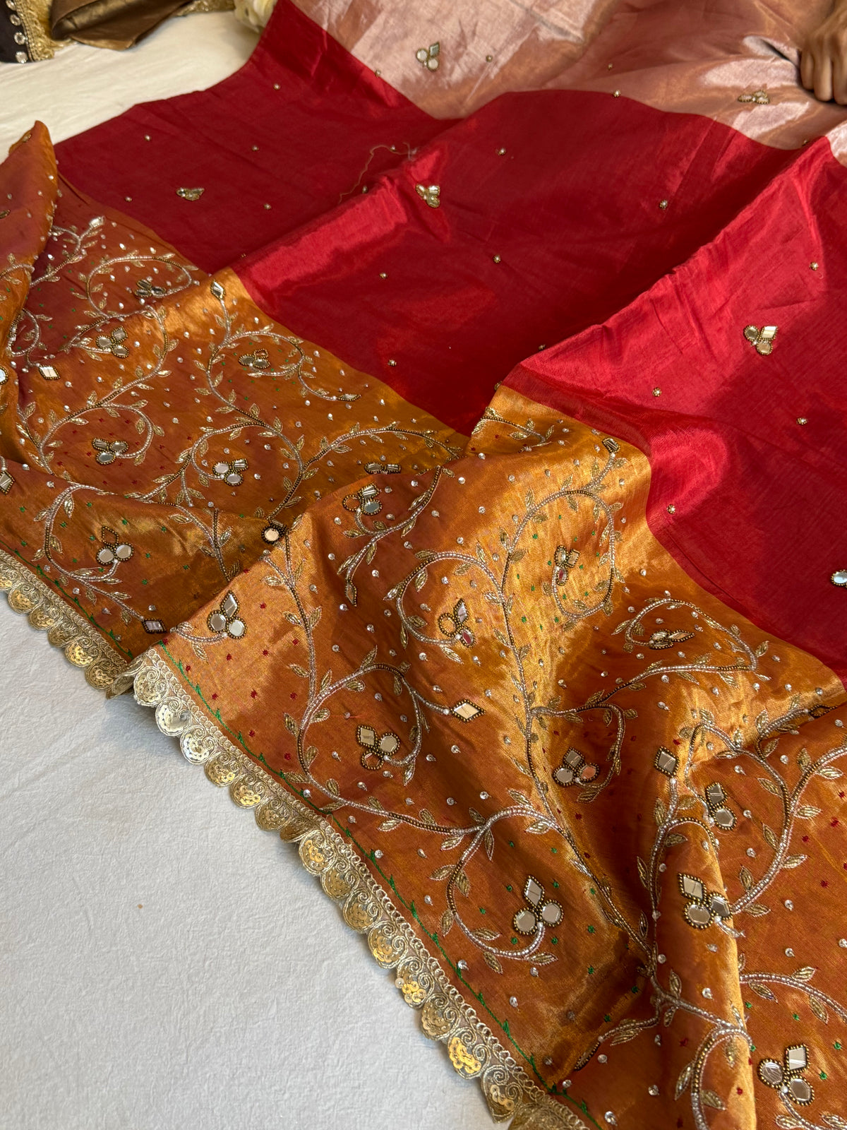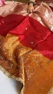 Satin tissue silk multicoloured metallic red-gold weaving hand embroidered kadhwa saree