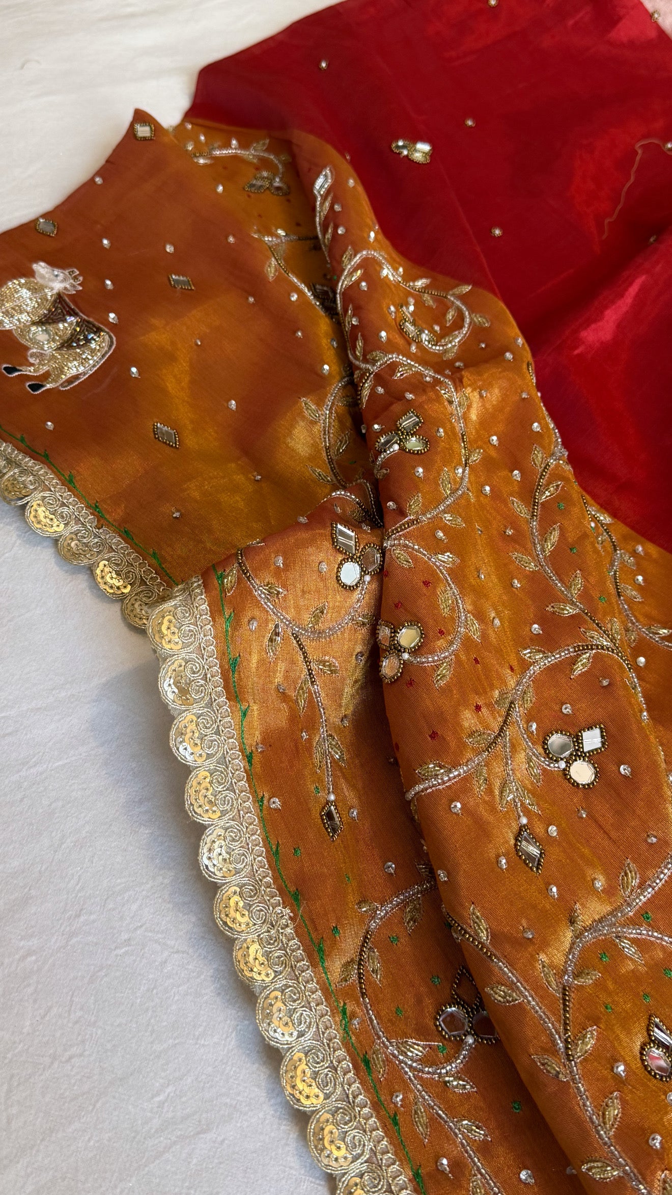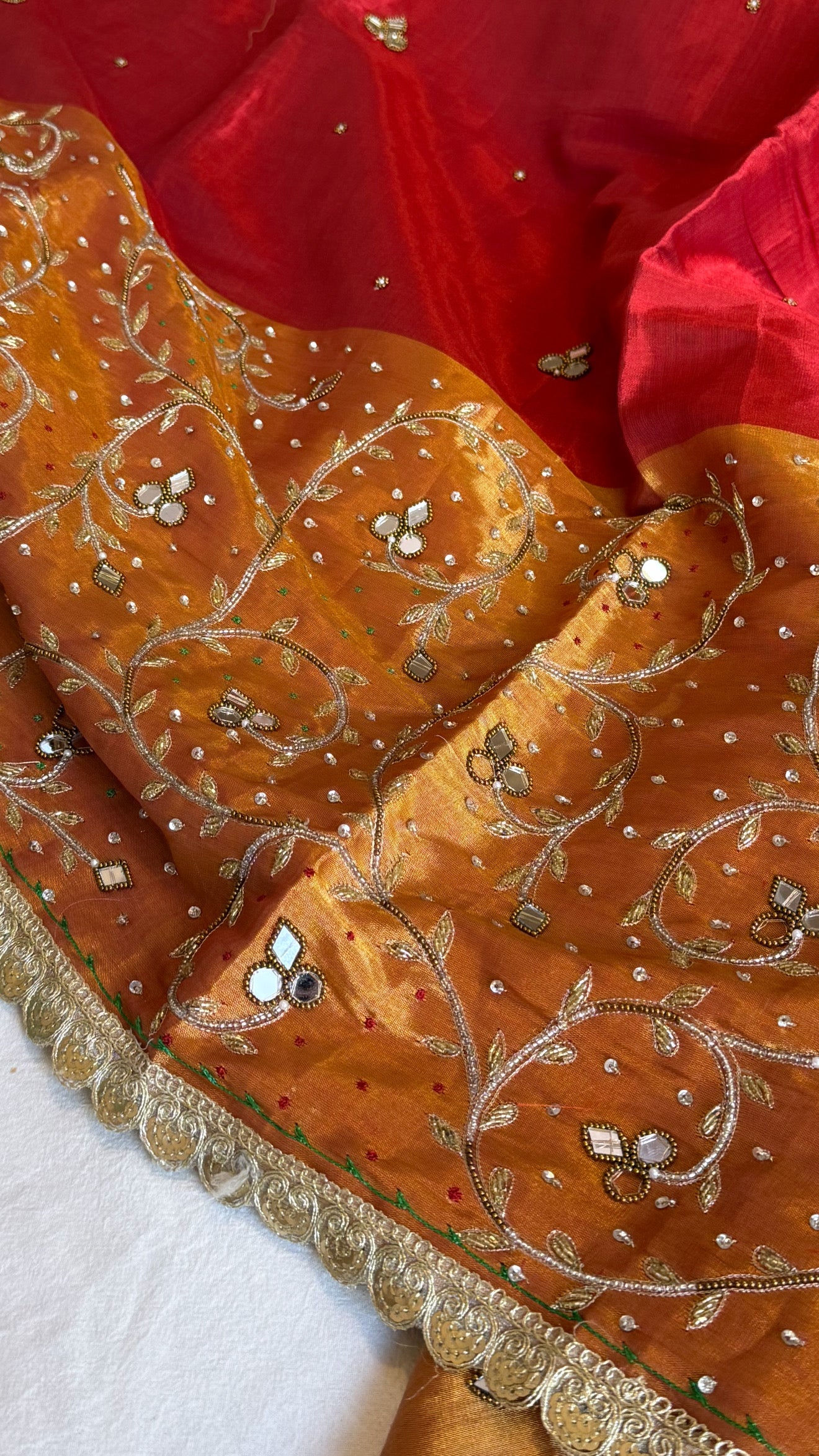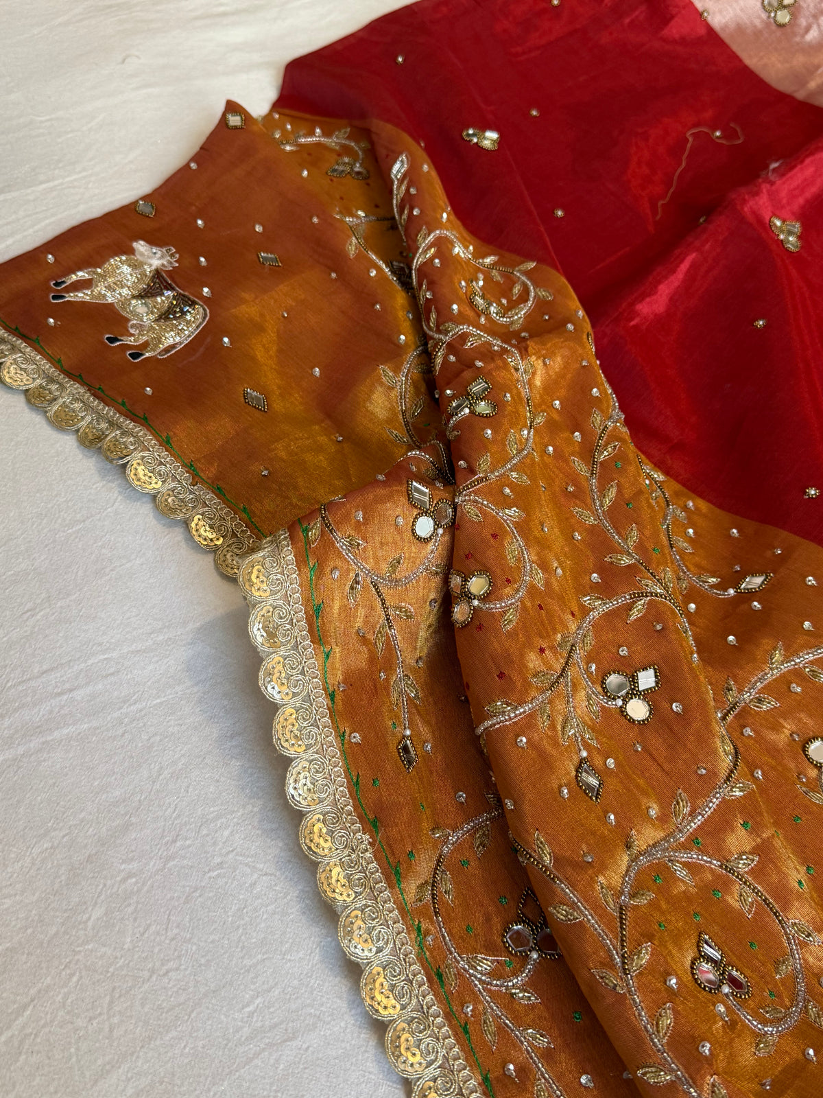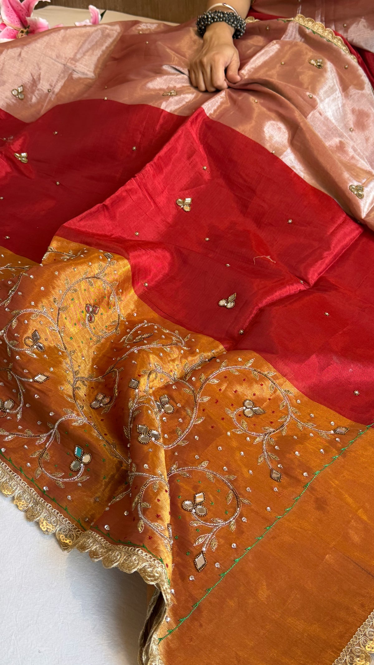 Satin tissue silk multicoloured metallic red-gold weaving hand embroidered kadhwa saree