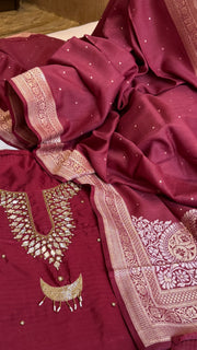 Sheesham maroon mirror work katan silk kadhwa hand embroidered suit set