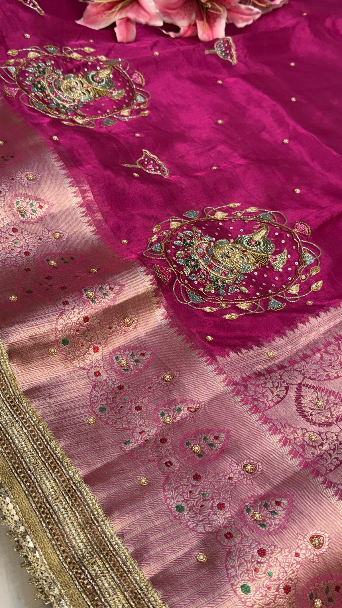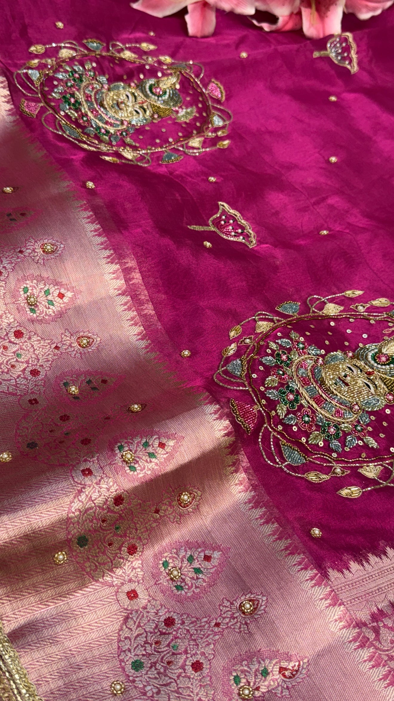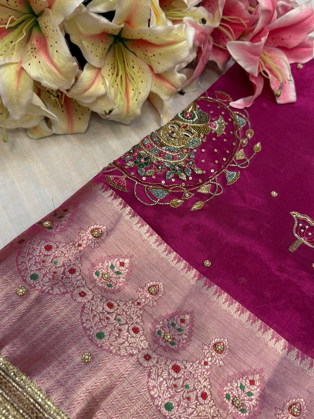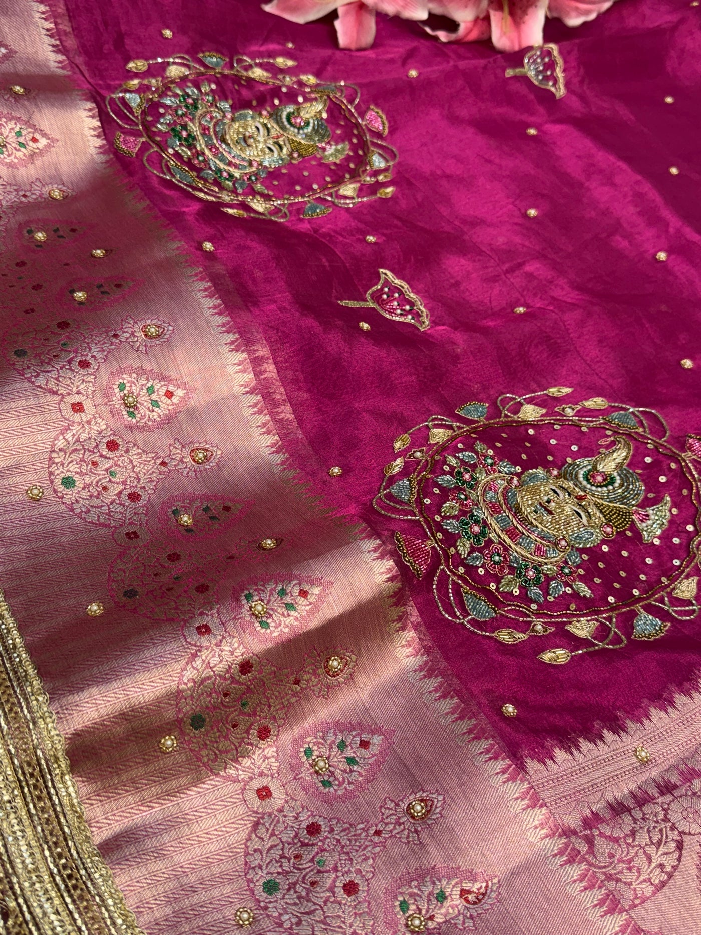 Shreenathji motif - Hot metallic pink tissue silk hand embroidered kadhwa saree