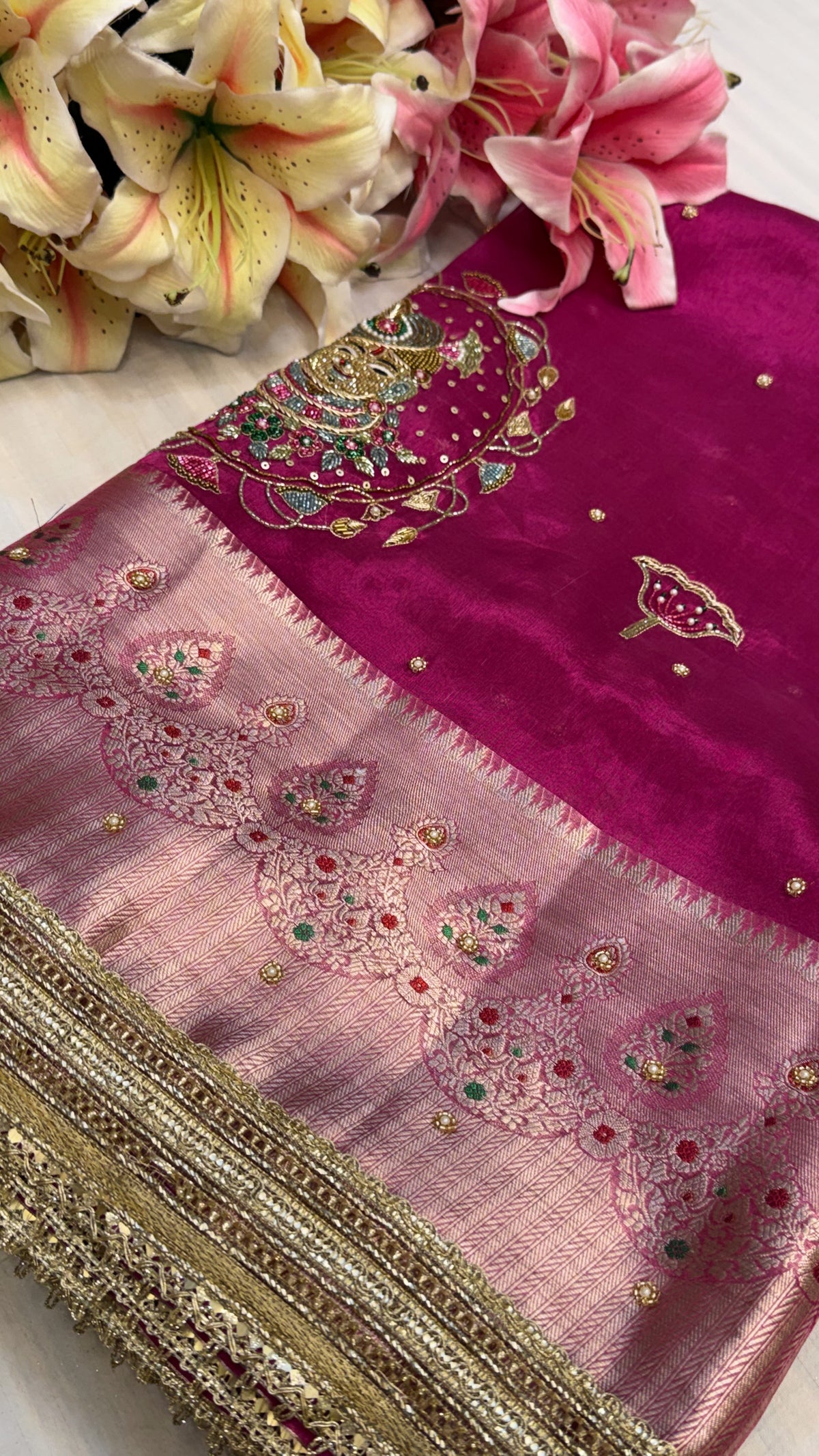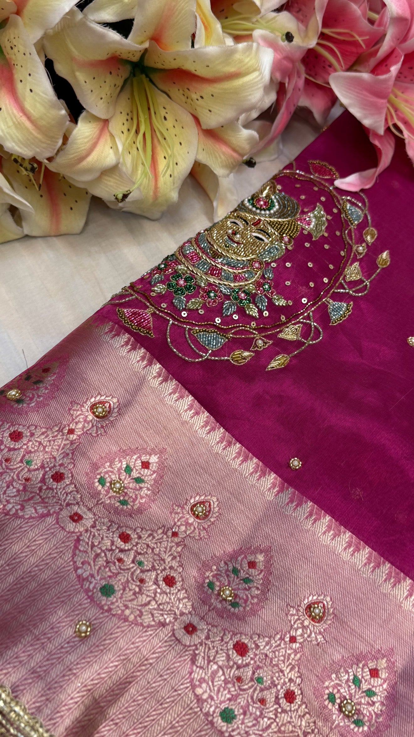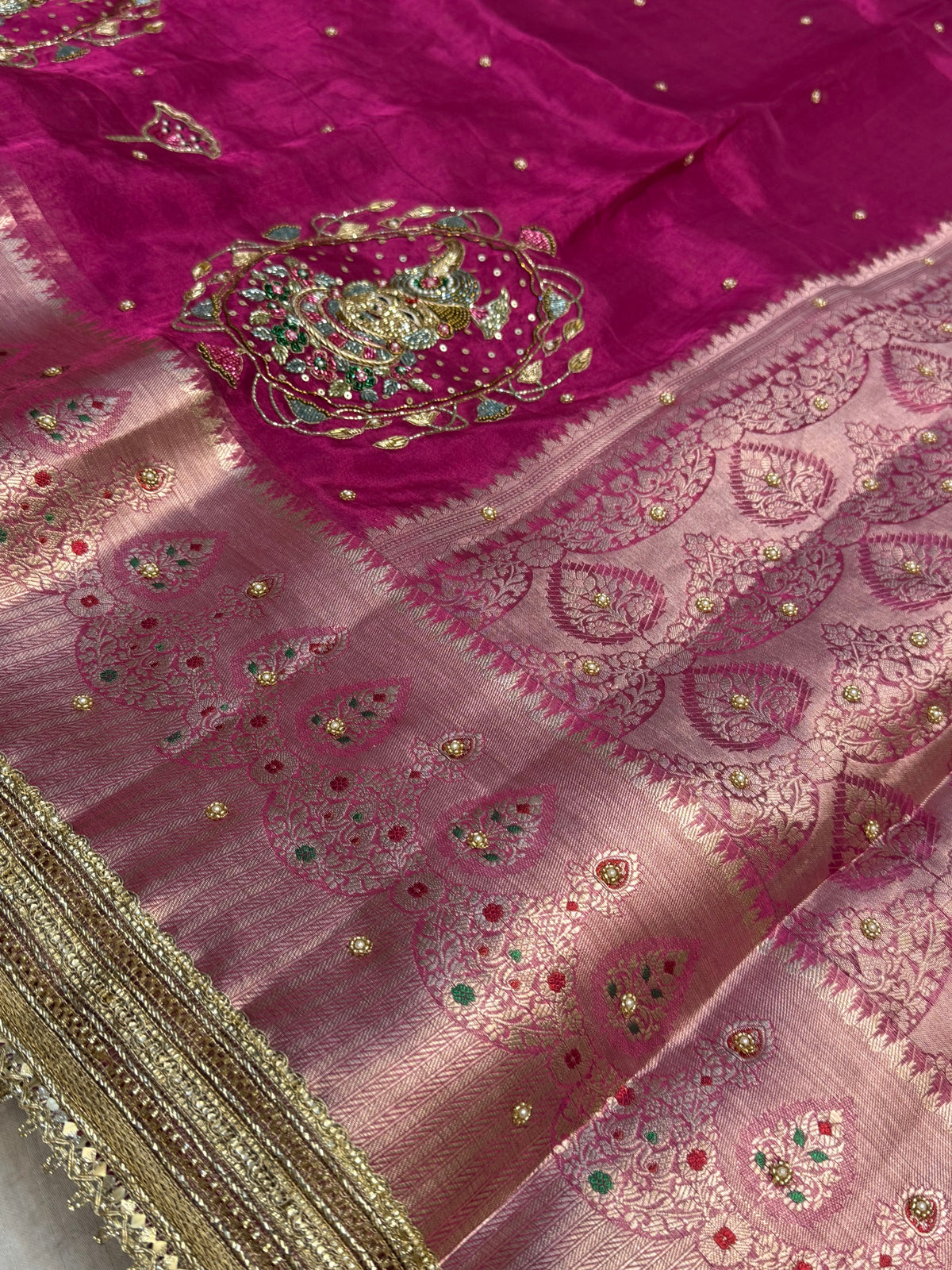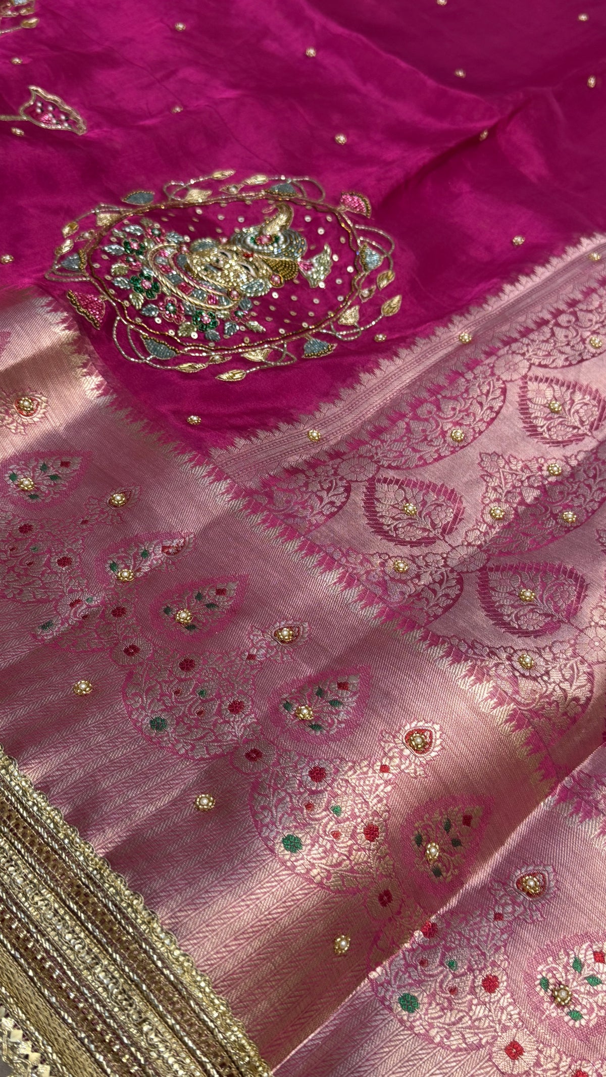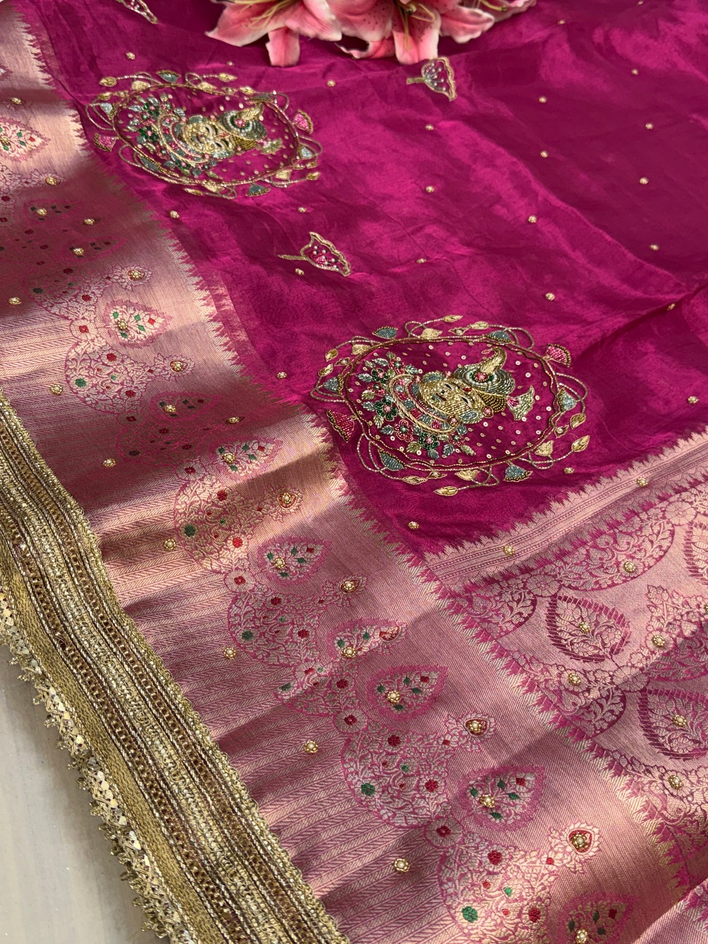 Shreenathji motif - Hot metallic pink tissue silk hand embroidered kadhwa saree