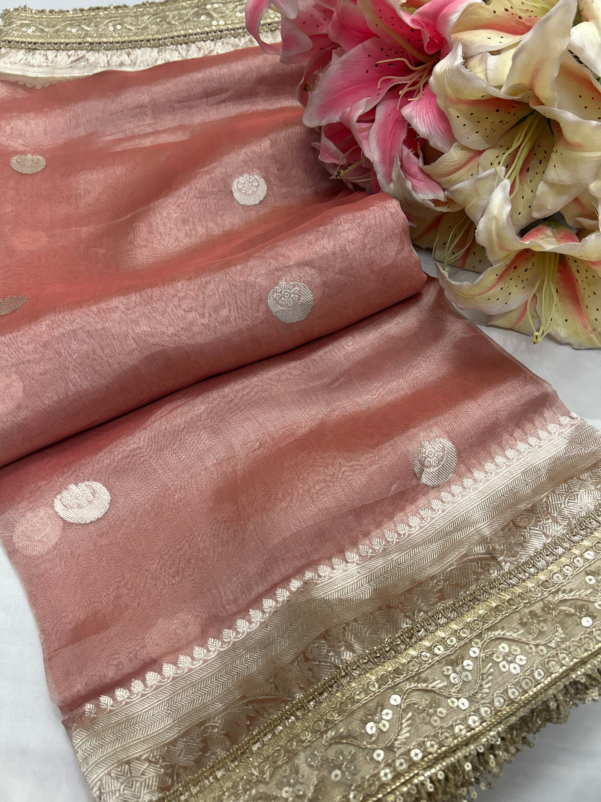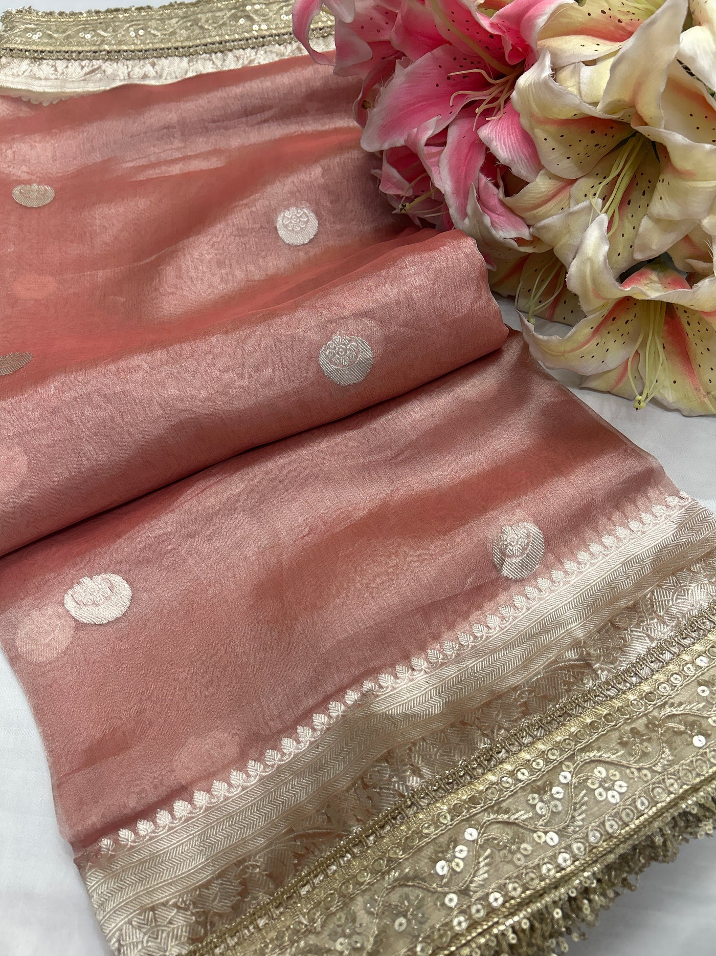 Tissue silk chand buta contrast border saree