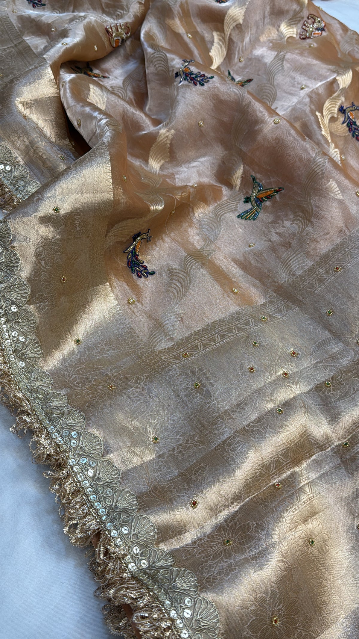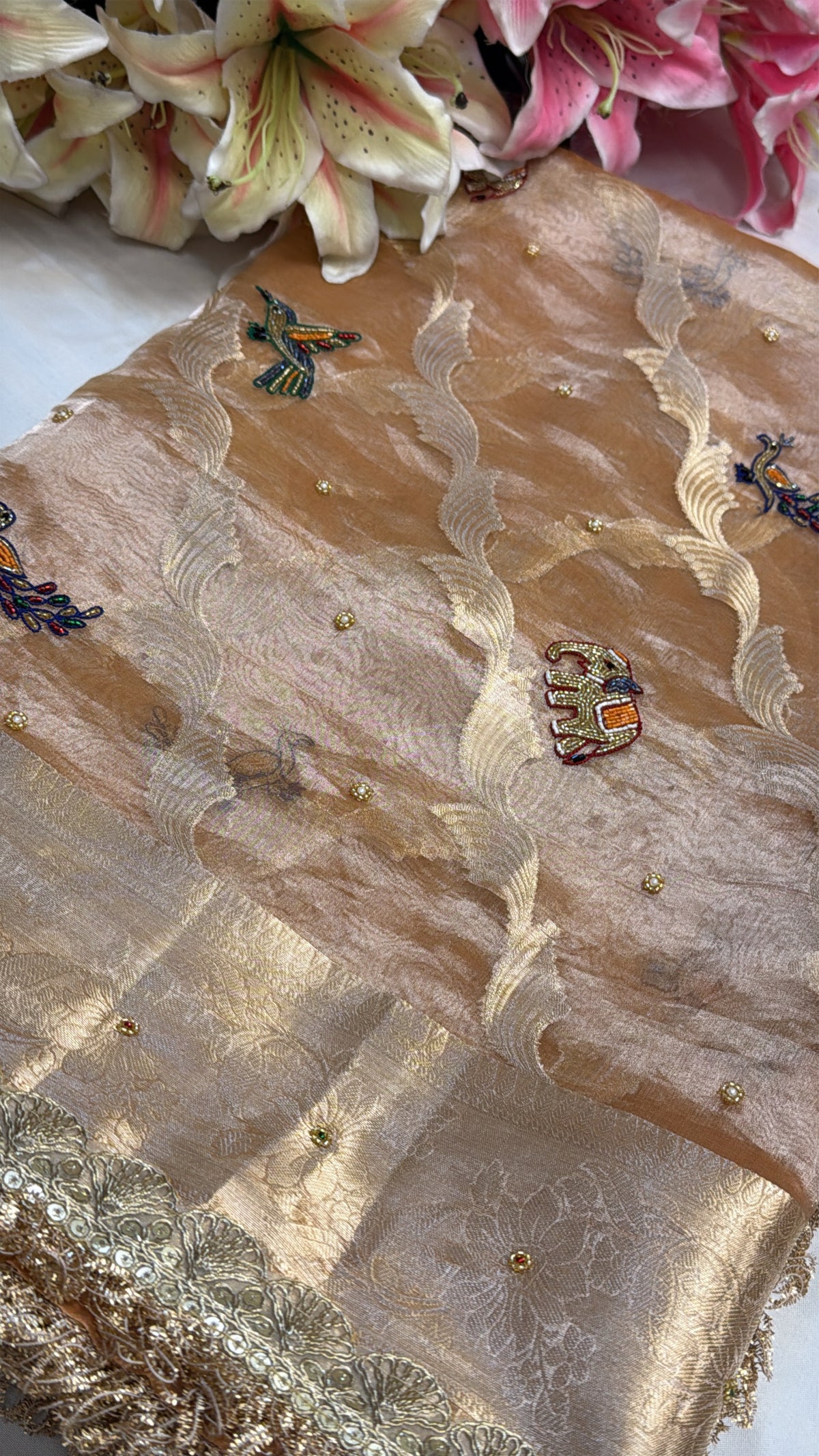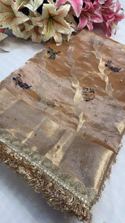 Tussar gold tissue silk hand embroidered kadhwa hand embroidered saree